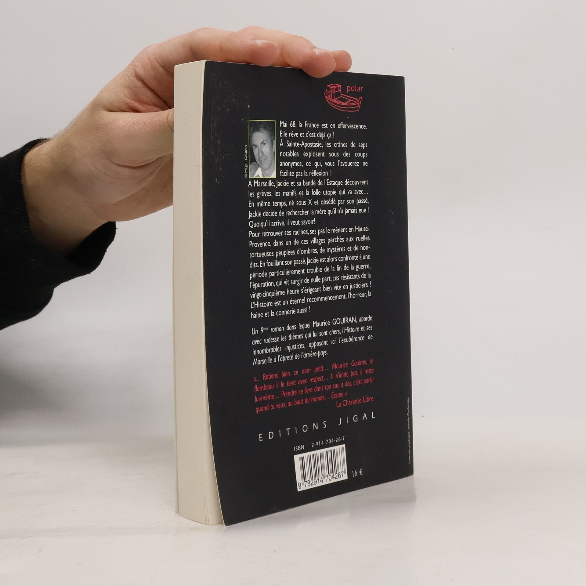 Mai 68, la France est en effervescence. Elle rêve et c'est déjà ça ! A Sainte-Apostasie, les crânes de sept notables explosent sous des coups anonymes, ce qui, vous l'avouerez ne facilite pas la réflexion ! A Marseille, Jackie et sa bande de l'Estaque découvrent les grèves, les manifs et la folle utopie qui va avec... En même temps, né sous X et obsédé par son passé, Jackie décide de rechercher la mère qu'il n'a jamais eue ! Quoiqu'il arrive, il veut savoir! Pour retrouver ses racines, ses pas le mènent en Haute-Provence, dans un de ces villages perchés aux ruelles tortueuses peuplées d'ombres, de mystères et de non-dits. En fouillant son passé, Jackie est alors confronté à une période particulièrement trouble de la fin de la guerre, l'épuration, qui vit surgir de nulle part, ces résistants de la vingt-cinquième heure s'érigeant bien vite en justiciers ! L'Histoire est un éternel recommencement, l'horreur, la haine et la connerie aussi ! Un 9e roman dans lequel Maurice Gouiran, aborde avec rudesse les thèmes qui lui sont chers, l'Histoire et ses innombrables injustices, opposant ici l'exubérance de Marseille à l'âpreté de l'arrière-pays.
