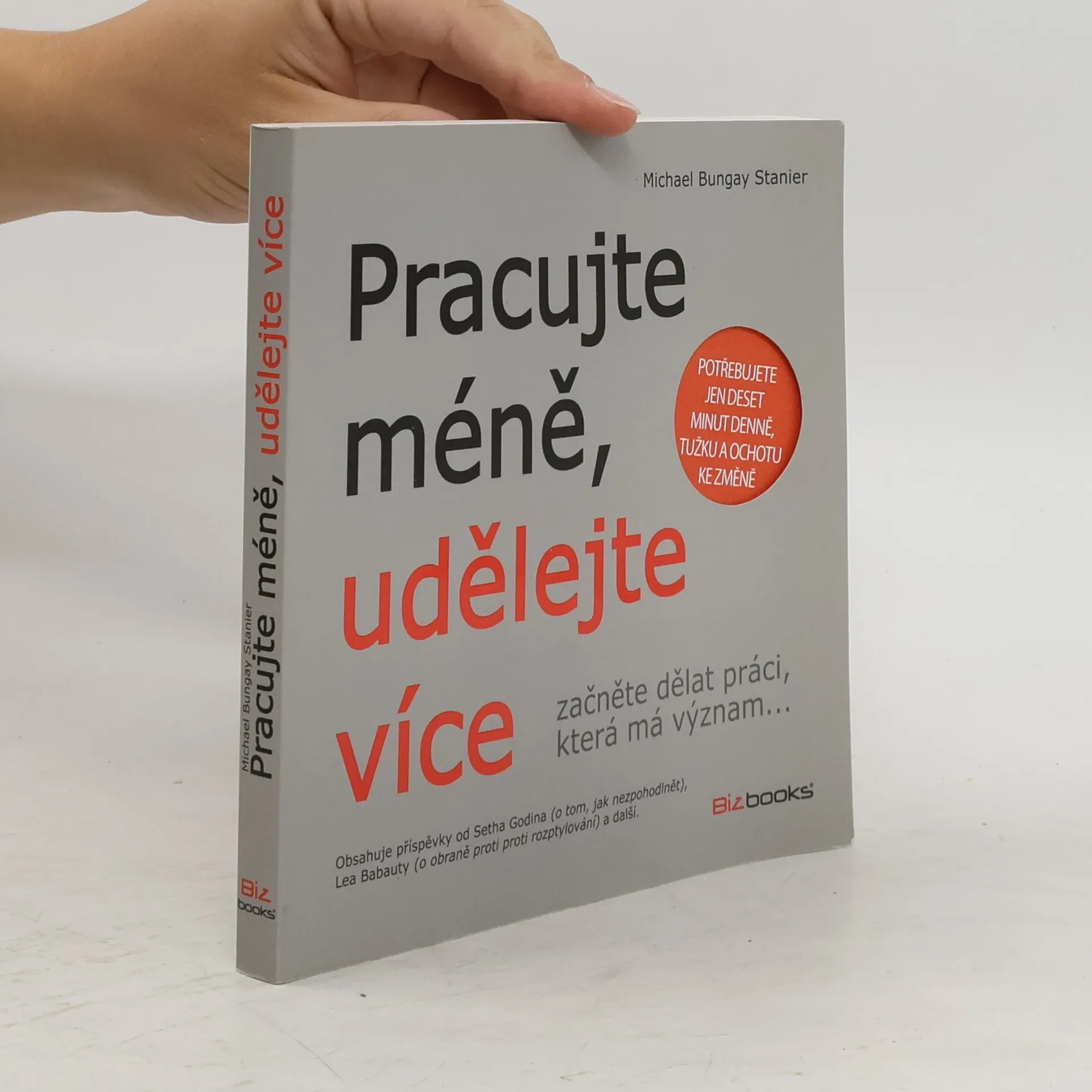 Vše, co děláme, spadá do třech kategorií – špatná práce, dobrá práce, skvělá práce. Skvělá práce je to, co naplňuje náš život a činí ho smysluplným, je to práce, kvůli které stojí za to žít. Kniha nabízí soubor metod, které můžeme v každodenním životě použít ke zlepšení svého zaměření na činnosti, které spadají do „skvělé práce“, jak v profesionálním, tak osobním životě. Praktická a inspirativní kniha. Vězíte až po uši v práci, která sestává z vyřizování e-mailů, zvedání telefonu a chození na schůze a štvete se do úmoru, abyste konečně dokončili projekt. Kdy se ale spěch stal měřítkem úspěchu? Začněte dělat práci, která má význam. Kniha Pracujte méně, udělejte více ukazuje, jak můžete konečně dělat více takové práce, která má opravdu význam, která vás baví, při které využíváte své schopnosti a napínáte své síly, práci, na které záleží. Obsahuje 15 cvičení, „map“ – ty představují dokonale jednoduché vizuální pomůcky, které vám pomohou najít, začít a udržet si Skvělou práci a odhalí vám, jak: - najít klíče k vlastní Skvělé práci – jsou všude kolem vás - rychle přicházet s novými nápady a možnostmi - nejlépe zvládat záplavu práce - využít vaši vnitřní odvahu Budete potřebovat jenom deset minut denně, tužku, a ochotu ke změně. Kniha obsahuje jedinečné příspěvky od Setha Godina (o tom, jak nezpohodlnět), Davea a Wendy Ulrichových (o blahobytu), Lea Babauty (o tom, jak se nenechat vyrušit) a dalších.