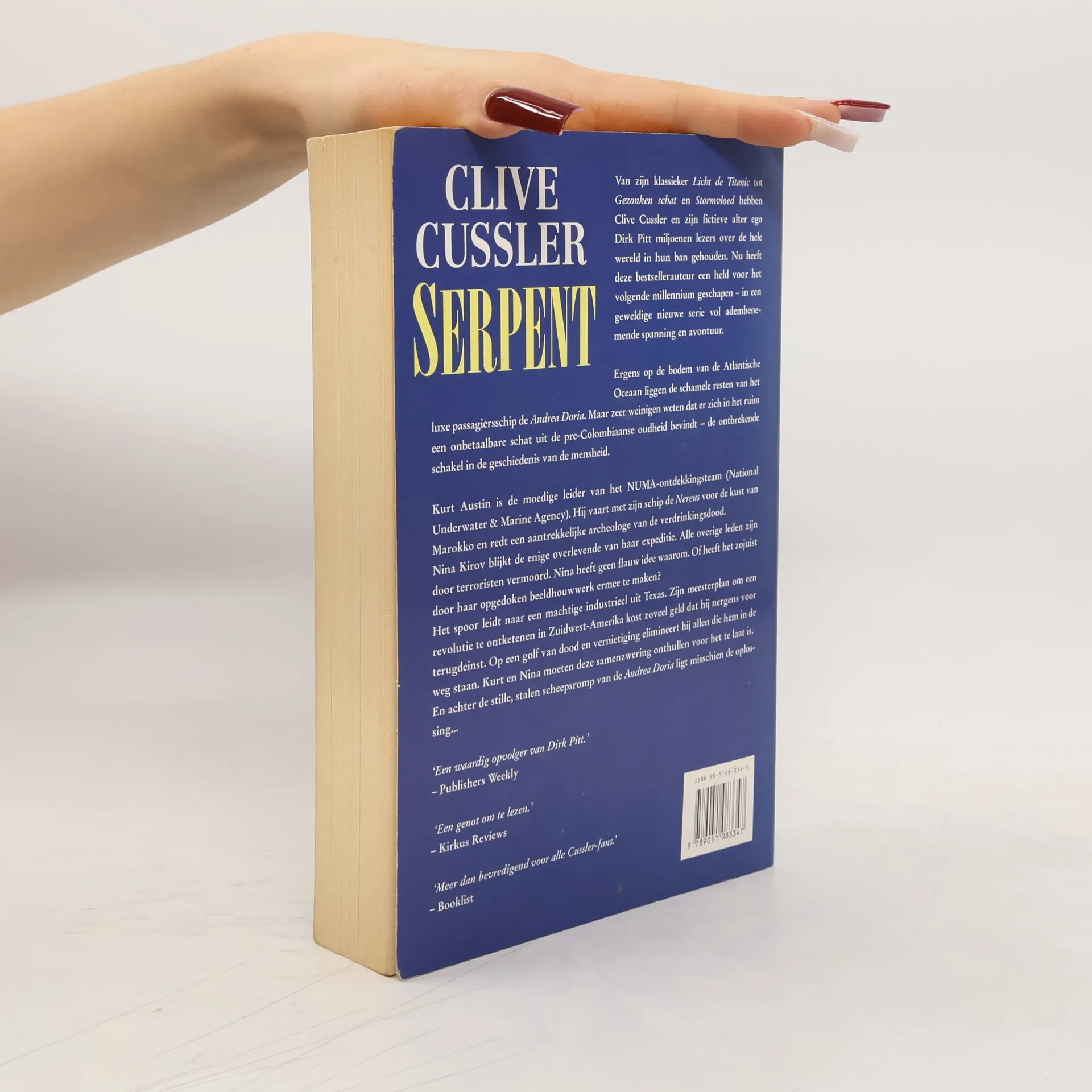 Van zijn klassieker Licht de Titanic tot Gezonken schat en Stormvloed hebben Clive Cussler en zijn fictieve alter ego Dirk Pitt miljoenen lezers over de hele wereld in hun ban gehouden. Nu heeft deze bestsellerauteur een held voor het volgende millennium geschapen - in een geweldige nieuwe serie vol adembenemende spanning en avontuur. Ergens op de bodem van de Atlantische Oceaan liggen de schamele resten van het luxe passagiersschip de Andrea Doria. Maar zeer weinigen weten dat er zich in het ruim een onbetaalbare schat uit de pre-Colombiaanse oudheid bevindt - de ontbrekende schakel in de geschiedenis van de mensheid. Kurt Austin is de moedige leider van het NUMA-ontdekkingsteam (National Underwater & Marine Agency. Hij vaart met zijn schip de Nereus voor de kust van Marokko en redt een aantrekkelijke archeologe van de verdrinkingsdood.Nina Kirov blijkt de enige overlevende van haar expeditie. Alle overige leden zijn door terroristen vermoord. Nina heeft geen flauw idee waarom. Of heeft het zojuist door haar opgedoken beeldhouwwerk ermee te maken? Het spoor leidt naar een machtige industrieel uit Texas. Zijn meesterplan om een revolutie te ontketenen in Zuidwest-Amerika kost zoveel geld dat hij nergens voor terugdeinst. Op een golf van dood en vernietiging elimineert hij allen die hem in de weg staan. Kurt en Nina moeten deze samenzwering onthullen voor het te laat is.En achter de stille, stalen scheepsromp van de Andrea Doria ligt misschien de oplossing...