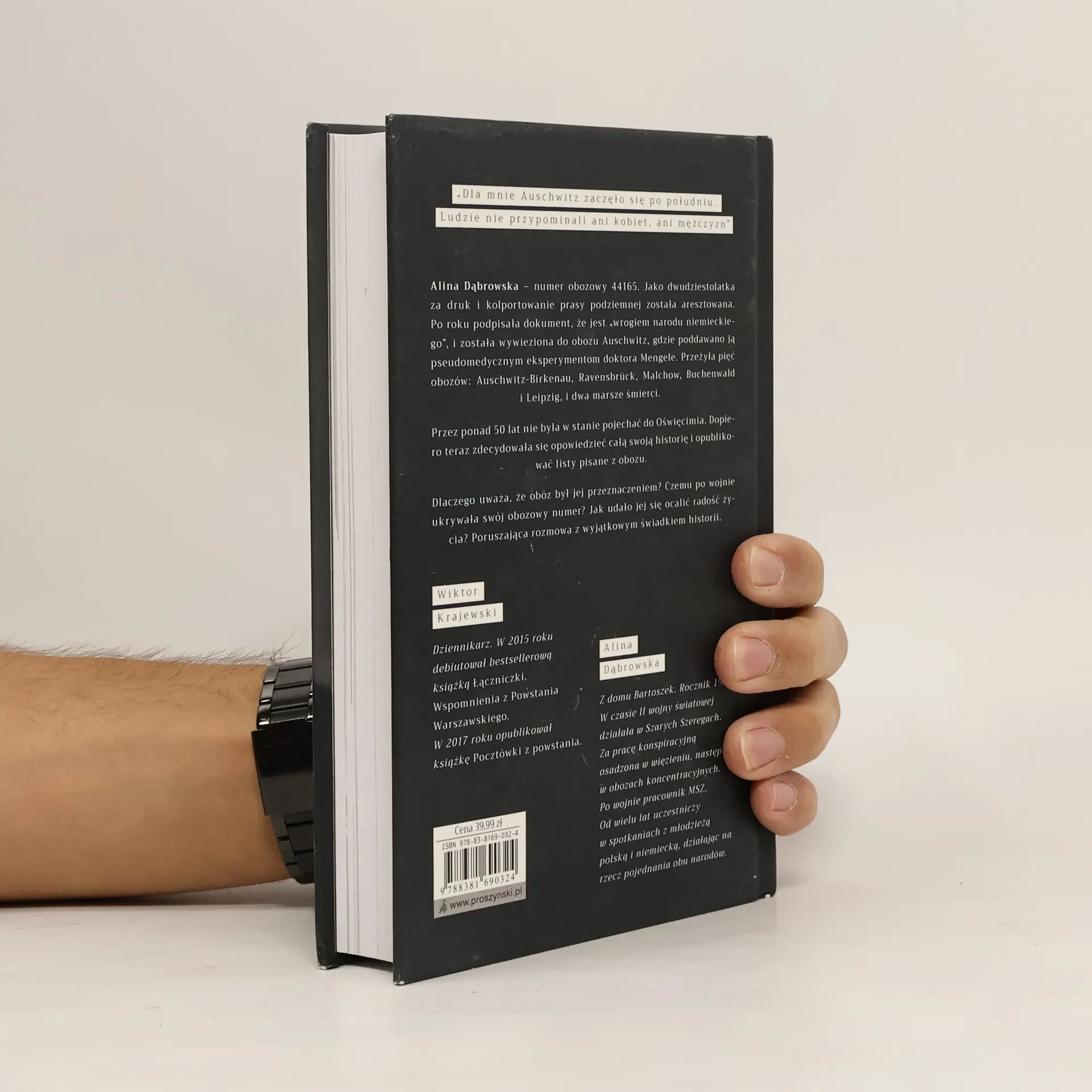 Dla mnie Auschwitz zaczęło się po południu. Ludzie nie przypominali ani kobiet, ani mężczyzn.Alina Dąbrowska - numer obozowy 44165. Jako dwudziestolatka za druk i kolportowanie prasy podziemnej została aresztowana. Po roku podpisała dokument, że jest wrogiem narodu niemieckiego, i została wywieziona do obozu Auschwitz, gdzie poddawano ją pseudomedycznym eksperymentom doktora Mengele. Przeżyła pięć oboz�w: Auschwitz-Birkenau, Ravensbr�ck, Malchow, Buchenwald i Leipzig, i dwa marsze śmierci.Przez ponad 50 lat nie była w stanie pojechać do Oświęcimia. Dopiero teraz zdecydowała się opowiedzieć całą swoją historię i opublikować listy pisane z obozu.Dlaczego uważa, że ob�z był jej przeznaczeniem? Czemu po wojnie ukrywała sw�j obozowy numer? Jak udało jej się ocalić radość życia?Poruszająca rozmowa z wyjątkowym świadkiem historii.Alina Dąbrowska - z domu Bartoszek. Rocznik 1923. W czasie II wojny światowej działała w Szarych Szeregach. Za pracę konspiracyjną osadzona w więzieniu, następnie w obozach koncentracyjnych. Po wojnie pracowała w MSZ. Od wielu lat uczestniczy w spotkaniach z młodzieżą polską i niemiecką, działając na rzecz pojednania obu narod�w.Wiktor Krajewski - dziennikarz. W 2015 roku debiutował bestsellerową książką Łączniczki. Wspomnienia z Powstania Warszawskiego. W 2017 roku opublikował książkę Poczt�wki z powstania.