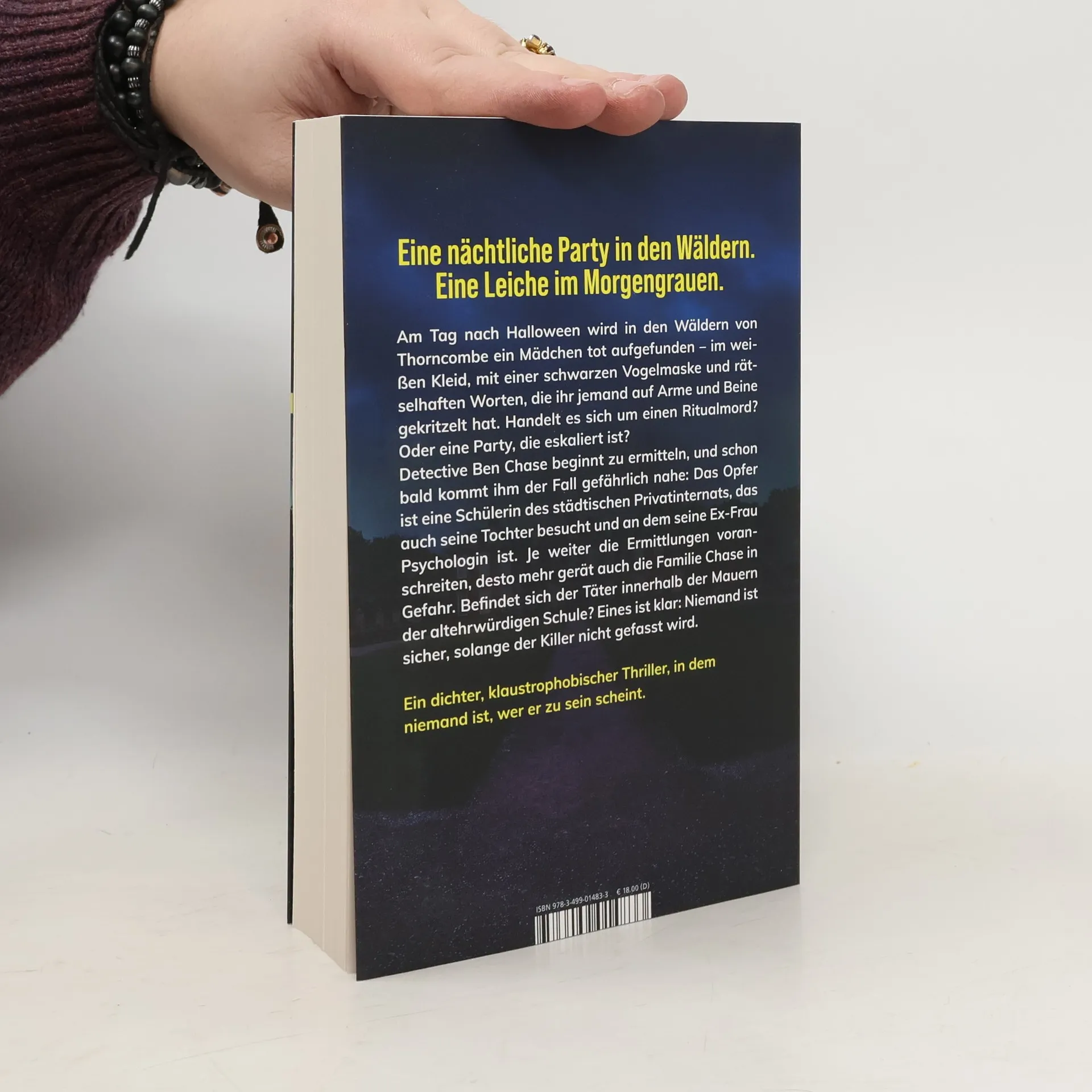 Eine Nacht in den Wäldern. Eine Party, die aus dem Ruder läuft. Eine Leiche im Morgengrauen. Am Tag nach Halloween wird in den Wäldern von Thorncombe ein Mädchen tot aufgefunden - im weißen Kleid, mit einer schwarzen Vogelmaske und rätselhaften Worten, die ihr jemand auf Arme und Beine gekritzelt hat. Handelt es sich um einen Ritualmord? Oder eine Party, die eskaliert ist? Detective Ben Chase beginnt zu ermitteln, und schon bald kommt ihm der Fall gefährlich nahe: Das Opfer ist eine Schülerin des städtischen Privatinternats, das auch seine Tochter besucht und an dem seine Ex-Frau Vertrauenslehrerin ist. Je weiter die Ermittlungen voranschreiten, desto mehr gerät auch die Familie Chase in Gefahr. Befindet sich der Täter innerhalb der Mauern der altehrwürdigen Schule? Eines ist klar: Niemand ist sicher, solange der Killer nicht gefasst wird.