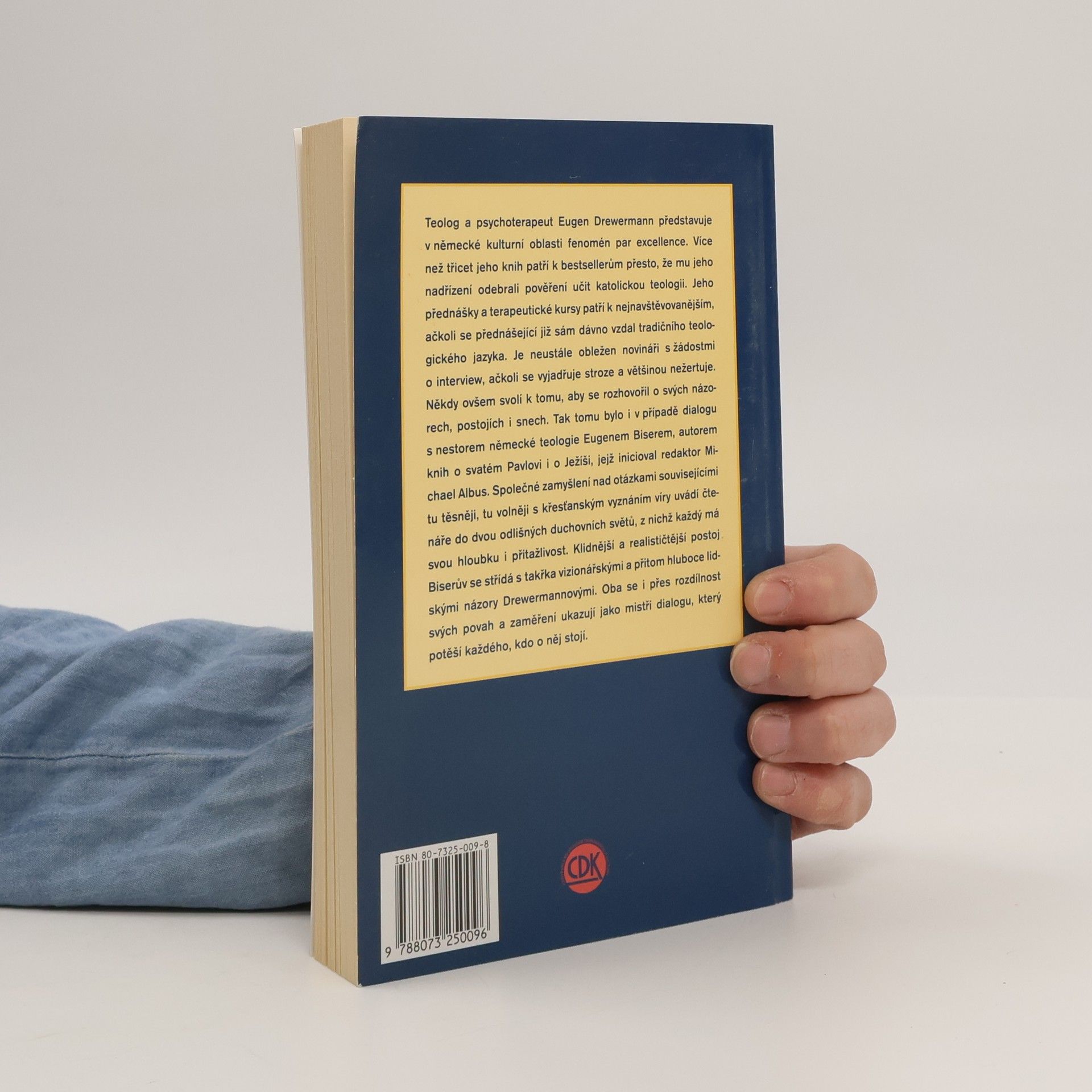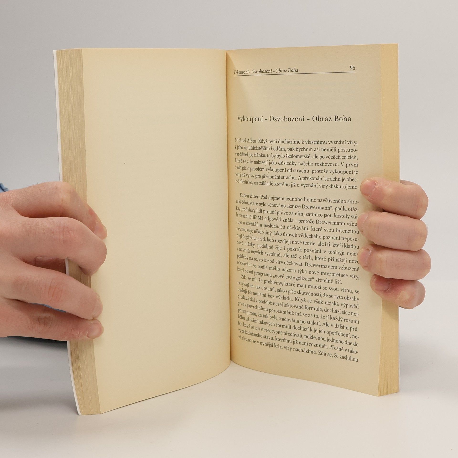 Kniha rozhovorů dvou předních německých teologů představujících dva rozdílné pohledy na křesťanskou víru a roli církve. Teolog a psychoterapeut Eugen Drewermann představuje v německé kulturní oblasti fenomén par excellence. Více než třicet jeho knih patří k bestsellerům přesto, že mu jeho nadřízení odebrali pověření učit katolickou teologii. Jeho přednášky a terapeutické kursy patří k nejnavštěvovanějším, ačkoli se přednášející již sám dávno vzdal tradičního teologického jazyka. Je neustále obležen novináři s žádostmi o interview, ačkoli se vyjadřuje stroze a většinou nežertuje. Někdy ovšem svolí k tomu, aby se rozhovořil o svých názorech, postojích i snech. Tak tomu bylo i v případě dialogu s nestorem německé teologie Eugenem Biserem, autorem knih o svatém Pavlovi i o Ježíši, jejž inicioval redaktor Michael Albus. Společné zamyšlení nad otázkami souvisejícími tu těsněji, tu volněji s křesťanským vyznáním víry uvádí čtenáře do dvou odlišných duchovních světů, z nichž každý má svou hloubku i přitažlivost. Klidnější a realističtější postoj Biserův se střídá s takřka vizionářskými a přitom hluboce lidskými názory Drewermannovými. Oba se i přes rozdílnost svých povah a zaměření ukazují jako mistři dialogu, který potěší každého, kdo o něj stojí.
