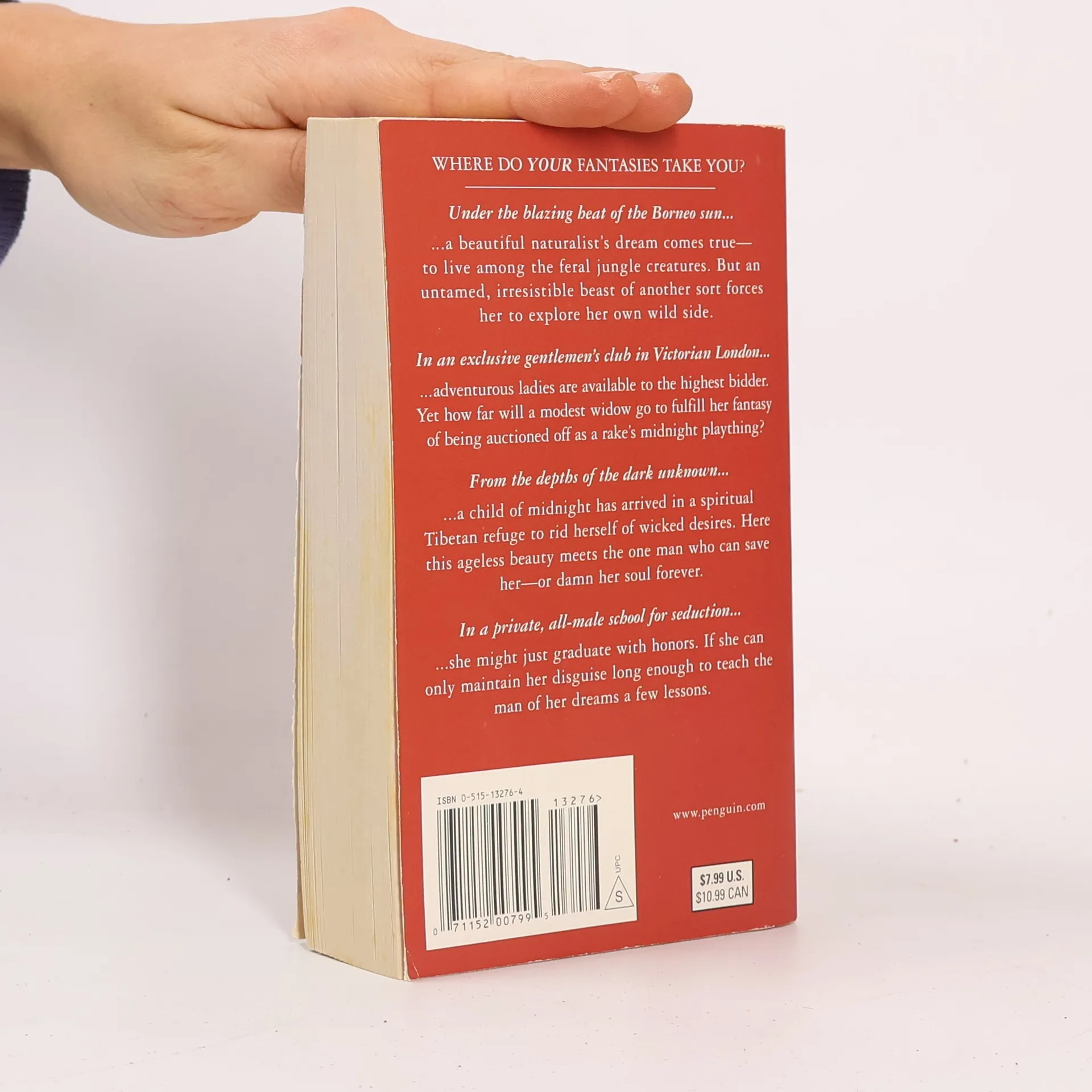 Indulge in your desires with this captivating collection from four top romance authors, including Christine Feehan. Experience wild adventures from a naturalist in Borneo to a Victorian widow at an auction, a mystical encounter in Tibet, and a woman's seduction lessons at a private school. Unleash your inhibitions!
