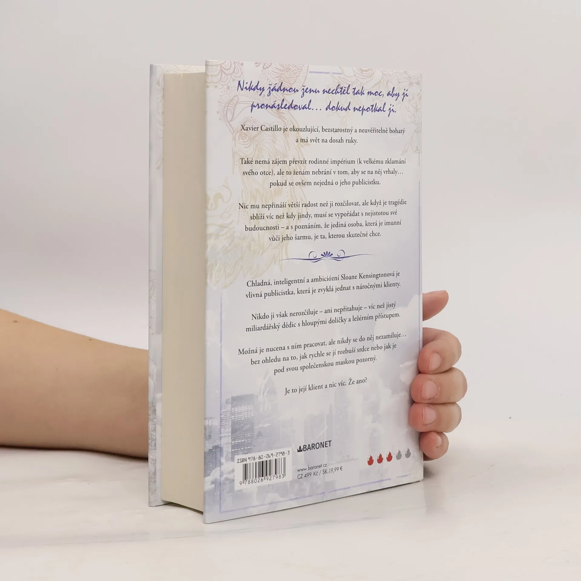 Xavier Castillo je okouzlující, bezstarostný a neuvěřitelně bohatý a má svět na dosah ruky. Také nemá zájem převzít rodinné impérium (k velkému zklamání svého otce), ale to ženám nebrání v tom, aby se na něj vrhaly... pokud se ovšem nejedná o jeho publicistku. Nic mu nepřináší větší radost než ji rozčilovat, ale když je tragédie sblíží víc než kdy jindy, musí se vypořádat s nejistotou své budoucnosti – a s poznáním, že jediná osoba, která je imunní vůči jeho šarmu, je ta, kterou skutečně chce. *** Chladná, inteligentní a ambiciózní Sloane Kensingtonová je vlivná publicistka, která je zvyklá jednat s náročnými klienty. Nikdo ji však nerozčiluje – ani nepřitahuje – víc než jistý miliardářský dědic s hloupými dolíčky a ležérním přístupem. Možná je nucena s ním pracovat, ale nikdy se do něj nezamiluje... bez ohledu na to, jak rychle se jí rozbuší srdce nebo jak je pod svou společenskou maskou pozorný. Je to její klient a nic víc. Že ano?