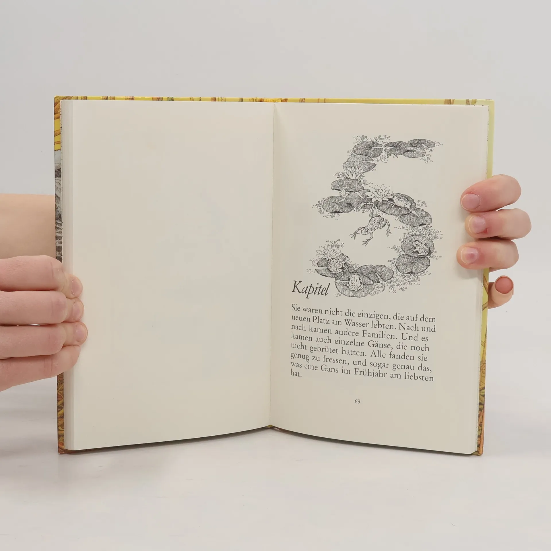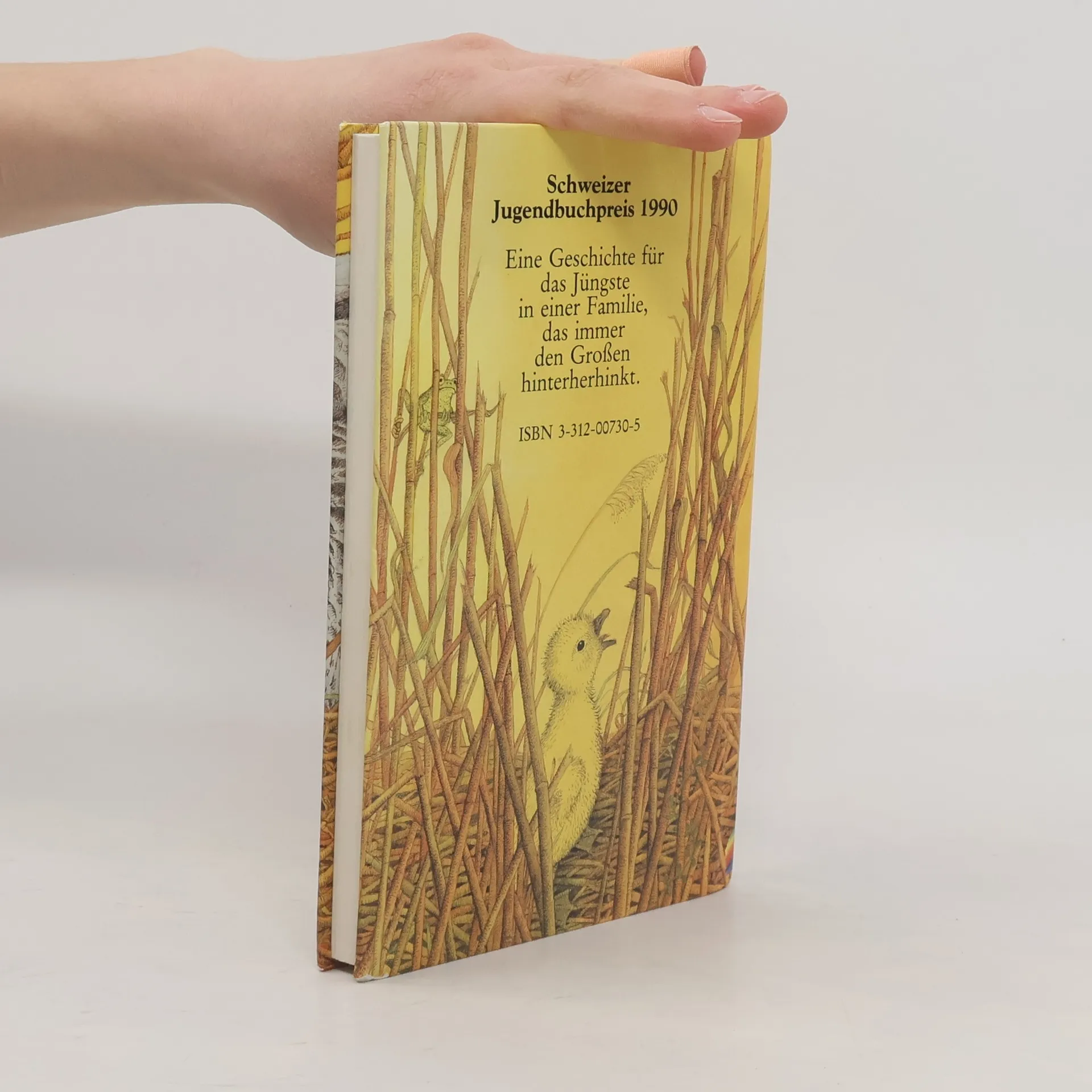 Die kleine Gans, als letztes von sechs Gänsekindern aus dem Ei gekommen, bleibt auch beim Laufen-, Schwimmen- und Fliegenlernen die Letzte.