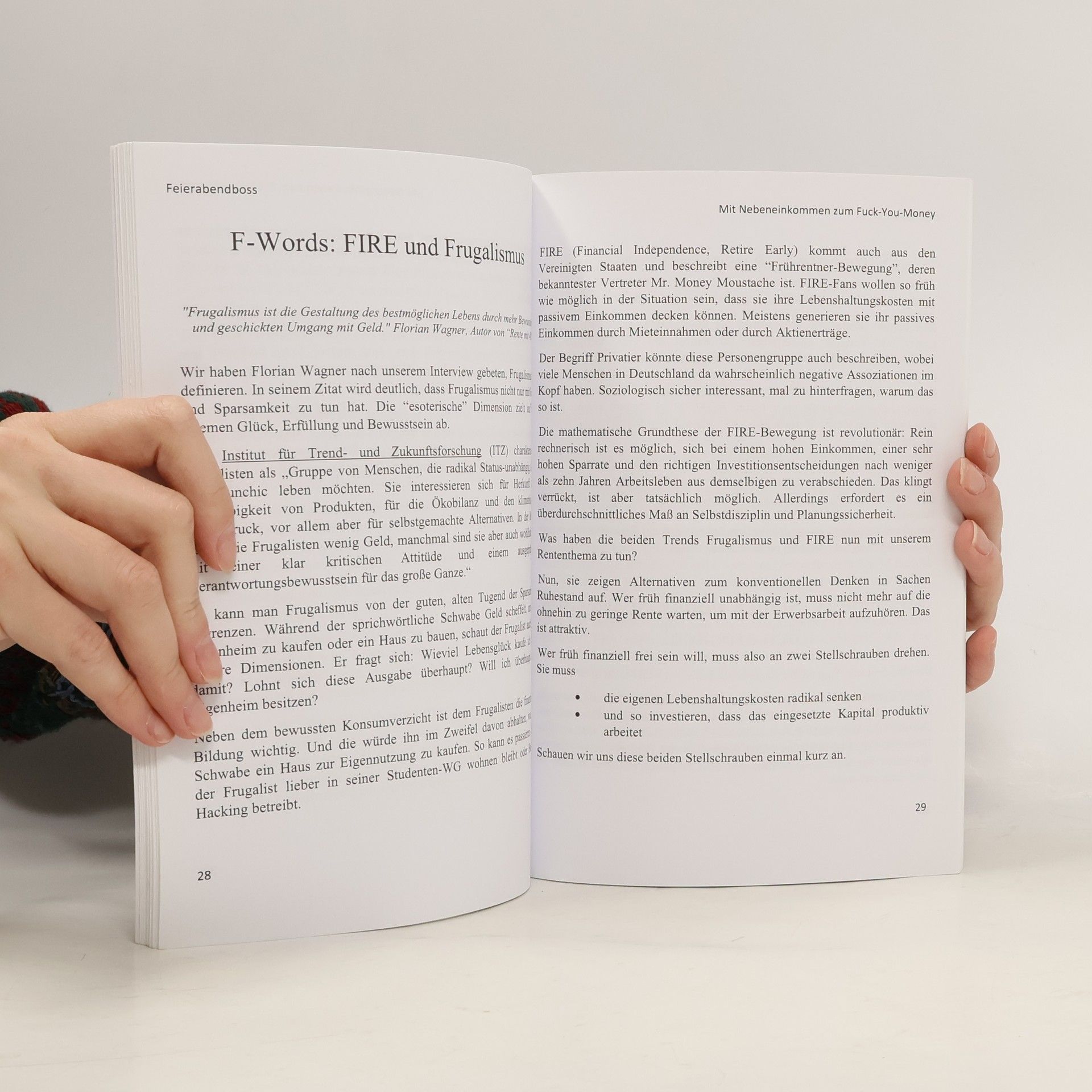 Wenn Du mit dem Gedanken spielst, dich nebenberuflich selbständig zu machen, ist dieses Buch deine Goldgrube.Vielleicht fragst Du dich, warum Du überhaupt ein Nebeneinkommen an den Start bringen solltest.Kannst Du mit Überzeugung Am Ende des Geldes ist kein Monat mehr übrig? Fliegt dir ein Strahlen aufs Gesicht, wenn Du im Juli deinen Rentenbescheid bekommst? Bist Du dir ganz sicher, dass dein Job auch im nächsten Jahr noch da ist? Bist Du dir sicher, dass dein Job von der nächsten Pandemie verschont bleibt?In der Finanzwelt ist Diversifikation schon lange ein Rezept gegen den Totalverlust. Wer investiert, versucht in der Regel, nicht alle Eier in einen Korb zu legen. Warum machen wir das beim Einkommen so, ohne auch nur mit der Wimper zu zucken? Sind wir alle Zocker? Oder wiegen wir uns in einer falschen Sicherheit?Nebeneinkommen sind der realistischste Weg, sein Einkommen zu diversifizieren. Wer mehrere Einkommensströme aufbaut, reduziert mit jedem Tag seine Abhängigkeit vom Hauptjob. Diese Unabhängigkeit von einem Arbeitgeber ist der einzige Weg, unabhängig zu leben. Es ist dein F*ck-You-Money!Dein Chef will dich nach Wermelskirchen versetzen? Nee, lass mal!Die Organisation, für die Du arbeitest, hört deine guten Ideen nicht? Ich suche mir was neues!Dein Einsatz wird nicht belohnt, sondern beneidet? Ciao, ich bin dann mal weg!In diesem Buch zeigen Christian und Ruben vom Nein2Five-Podcast, warum das Schulsystem dir nicht helfen wird, finanzielle Unabhängigkeit zu erreichen. Sie beweisen dir im Detail, warum die staatliche Rente für die allermeisten nur ein Zuschuss zum Lebensunterhalt im Alter sein wird. Sie insistieren, dass Du einen Plan B brauchst und warum finanzielle Bildung der Schlüssel dazu ist.Im Mittelpunkt des Buches stehen 22 realistische Nebeneinkommen, die oft mit nur geringem Startkapital aufgebaut werden können. Die vorgestellten Ideen sind aufgeteilt nach Neigung und Persönlichkeitstyp und zu jedem Side Hustle gibt es handfeste, erste Schritte zur Umsetzung und teilweise auch Stories von erfolgreichen Side Hustlern.Lass dich inspirieren, selber Feierabendboss zu werden und beginne damit deine Reise in die finanzielle Unabhängigkeit!
