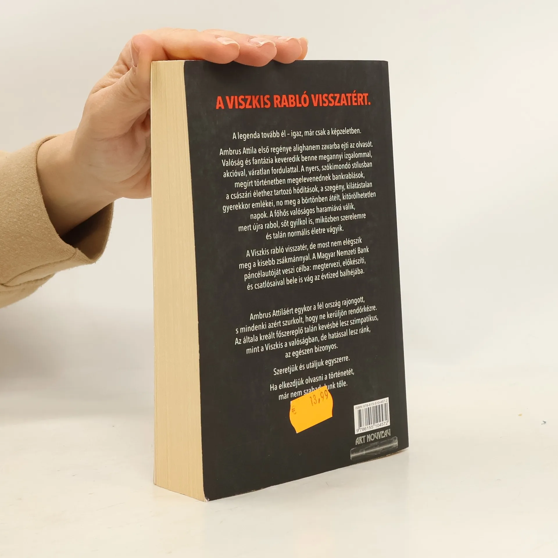 "A Viszkis rabló visszatért. A legenda tovább él - igaz, már csak a képzeletben. Ambrus Attila első regénye alighanem zavarba ejti az olvasót. Valóság és fantázia keveredik benne megannyi izgalommal, akcióval, váratlan fordulattal. A nyers, szókimondó stílusban megírt cselekményben megelevenednek bankrablások, a császári élethez tartozó hódítások, a szegény, kilátástalan gyerekkor emlékei, no meg a börtönben átélt, kitörölhetetlen napok. A főhős valóságos haramiává válik, mert újra rabol, sőt gyilkol is, miközben szerelemre és talán normális életre vágyik. A Viszkis rabló visszatér, de most nem elégszik meg a kisebb zsákmánnyal. A Magyar Nemzeti Bank páncélautóját veszi célba: megtervezi, előkészíti és csatlósaival bele is vág az évtized balhéjába. Ambrus Attiláért egykor a fél ország rajongott, s mindenki azért szurkolt, hogy ne kerüljön rendőrkézre. Az általa kreált főszereplő talán kevésbé lesz szimpatikus, mint a Viszkis a valóságban, de hatással lesz ránk, az egészen bizonyos. Szeretjük és utáljuk egyszerre. Ha elkezdjük olvasni a történetét, már nem szabadulunk tőle." -- cover.