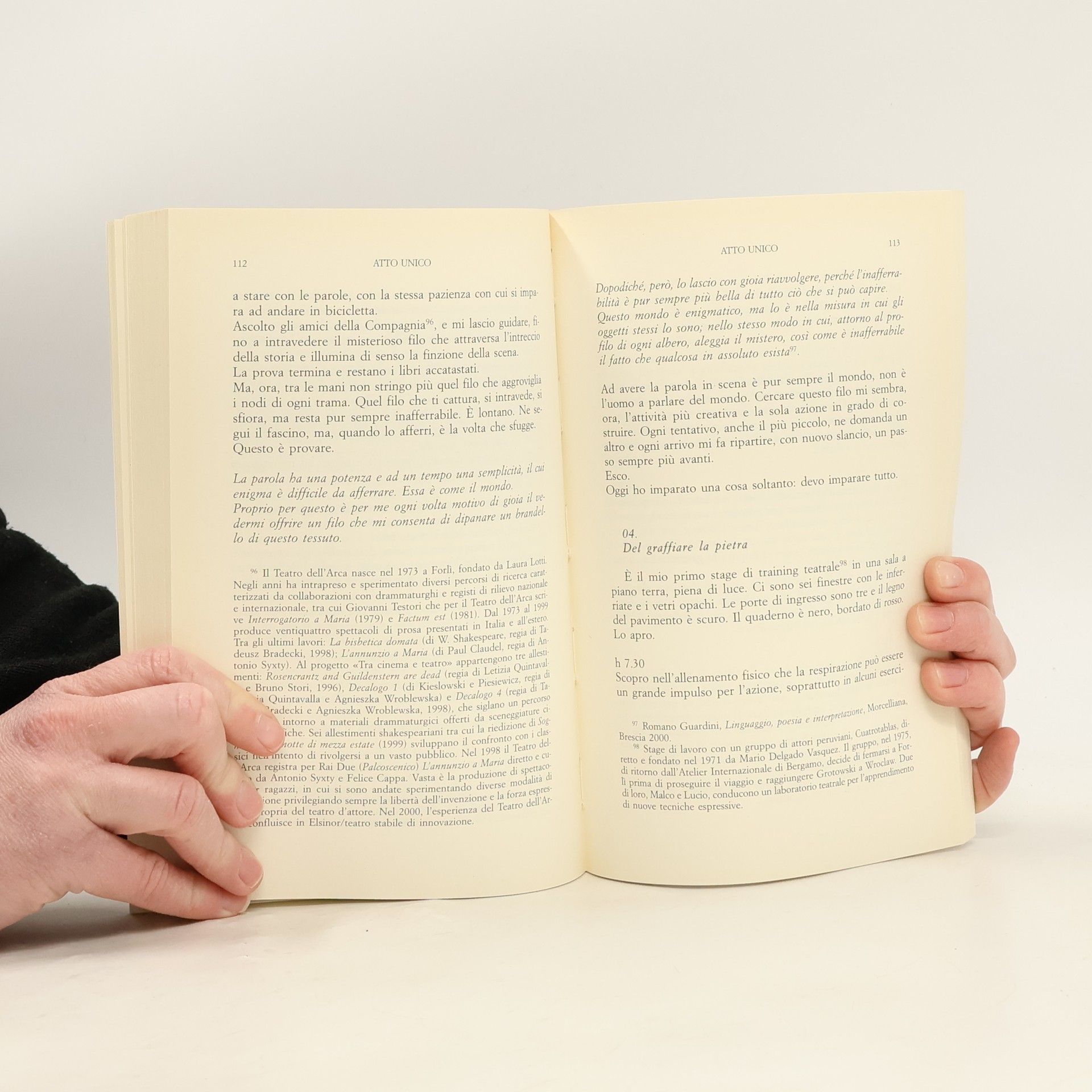 Atto unico è un crocevia di storie che nascono, senza sosta, tra vita e teatro. Cinquantaquattro fotogrammi si susseguono in forma di racconto e in un disordine cronologico, seguendo il filo teso e appassionato di tre decenni vissuti nei pressi del palco (dal 1975 al 2007). Il libro è un viaggio ininterrotto di continue partenze e di incontri, che sono variazioni di un unico atto: la vita. Ogni frammento è fissato da fulminei scatti di polaroid e le immagini scorrono, in bianco e nero e a colori, come la sceneggiatura di un film narrativo. Bratislava, Madrid, Parigi, Tel Aviv, Cracovia, New York e le aule universitarie di Firenze, Bologna e Milano sono palco e sfondo di una folla eterogenea di personaggi di tutti i giorni, che diventano all'improvviso attori e spettatori di scene reali. Vero o finto, finto o vero: quanta verità nell'inversione delle parti. Per il teatro come per l'uomo, la verità è l'accettazione del proprio destino di finzione. Guitti della vita contempliamo paradossalmente, nel teatro, la nostra verità. La finzione teatrale è più vera dell'apparente verità, perché solleva la crosta. Per questo non esiste forse momento più emozionante di quando in sala le luci si abbassano, e si apre il sipario. I due autori ci accompagnano a conoscere da vicino e a sperimentare come il teatro, da sempre metafora e specchio dell'esistenza, ci insegna, anche oggi, ad essere protagonisti sulla sterminata scena del mondo.