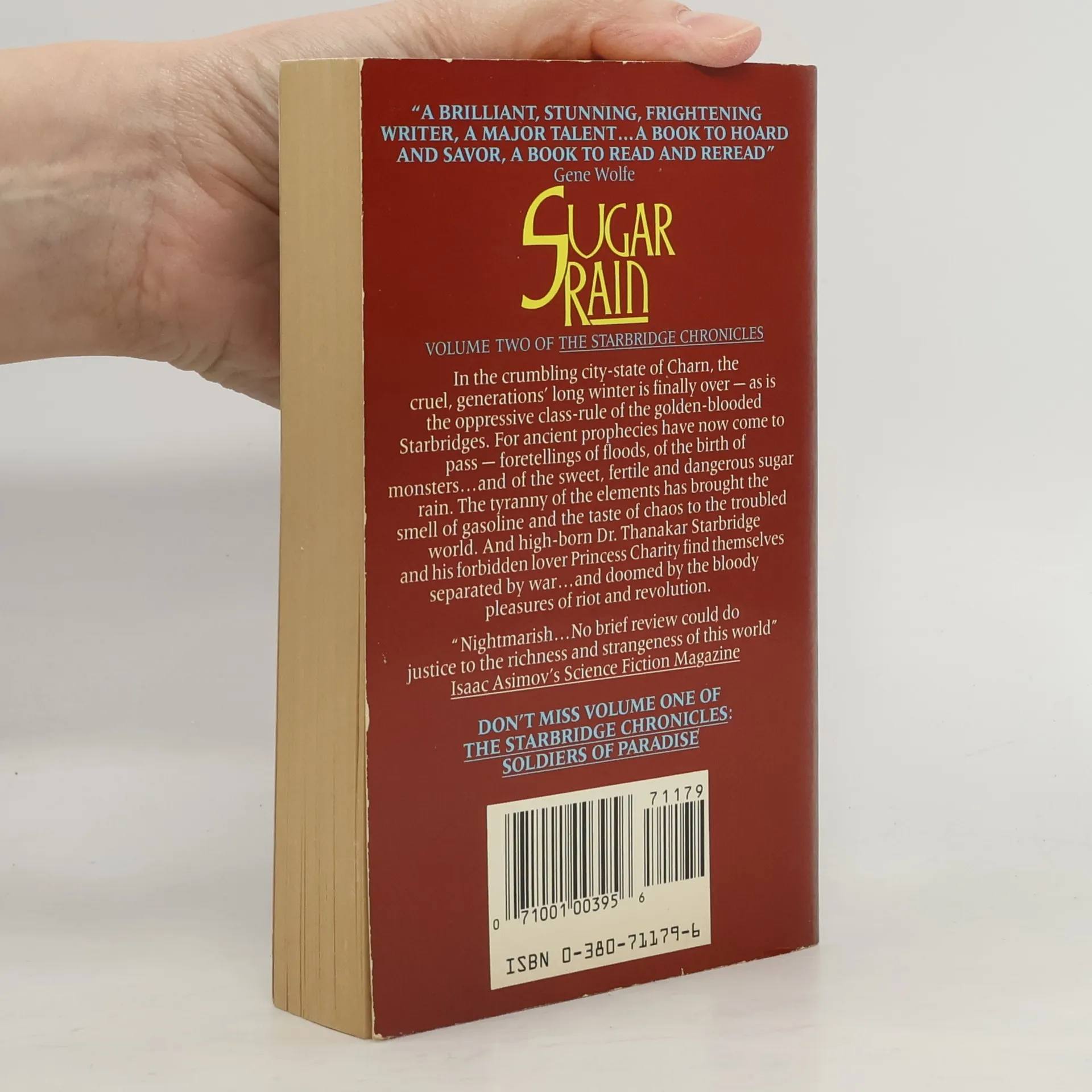 The second book in the Starbridge Chronicles, Sugar Rain relates the stories of Thanakar and Charity Starbridge during the revolution that ended the first book in the series, Soldiers of Paradise. The generations-long winter has drawn to a close, and with it the power of the tyrannical Starbridge theocracy that maintained order during the years of hunger. But a cruelly pragmatic priest has set the stage for a new faith, and even those who defy him seem fated to play out roles that will inevitably bring it to pass. As Thanakar struggles in exile to find safe harbor for his adopted family, Charity Starbridge undertakes a mythic journey, passing through various underworlds to join him. Sugar Rain was a finalist for the Locus Reader Poll Award.