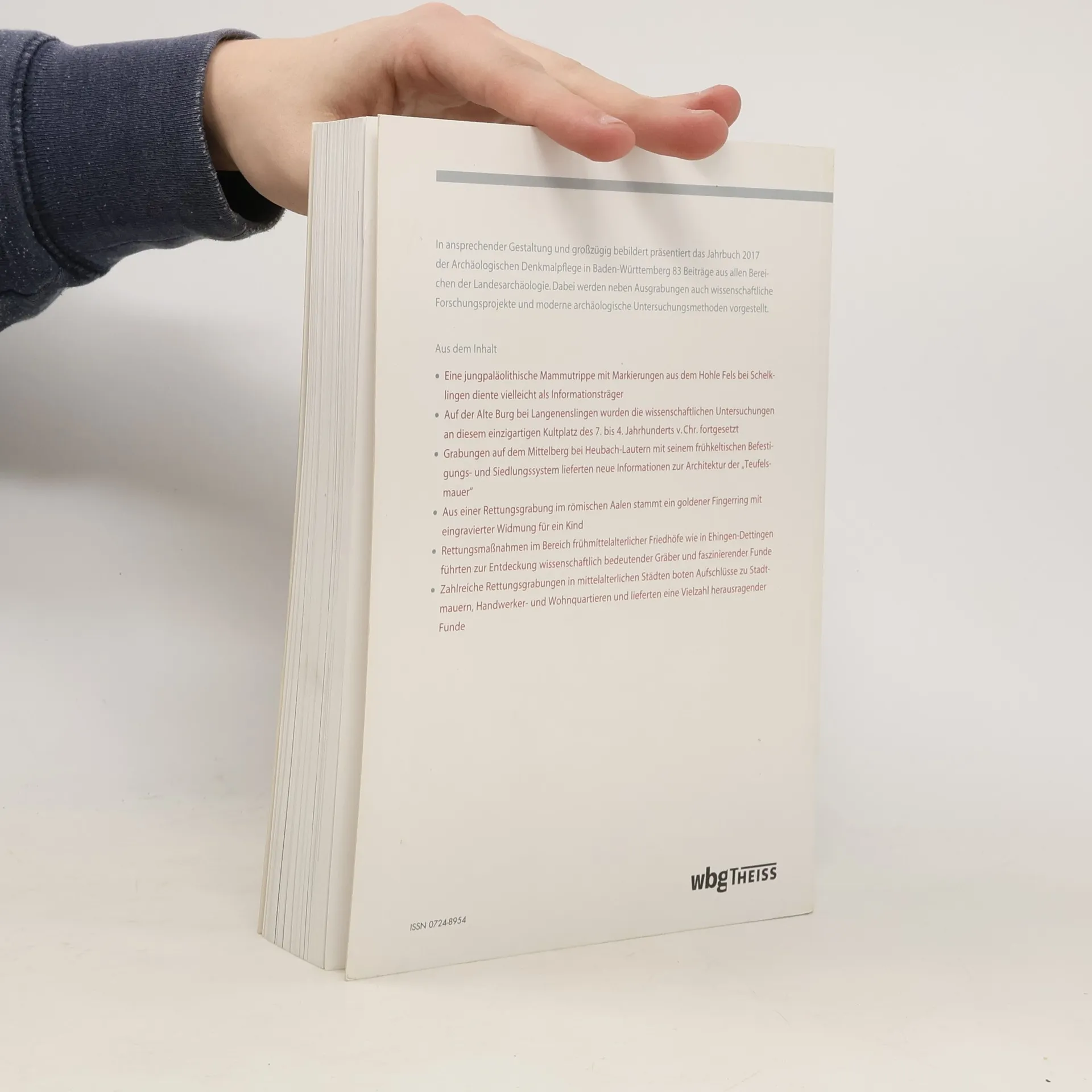 In ansprechender Gestaltung und großzügig bebildert präsentiert das Jahrbuch 2017 der Archäologischen Denkmalpflege in Baden-Württemberg 83 Beiträge aus allen Bereichen der Landesarchäologie. Dabei werden neben Ausgrabungen auch wissenschaftliche Forschungsprojekte und moderne archäologische Untersuchungsmethoden vorgestellt. Aus dem Inhalt - Eine jungpaläolithische Mammutrippe mit Markierungen aus dem Hohle Fels bei Schelklingen diente vielleicht als Informationsträger - Auf der Alte Burg bei Langenenslingen wurden die wissenschaftlichen Untersuchungen an diesem einzigartigen Kultplatz des 7. bis 4. Jahrhunderts v. Chr. fortgesetzt - Grabungen auf dem Mittelberg bei Heubach-Lautern mit seinem frühkeltischen Befestigungs- und Siedlungssystem lieferten neue Informationen zur Architektur der „Teufelsmauer" - Aus einer Rettungsgrabung im römischen Aalen stammt ein goldener Fingerring mit eingravierter Widmung für ein Kind - Rettungsmaßnahmen im Bereich frühmittelalterlicher Friedhöfe wie in Ehingen-Dettingen führten zur Entdeckung wissenschaftlich bedeutender Gräber und faszinierender Funde - Zahlreiche Rettungsgrabungen in mittelalterlichen Städten boten Aufschlüsse zu Stadtmauern, Handwerker- und Wohnquartieren und lieferten eine Vielzahl herausragender Funde