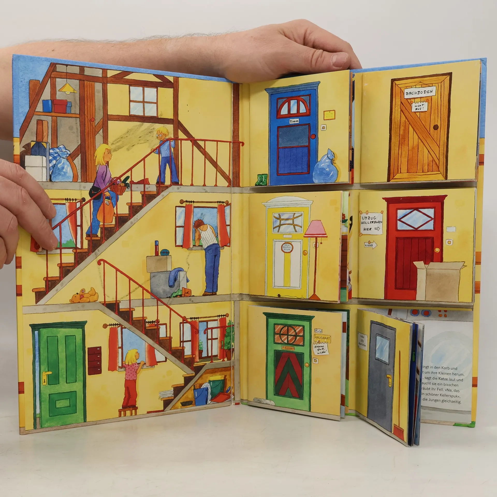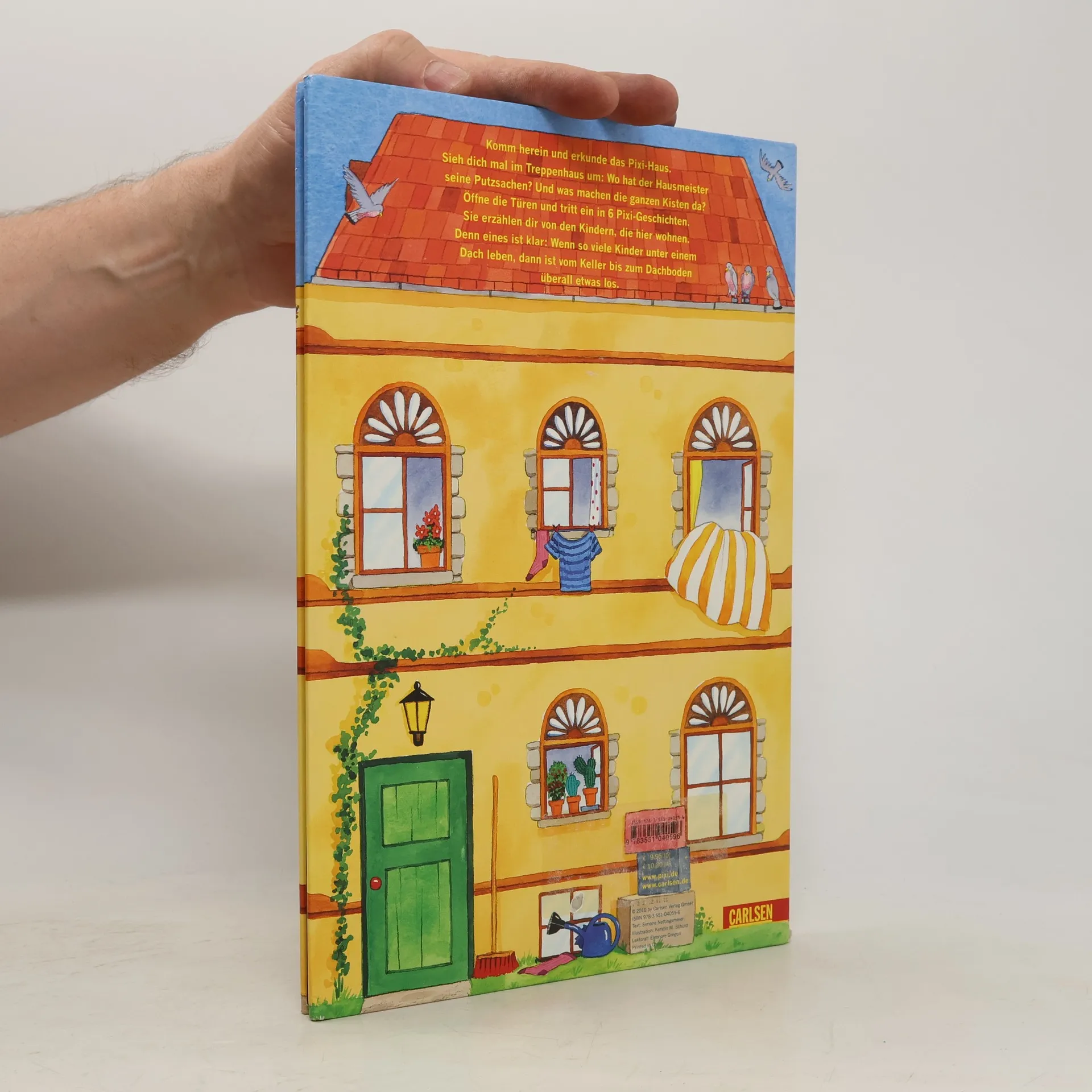Ein Bilderbuch-Haus zum Eintreten und Erkunden. Schon im Treppenhaus gibt es viel zu entdecken. Und auf den drei Etagen warten sechs geheimnisvolle Türen darauf, geöffnet zu werden. Hinter jeder verbirgt sich eine Pixi-Geschichte über die Kinder, die dort wohnen. Denn eines ist klar: Wenn so viele Kinder unter einem Dach leben, dann ist vom Keller bis zum Dachboden überall etwas los.