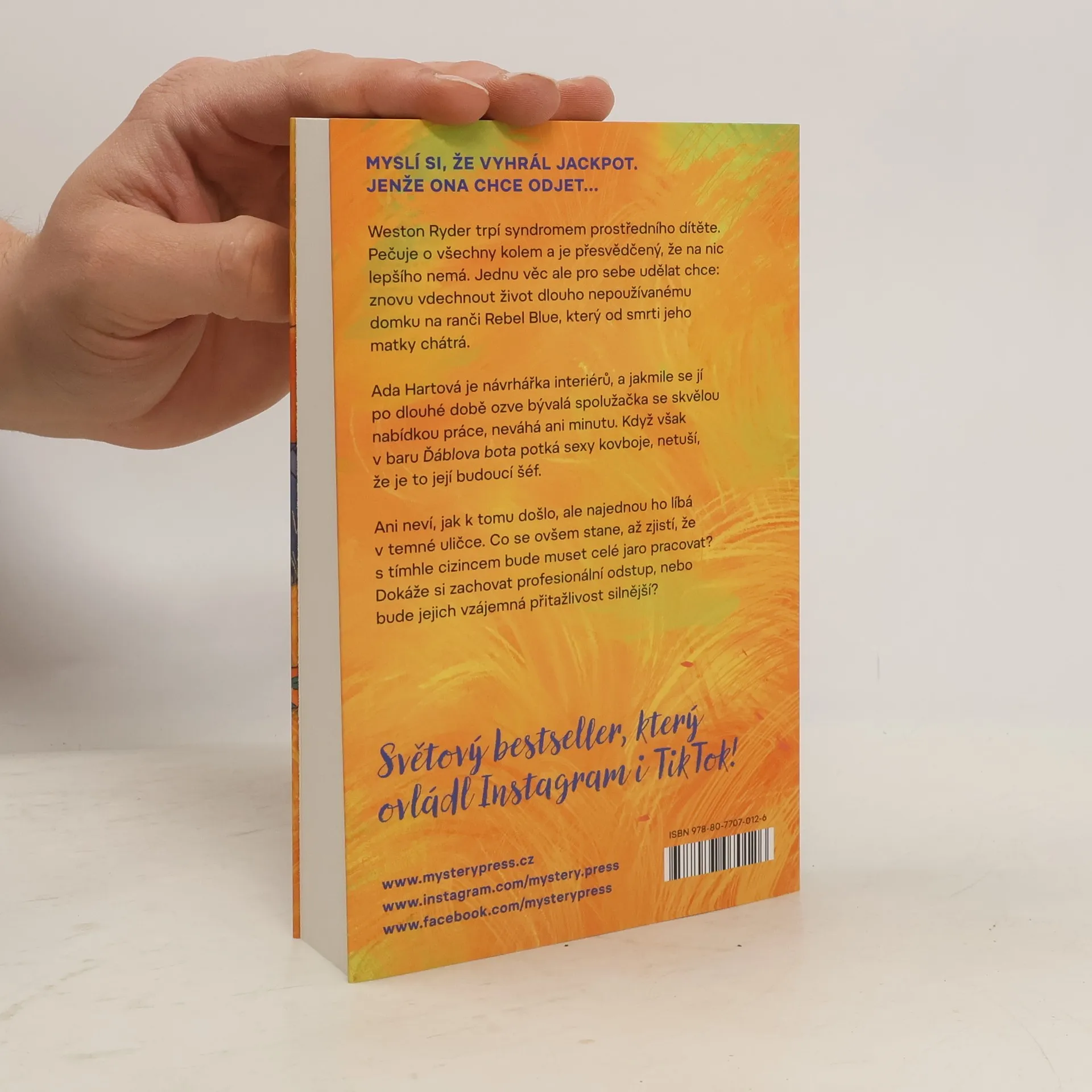 MYSLÍ SI, ŽE VYHRÁL JACKPOT. JENŽE ONA CHCE ODJET… Weston Ryder trpí syndromem prostředního dítěte. Pečuje o všechny kolem a je přesvědčený, že na nic lepšího nemá. Jednu věc ale pro sebe udělat chce: znovu vdechnout život dlouho nepoužívanému domku na ranči Rebel Blue, který od smrti jeho matky chátrá. Ada Hartová je návrhářka interiérů, a jakmile se jí po dlouhé době ozve bývalá spolužačka se skvělou nabídkou, neváhá ani minutu. Když však v baru Ďáblova bota potká sexy kovboje, netuší, že je to její budoucí šéf. Ani neví, jak k tomu došlo, ale najednou ho líbá v temné uličce. Co se ovšem stane, až zjistí, že s tímhle cizincem bude muset celé jaro pracovat? Dokáže si zachovat profesionální odstup, nebo bude jejich vzájemná přitažlivost silnější? Světový bestseller, který ovládl Instagram i TikTok!