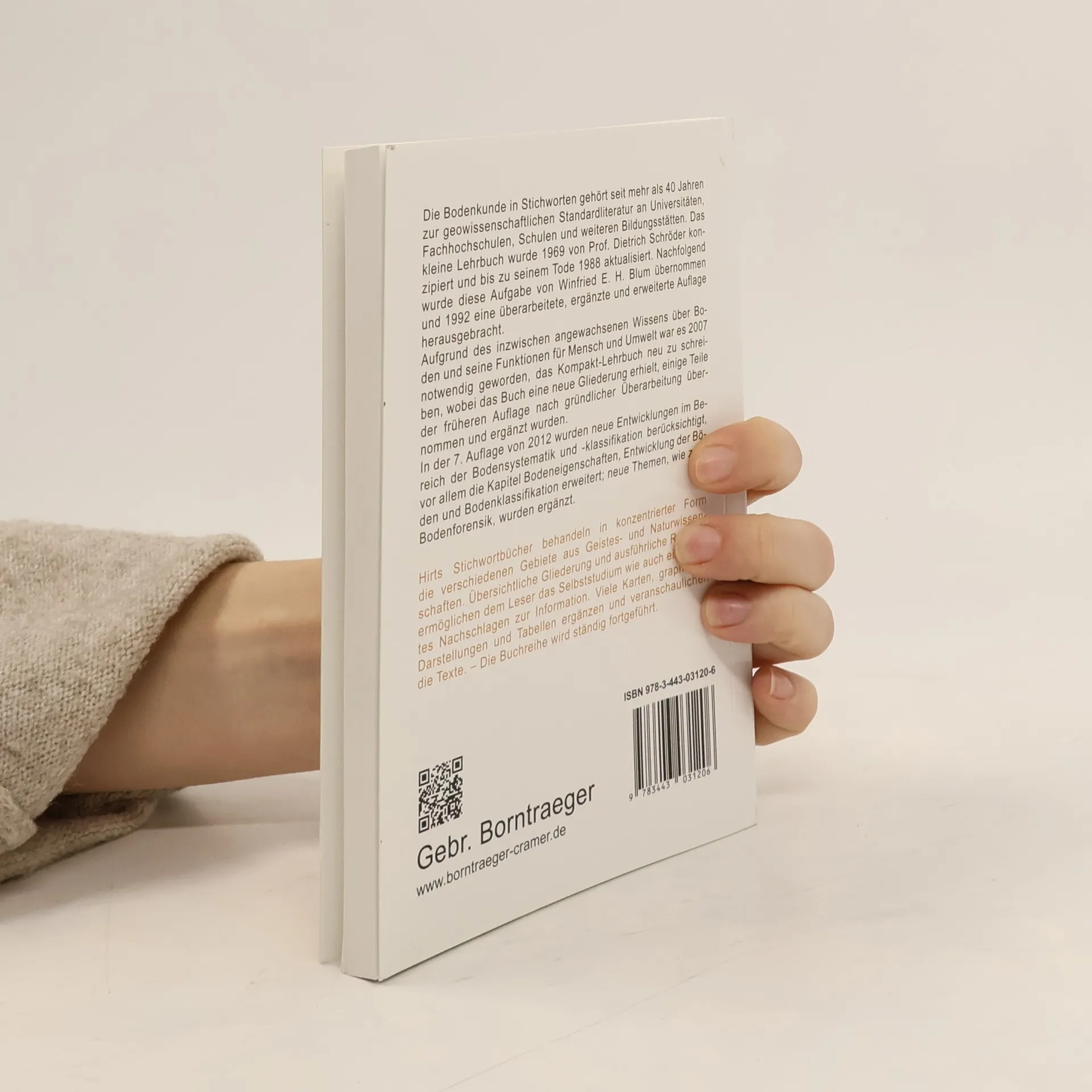 Das Kompakt-Lehrbuch Bodenkunde in Stichworten gehört seit mehr als 40 Jahren zur geowissenschaftlichen Standardliteratur an Universitäten, Fachhochschulen, Schulen und weiteren Bildungsstätten. Das kleine Lehrbuch wurde 1969 von Prof. Dietrich Schröder konzipiert und bis zu seinem Tode 1988 aktualisiert. Danach wurde diese Aufgabe von Prof. Winfried E. H. Blum übernommen. Aufgrund des inzwischen angewachsenen Wissens über Boden und seine Funktionen für Mensch und Umwelt war es 2007 notwendig geworden, das Kompakt-Lehrbuch neu zu schreiben. Dabei erhielt das Lehrbucheine neue Gliederung; einige Teile der früheren Auflage nach gründlicher Überarbeitung übernommen und ergänzt wurden. Die nun vorliegende 7. neu bearbeitete und ergänzte Auflage von 2012 berücksichtigt neue Entwicklungen im Bereich der Bodensystematik und -klassifikation, vor allem die Kapitel Bodeneigenschaften, Entwicklung der Böden und Bodenklassifikation erweitert; neue Themen, wie z. B. Bodenforensik, wurden ergänzt.