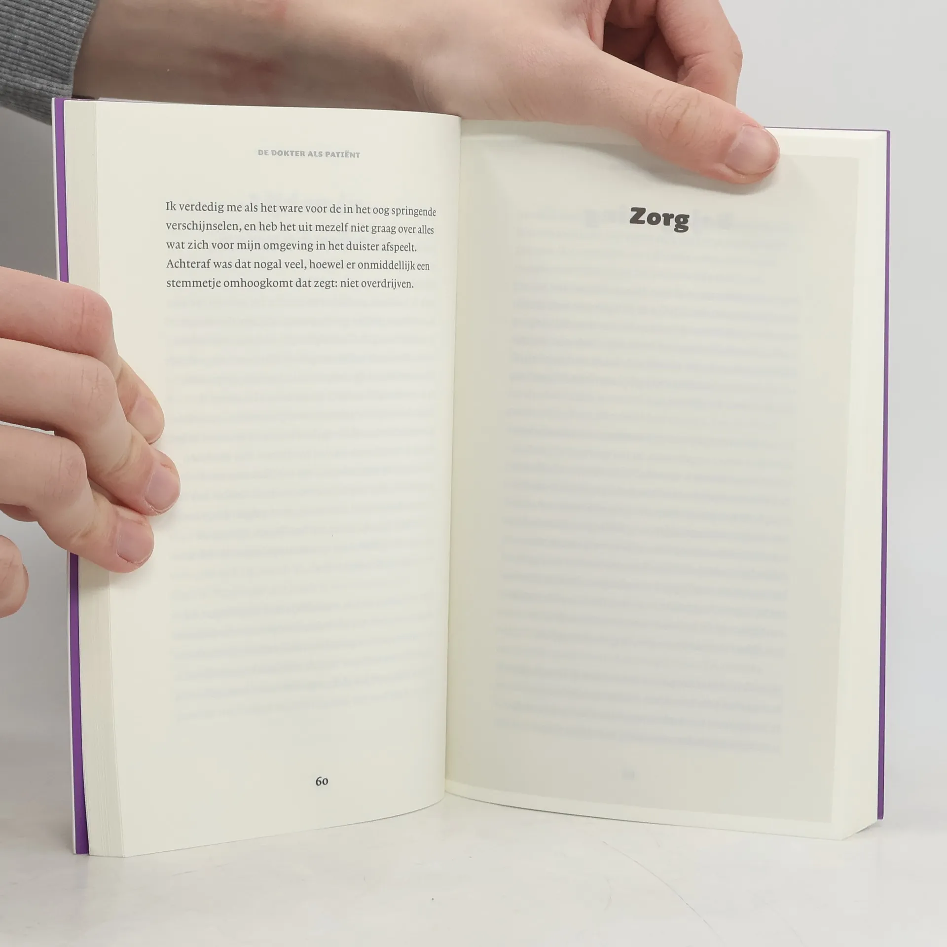 Covertekst: '(...) De dokter als patiënt is het verhaal van een dokter die aan den lijve ervaart hoe ziek zijn je leven en je kijk op het leven compleet op z’n kop zet, maar ook hoe ziek de gezondheidszorg zelf is geworden.'