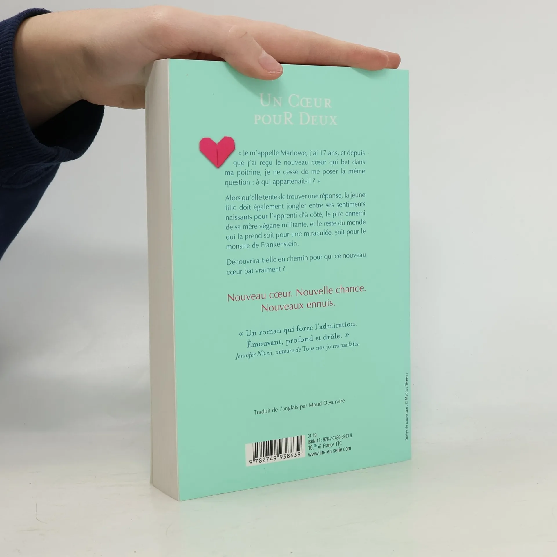 "Je m'appelle Marlowe, j'ai 17 ans, et depuis que j'ai reçu le nouveau coeur qui bat dans ma poitrine, je ne cesse de me poser la même question : à qui appartenait-il ? " Alors qu'elle tente de trouver une réponse, la jeune fille doit également jongler entre ses sentiments naissants pour l'apprenti d'à côté, le pire ennemi de sa mère végane militante, et le reste du monde qui la prend soit pour une miraculée, soit pour le monstre de Frankenstein. Découvrira-t-elle en chemin pour qui ce nouveau coeur bat vraiment ? Nouveau coeur. Nouvelle chance. Nouveaux ennuis.