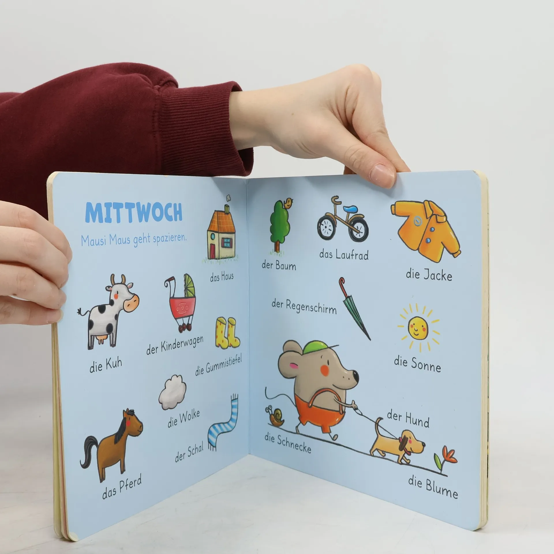 Mausi Maus hat viel zu tun. Montags macht sie sich schön, dienstags geht sie einkaufen, mittwochs spazieren … Und was Mausi Maus wohl am Sonntag macht? Auf den bunten, thematisch sortierten Doppelseiten finden sich die hundert wichtigsten Begriffe aus dem Kleinkindalltag – so macht Sprechenlernen Spaß!