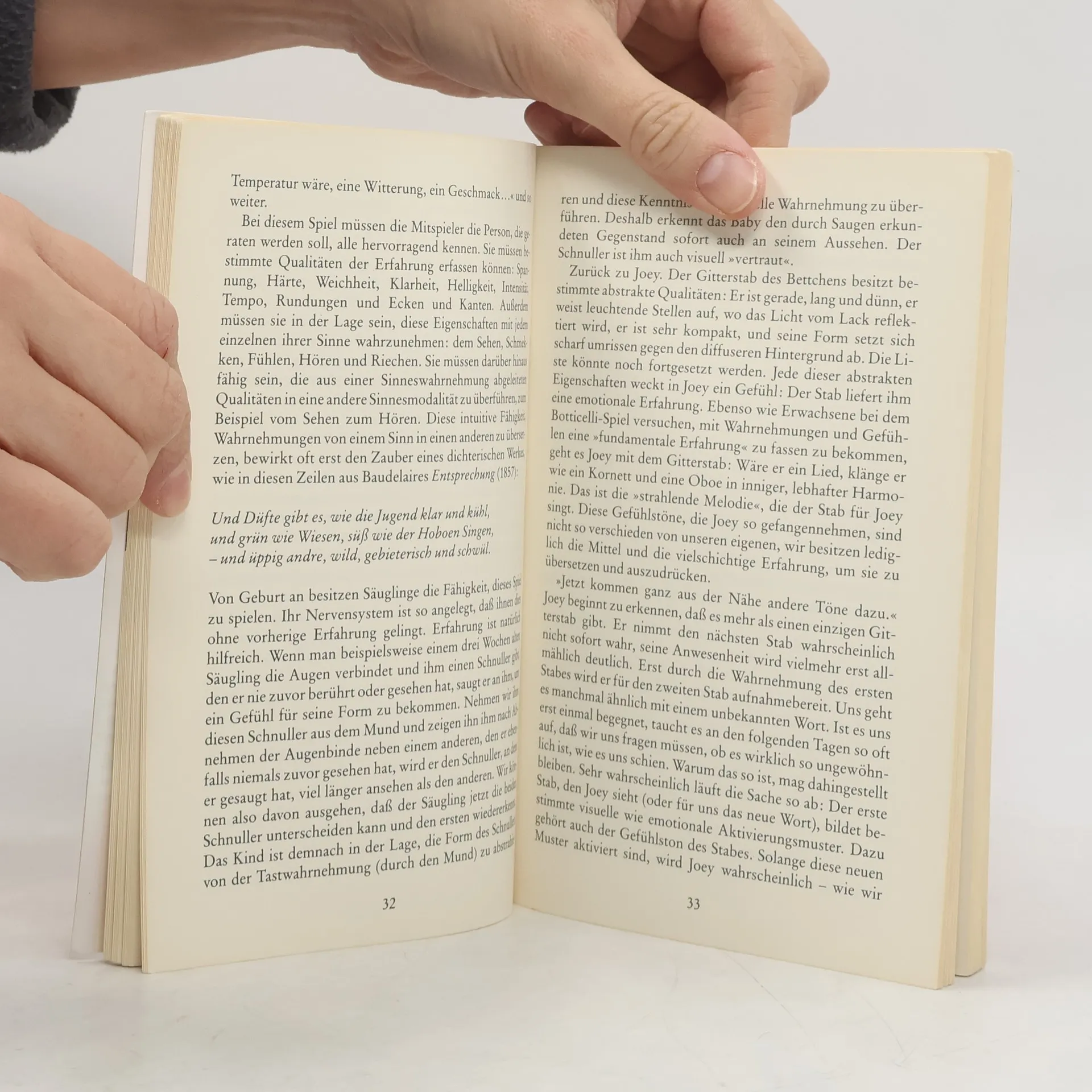Was sieht, fühlt, erlebt ein Baby? Wie spürt es seinen Hunger? Wie nimmt es einen Sonnenflecken an der Wand, die Augen seiner Mutter, das Fließen der Zeit, den Raum seines Zimmers wahr? Wann fängt es an, 'ich' zu denken? Einfühlsam stellt Daniel N. Stern in Szenen die Erlebniswelt und Entwicklung eines Säuglings von der sechsten Woche bis zum vierten Lebensjahr dar.