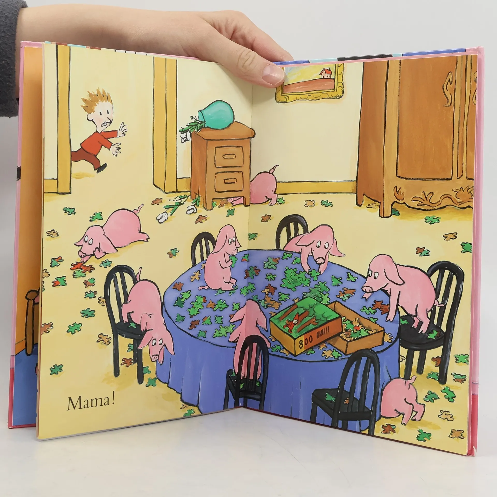 Neunmal »Mama!« brüllt ein kleiner Junge aus voller Kehle und steckt dabei seinen Kopf in neun Zimmer. Dass im ersten Raum ein Nilpferd, im zweiten zwei Löwen, im dritten drei Giraffen usw. sitzen, nimmt er nicht wahr, denn eigentlich wollte er nur loswerden: »Mama! In meinem Zimmer ist eine Spinne!« Die Überraschung der Betrachter ist groß und für Kinder der Anlass da, das Buch mit großer Freude sich oder anderen immer wieder »vorzulesen«. Und sich dabei ganz langsam der Welt der Zahlen anzunähern.