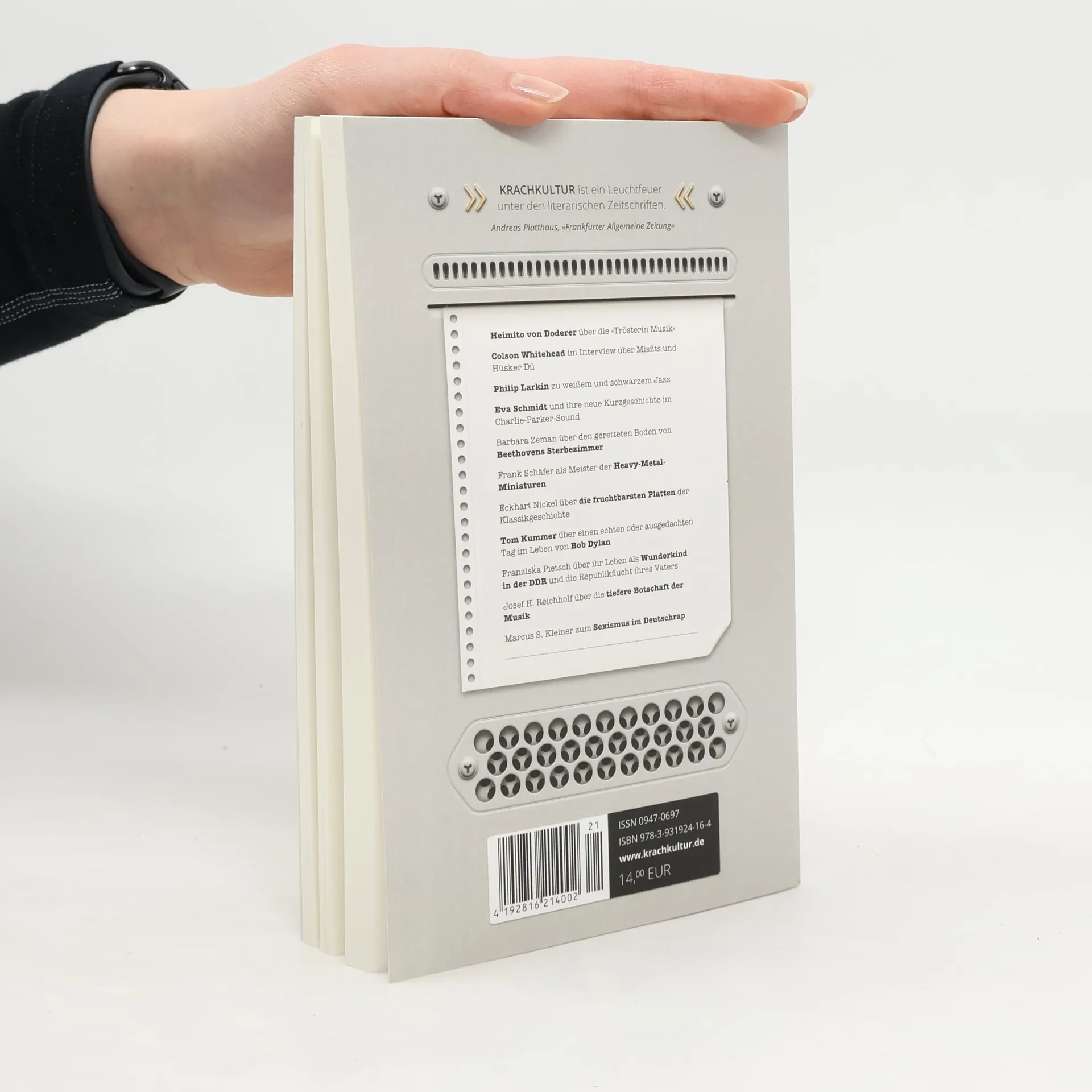 Die KRACHKULTUR bringt bahnbrechende Literatur aus der ganzen Welt. Große Autoren und neue Stimmen. Leise und laute. Zu heiklen Themen wie Heimat und Sexismus, und zu den schönen Momenten im Leben, die im Alltag untergehen. Die spannende Literaturzeitschrift für heute. Jedes Heft sorgt für Debatten, von FAZ bis Neues Deutschland. Die Süddeutsche sagt, die KRACHKULTUR tanzt „niemandes Pfeife nach“. FAZ Woche nennt sie „ein kleines Mirakel“. Der Bayerische Rundfunk mahnt: „Nicht versäumen!“ Für das Hamburger Abendblatt ist die Krachkultur gar „Pflichtlektüre für Literaturkenner“. Und Welt kompakt urteilt: „Es gibt in KRACHKULTUR kaum einen Beitrag, sei es Gedicht, Story oder Essay, der sich nicht der Lektüre lohnte.“ Die KRACHKULTUR wird mit Texten die Welt nicht aus den Angeln heben – aber sie rüttelt sie manchmal gehörig durch. Im aktuellen Heft steht ein Interview mit Colson Whitehead, der für Underground Railroad und Die Nickel Boys gleich zweimal den Pulitzer-Preis erhielt. Außerdem geht es um das Frauenbild im Deutschrap, ein Violine spielendes Wunderkind in der DDR, Beethovens Sterbezimmer und einen mehr oder weniger echten Tag im Leben von Bob Dylan. Mit dabei sind Skandalautor Tom Kummer, Pop-Literat Eckhart Nickel, der große englische Lyriker Philip Larkin und Bestseller-Biologe Josef H. Reichholf.