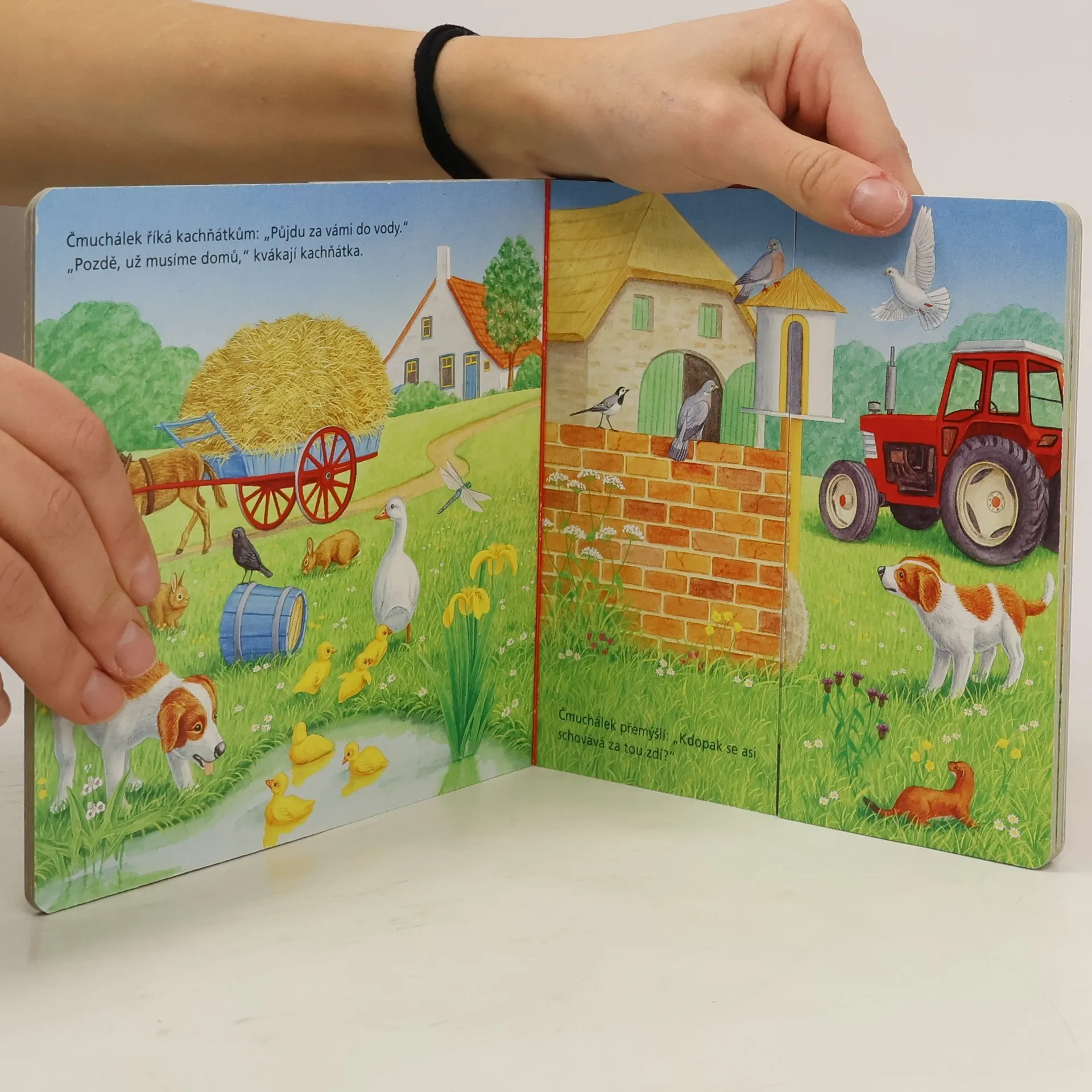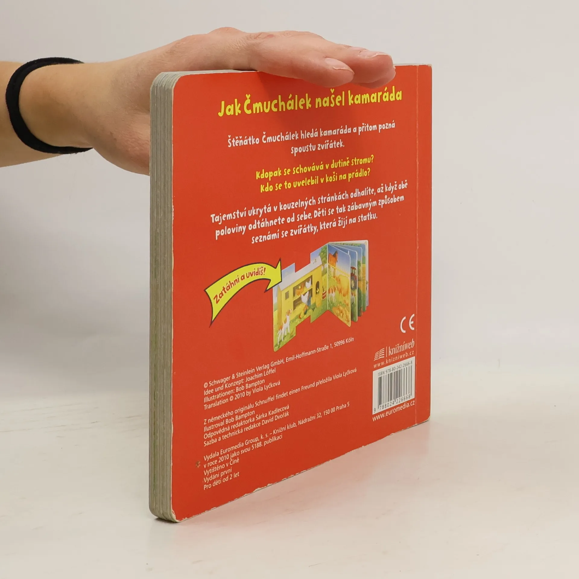 Jak Čmuchálek našel kamaráda Štěňátko Čmuchálek hledá kamaráda a přitom pozná spoustu zvířátek. Kdopak se schovává v dutině stromu? Kdo se to uvelebil v koši na prádlo? Tajemství, ukrytá v kouzelných stránkách, odhalíte, až když obě poloviny odtáhnete od sebe. Děti se tak zábavným způsobem seznámí se zvířátky, která žijí na statku. Zatáhni a uvidíš!