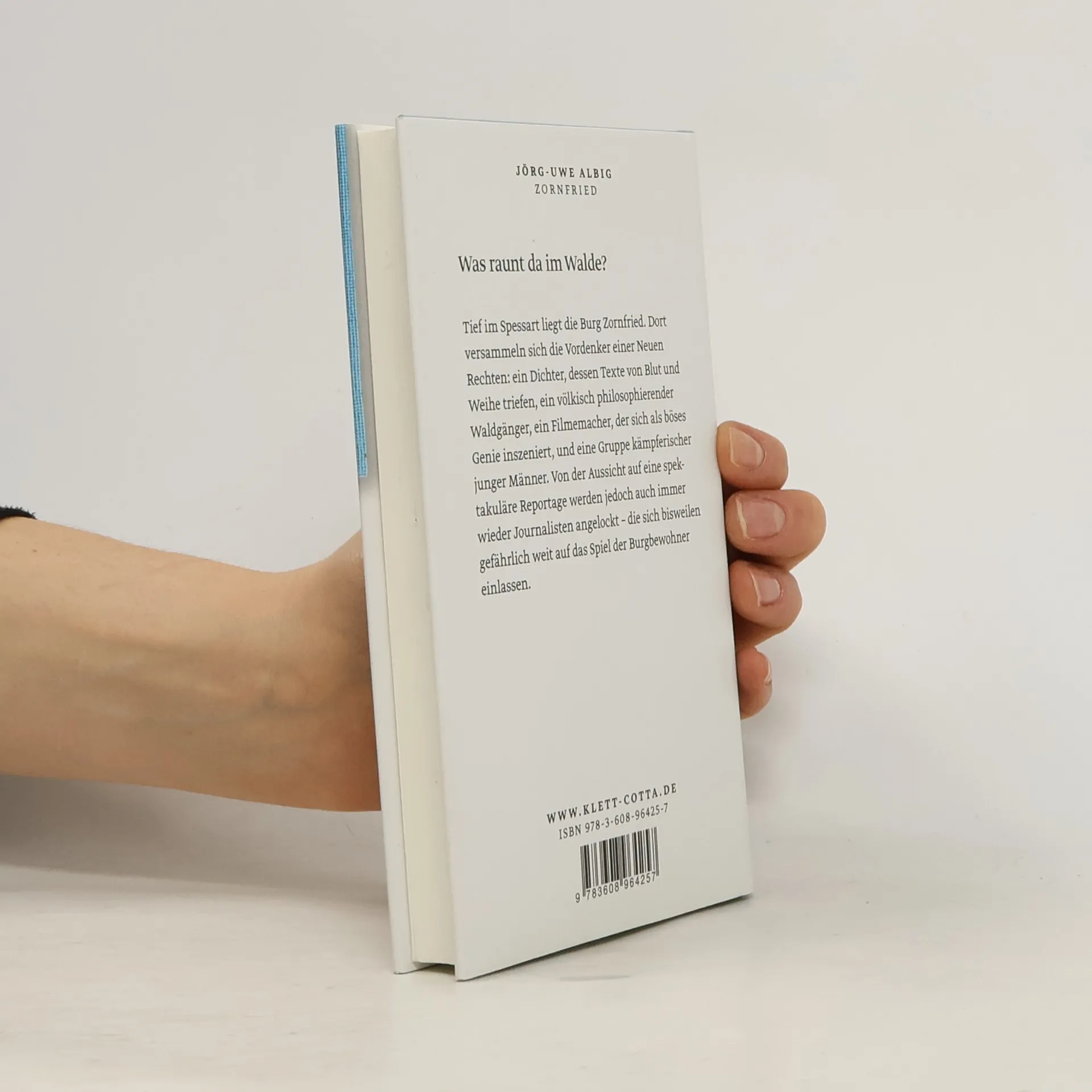 Tief im Spessart liegt die Burg Zornfried. Dort versammeln sich die Vordenker einer Neuen Rechten: ein Dichter, dessen Texte von Blut und Weihe triefen, ein völkisch philosophierender Waldgänger, ein Filmemacher, der sich als böses Genie inszeniert, und eine Gruppe kämpferischer junger Männer. Von der Aussicht auf eine spektakuläre Reportage werden jedoch auch immer wieder Journalisten angelockt – die sich bisweilen gefährlich weit auf das Spiel der Burgbewohner einlassen. Jan Brock ist freier Reporter und schreibt für das Feuilleton der Frankfurter Nachrichten. Er sieht sich als Rebellen, kennt aber im Grunde nur ein Prinzip: Was es gibt, darüber muss man schreiben. Im Internet stößt er auf die schwülstigen Texte des rechten Dichters Storm Linné, die ihn gleichzeitig abstoßen und faszinieren. Als er erfährt, dass Linné mit anderen Vordenkern der Neuen Rechten auf einem tief im Wald verborgenen Rittergut names Zornfried lebt, macht er sich auf zu einer Reportagereise. Doch zwischen Schrumpfköpfen, Militariasammlungen, Kampfübungen, weihevollen Tafelrunden und Predigten über die Hierarchien des artenreinen deutschen Waldes verwischen zunehmend die Grenzen zwischen teilnehmender Beobachtung und beobachtender Teilnahme. Jörg-Uwe Albig legt eine Satire über die neurechten Bewegungen unserer Gegenwart vor – und über die Medien, die deren Treiben mit sensationsfreudigem Eifer begleiten.