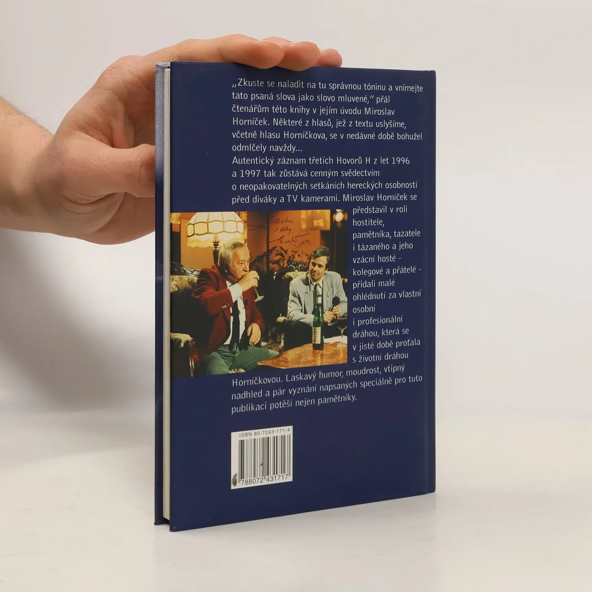 „Zkuste se naladit na tu správnou tóninu a vnímejte tato psaná slova jako slovo mluvené,” přál čtenářům této knihy v jejím úvodu Miroslav Horníček. Některé z hlasů, jež z textu uslyšíme, včetně hlasu Horníčkova, se bohužel odmlčely navždy... Autentický záznam třetích Hovorů H z let 1996 a 1997 tak zůstává cenným svědectvím o neopakovatelných setkáních hereckých osobností před diváky a TV kamerami. Miroslav Horníček se představil v roli hostitele, pamětníka, tazatele i tázaného a jeho vzácní hosté - kolegové a přátelé - přidali malé ohlédnutí za vlastní osobní i profesionální dráhou, která se v jisté době proťala s životní dráhou Horníčkovou. Laskavý humor, moudrost, vtipný nadhled a pár vyznání napsaných speciálně pro tuto publikaci potěší nejen pamětníky.