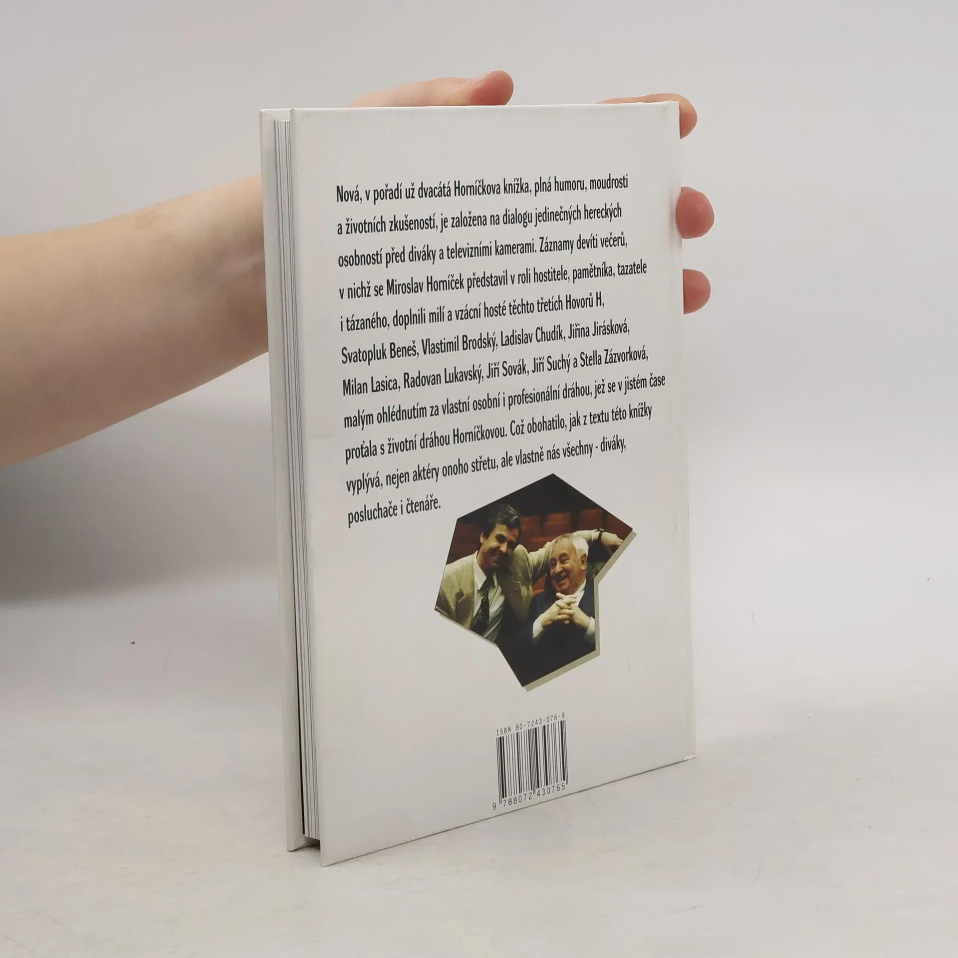 Miroslav Horníček v Hovorech H z Paláce K (Se S. Benešem, V. Brodským, L. Chudíkem, J. Jiráskovou, M. Lasicou, R. Lukavským, J. Sovákem, J. Suchým a S. Zázvorkovou) Autentický záznam devíti večerních dialogů M. Horníčka s milými kolegy a kolegyněmi před zvídavým publikem a TV kamerami se stal cenným svědectvím o neopakovatelných setkáních. Laskavý humor, moudrost, profesionální i osobní zážitky oblíbených hereckých osobností i jejich životní vyznání napsané speciálně pro tuto publikaci potěší nejen pamětníky. Váz., 184 str. + 8 stran barevné fotopřílohy, 140 x 205 mm