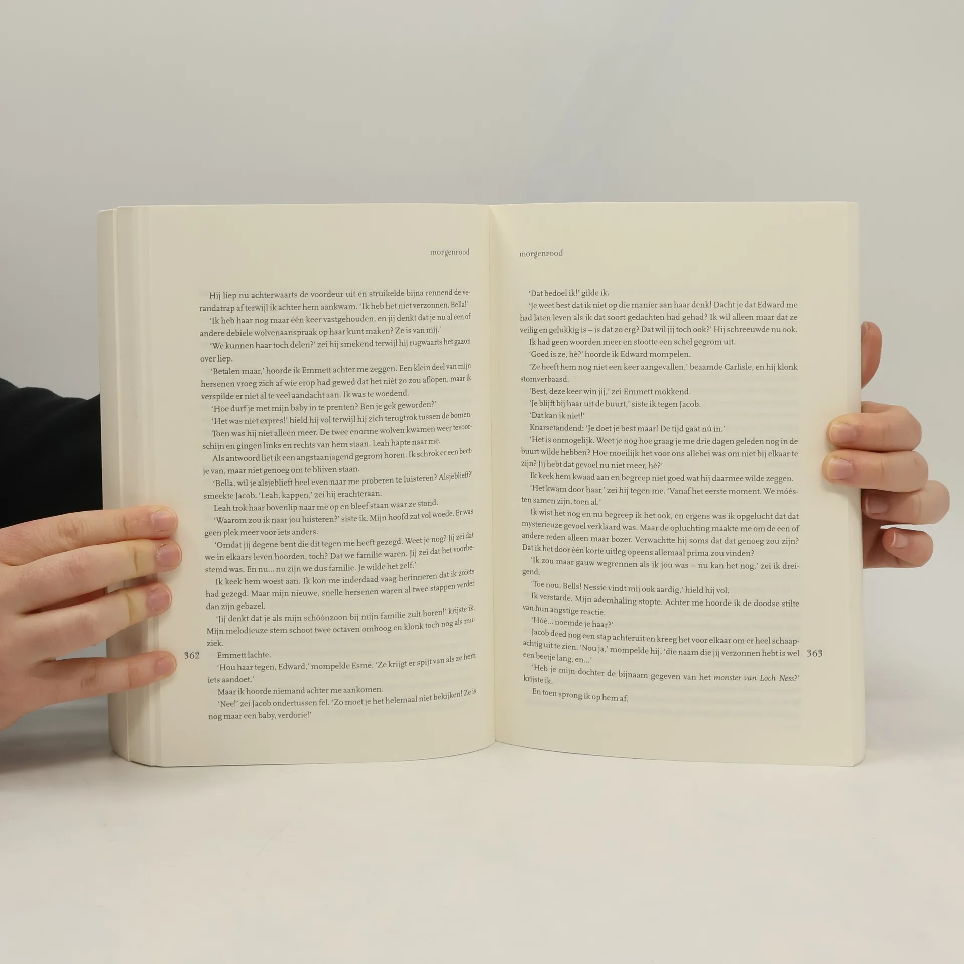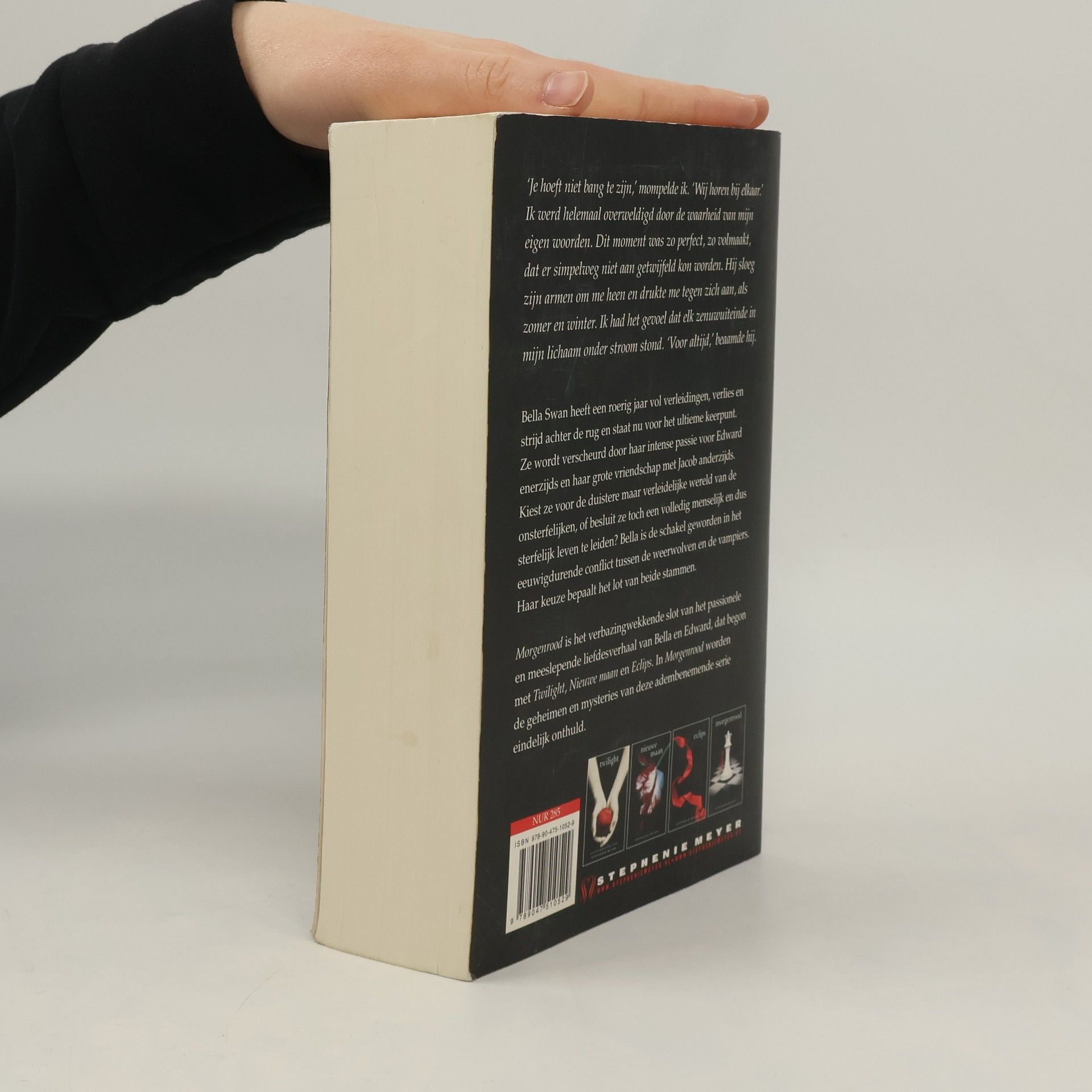 Bella Swan heeft een roerig jaar vol verleidingen, verlies en strijd achter de rug en staat nu voor het ultieme keerpunt. Ze wordt verscheurd door haar intense passie voor Edward enerzijds en haar grote vriendschap met Jacob anderzijds. Kiest ze voor de duistere maar verleidelijke wereld van de onsterfelijken, of besluit ze toch een volledig menselijk en dus sterfelijk leven te leiden? Bella is de schakel geworden in het eeuwigdurende conflict tussen de weerwolven en de vampiers. Haar keuze bepaalt het lot van beide stammen. Morgenrood is het verbazingwekkende slot van het passionele en meeslepende liefdesverhaal van Bella en Edward, dat begon met Twilight, Nieuwe maan en Eclips. In Morgenrood worden de geheimen en mysteries van deze adembenemende serie eindelijk onthuld.