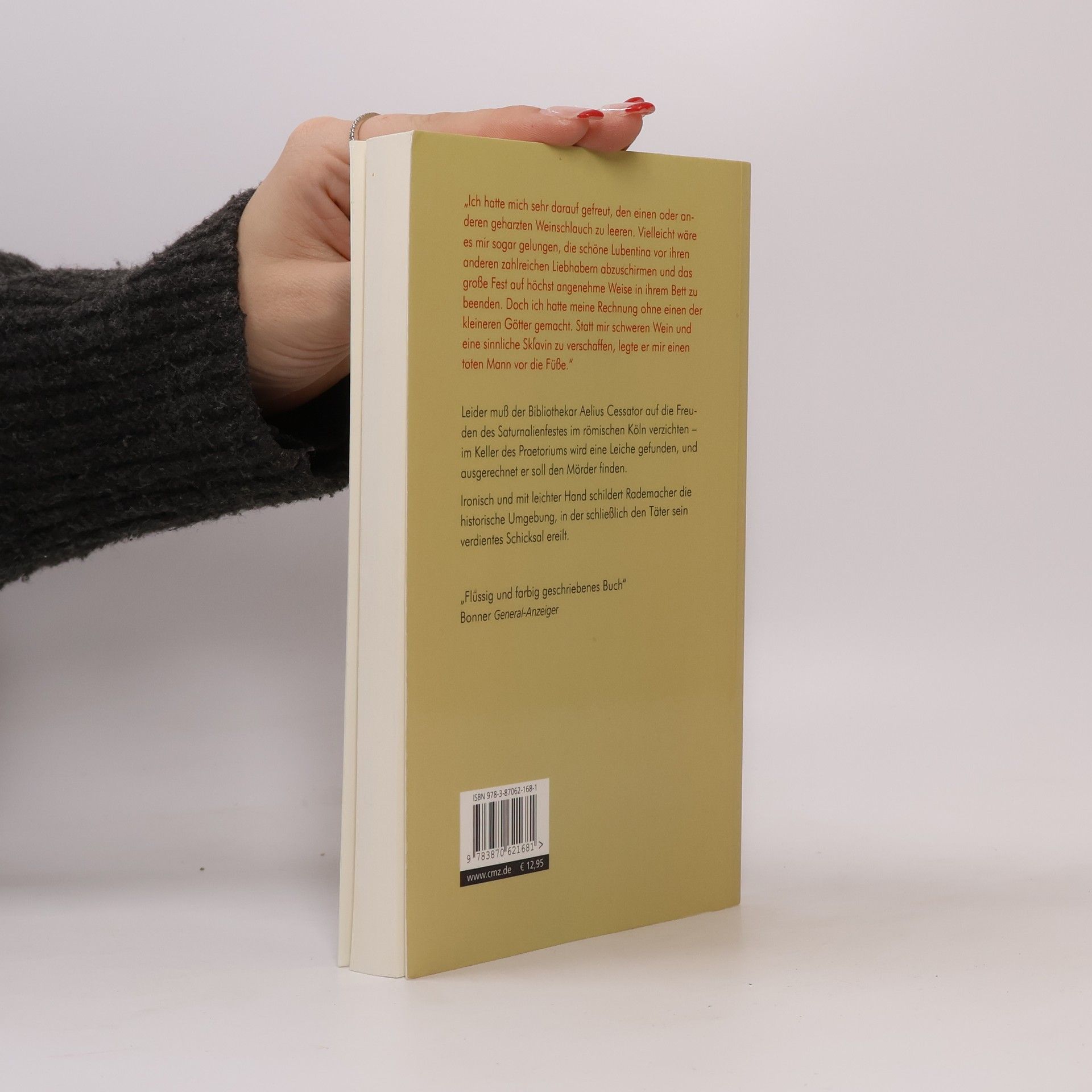 Leider muß der Bibliothekar Aelius Cessator auf die Freuden des Saturnalienfestes im römischen Köln verzichten – im Keller des Praetoriums wird ein Toter gefunden, und ausgerechnet er soll den Mörder finden. Ironisch und mit leichter Hand schildert Rademacher die lebensechten Figuren des Romans in ihrer historischen Umgebung, in der schließlich den Täter sein verdientes Schicksal ereilt.