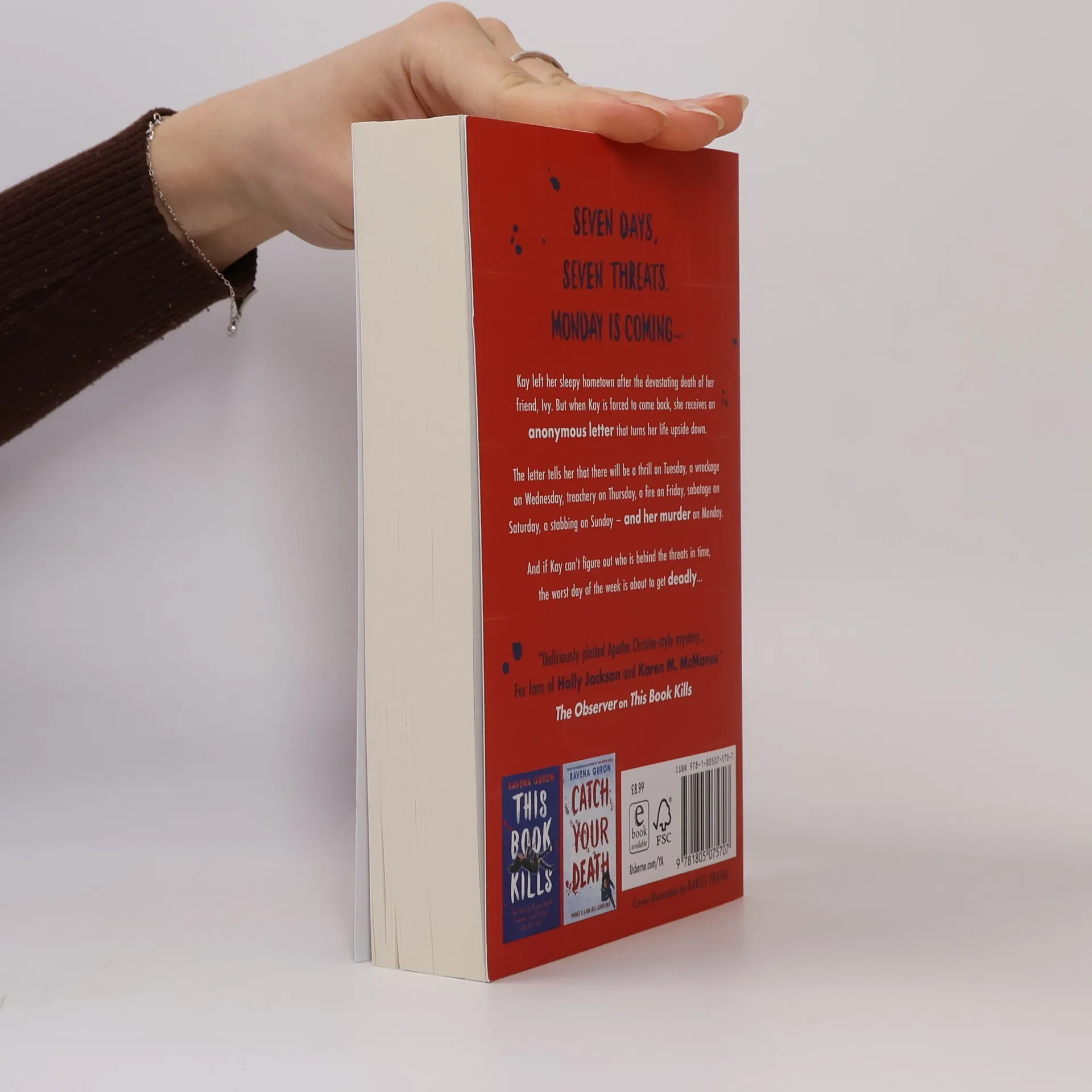 Murder, mystery and mind-blowing twists: the deadly new YA thriller from bestselling breakout sensation, Ravena Guron, perfect for fans of Holly Jackson and Karen M. McManus.Seventeen-year-old Kay left her sleepy hometown after the devastating death of her friend, Ivy. But when her parents go on holiday without her, Kay is forced to come back to stay with her cousin. And her return comes with a bang. Because when Kay arrives, it's to find an anonymous letter on her bed.The letter tells her that there will be a thrill on Tuesday, a wreckage on Wednesday, treachery on Thursday, a fire on Friday, sabotage on Saturday, a stabbing on Sunday - and her murder on Monday.And if Kay can't figure out who is behind the threats, the worst day of the week is about to get deadly...