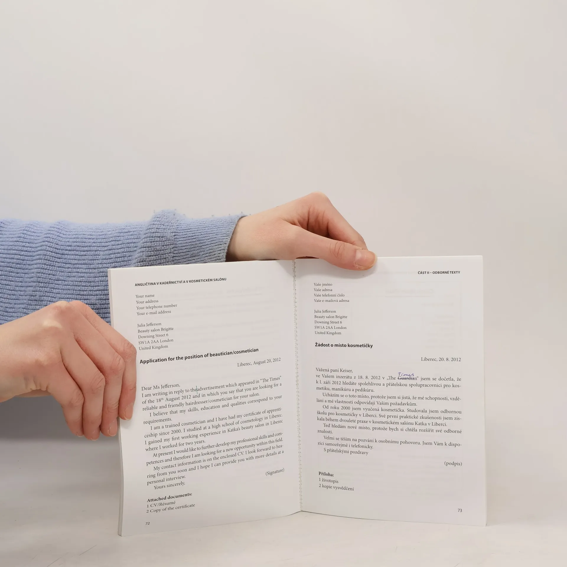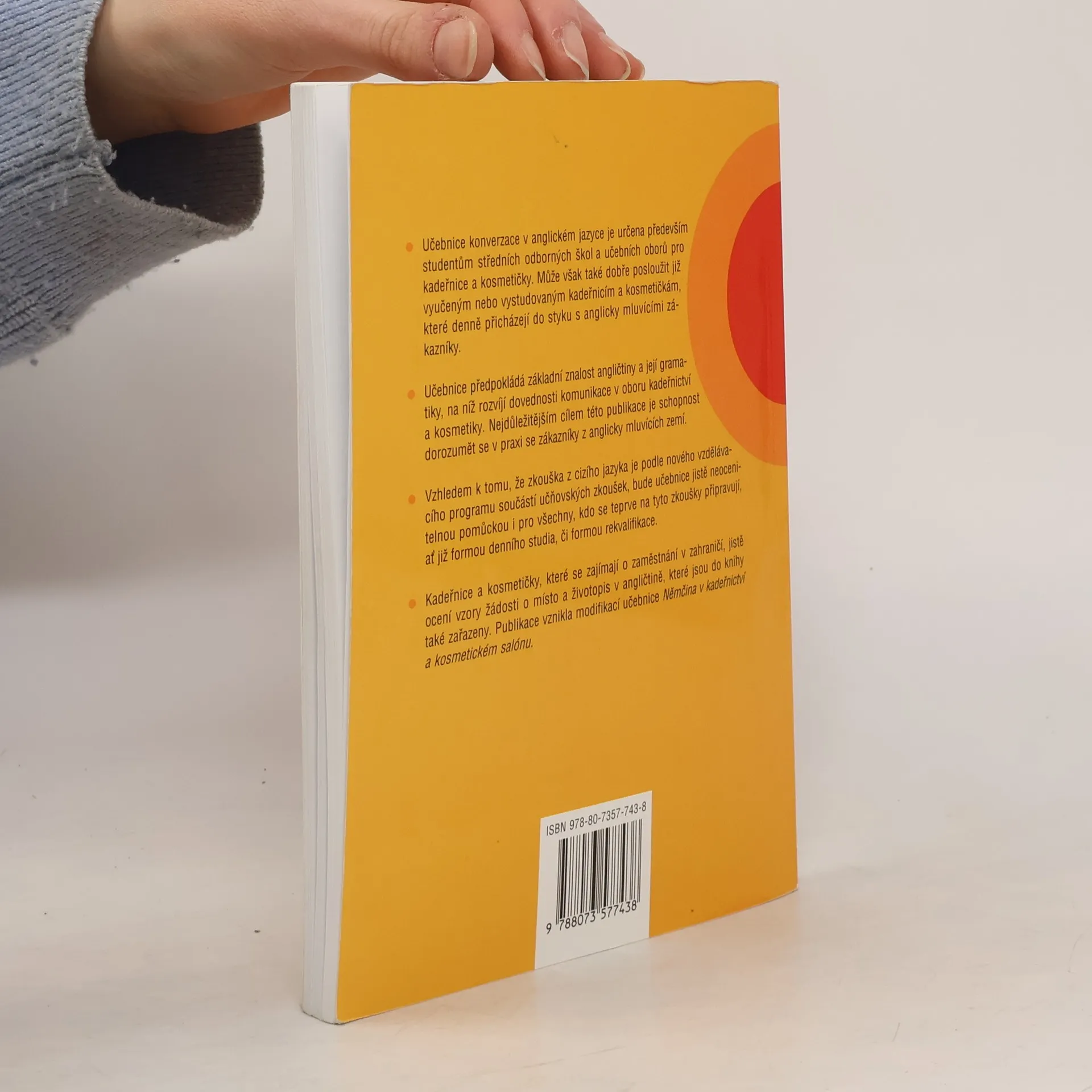 Učebnice konverzace v anglickém jazyce je určena především studentům středních odborných škol a učebních oborů pro kadeřnice a kosmetičky. Může však také dobře posloužit již vyučeným nebo vystudovaným kadeřnicím a kosmetičkám, které denně přicházejí do styku s anglicky mluvícími zákazníky. Publikace vznikla modifikací učebnice Němčina v kadeřnictví a kosmetickém salónu.