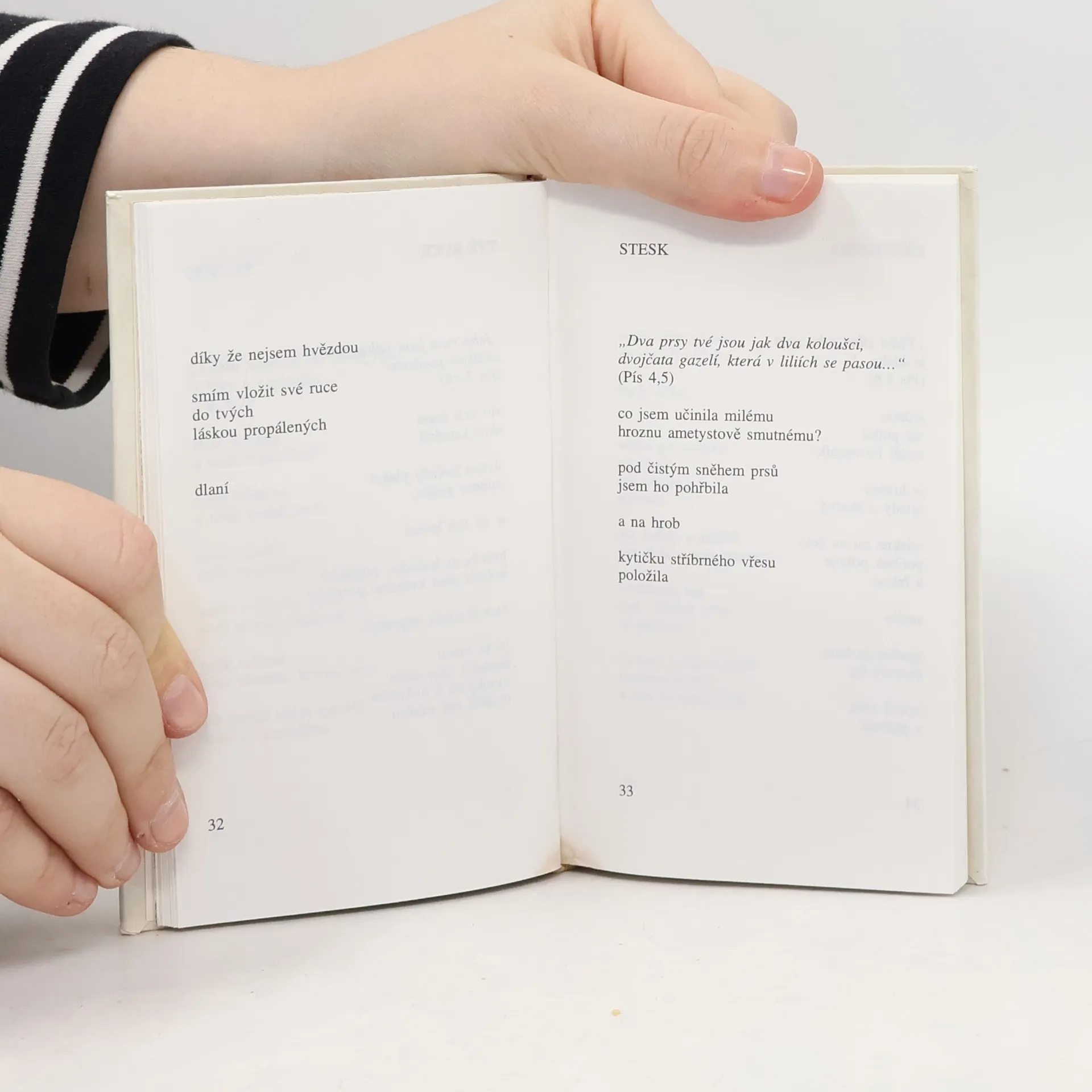 Výbor z básní, napsaných především v komunistickém vězení. Setkáme se zde s tématy osamělosti, čekání, hledání (nejen víry), strastiplné cesty, beznaděje,...ale naopak také milosti, prozření, naděje a nalezení. tyto protipóly spolu se zvláštními výrazovými prostředky dávají vzniknout osobité tenzi, která je pro básně typická. Obsahuje pasáže inspirované blahoslavenstvími, milostnou biblickou knihou Píseň písní, ročními obdobími či vztahem autora k Panně Marii.