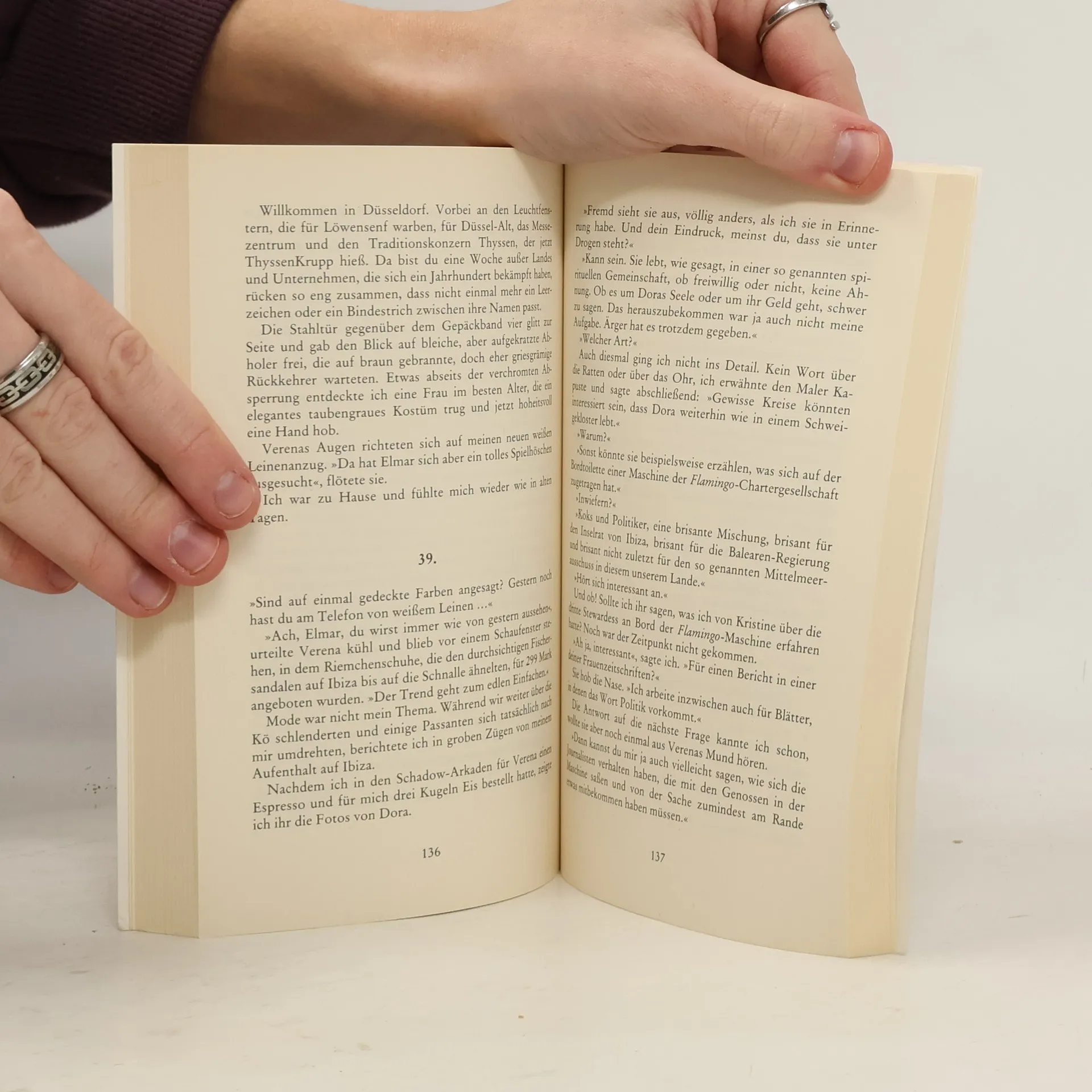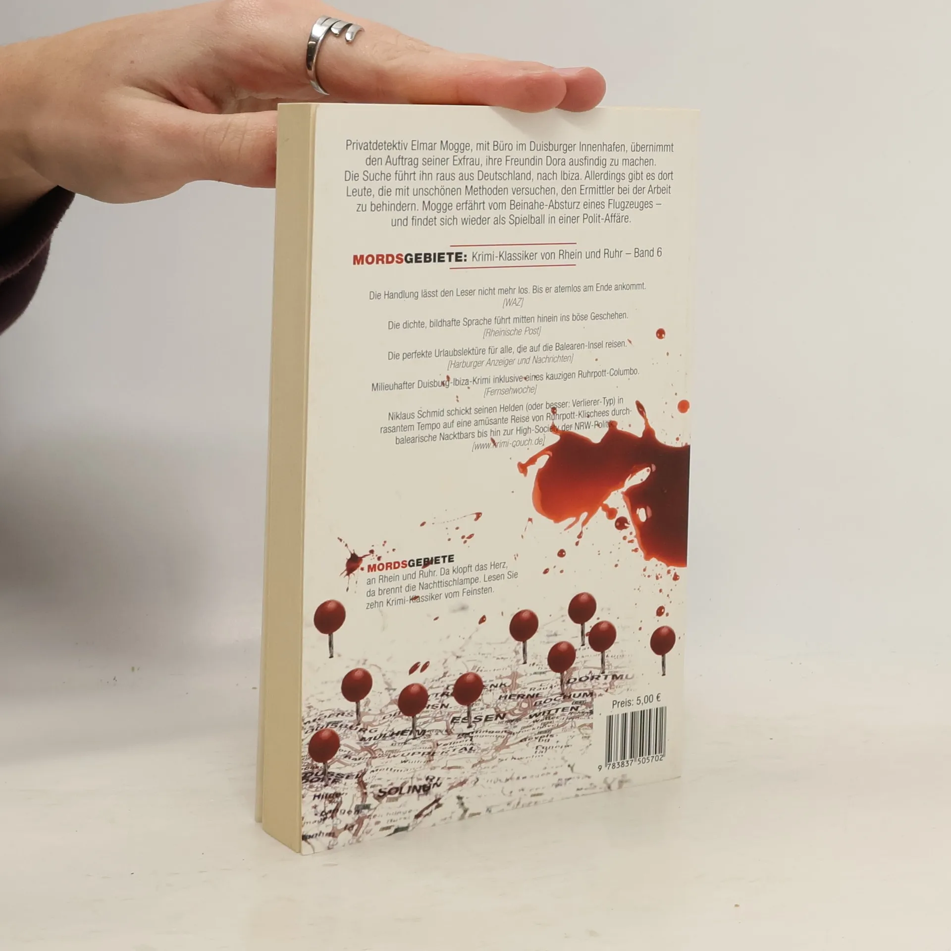 Privatdetektiv Elmar Mogge, mit Büro im Duisburger Innenhafen, übernimmt den Auftrag seiner Exfrau, ihre Freundin Dora ausfindig zu machen. Die Suche führt ihn raus aus Deutschland, nach Ibiza. Allerdings gibt es dort Leute, die mit unschönen Methoden versuchen, den Ermittler bei der Arbeit zu behindern. Mogge erfährt vom Beinahe-Absturz eines Flugzeuges – und findet sich wieder als Spielball in einer Polit-Affäre. Die Handlung lässt den Leser nicht mehr los. Bis er atemlos am Ende ankommt. [WAZ] Die dichte, bildhafte Sprache führt mitten hinein ins böse Geschehen. [Rheinische Post] Die perfekte Urlaubslektüre für alle, die auf die Balearen-Insel reisen. [Harburger Anzeiger und Nachrichten] Milieuhafter Duisburg-Ibiza-Krimi inklusive eines kauzigen Ruhrpott-Columbo. [Fernsehwoche] Niklaus Schmid schickt seinen Helden (oder besser: Verlierer-Typ) in rasantem Tempo auf eine amüsante Reise von Ruhrpott-Klischees durch balearische Nacktbars bis hin zur High-Society der NRW-Politik. [www.krimi-couch.de]