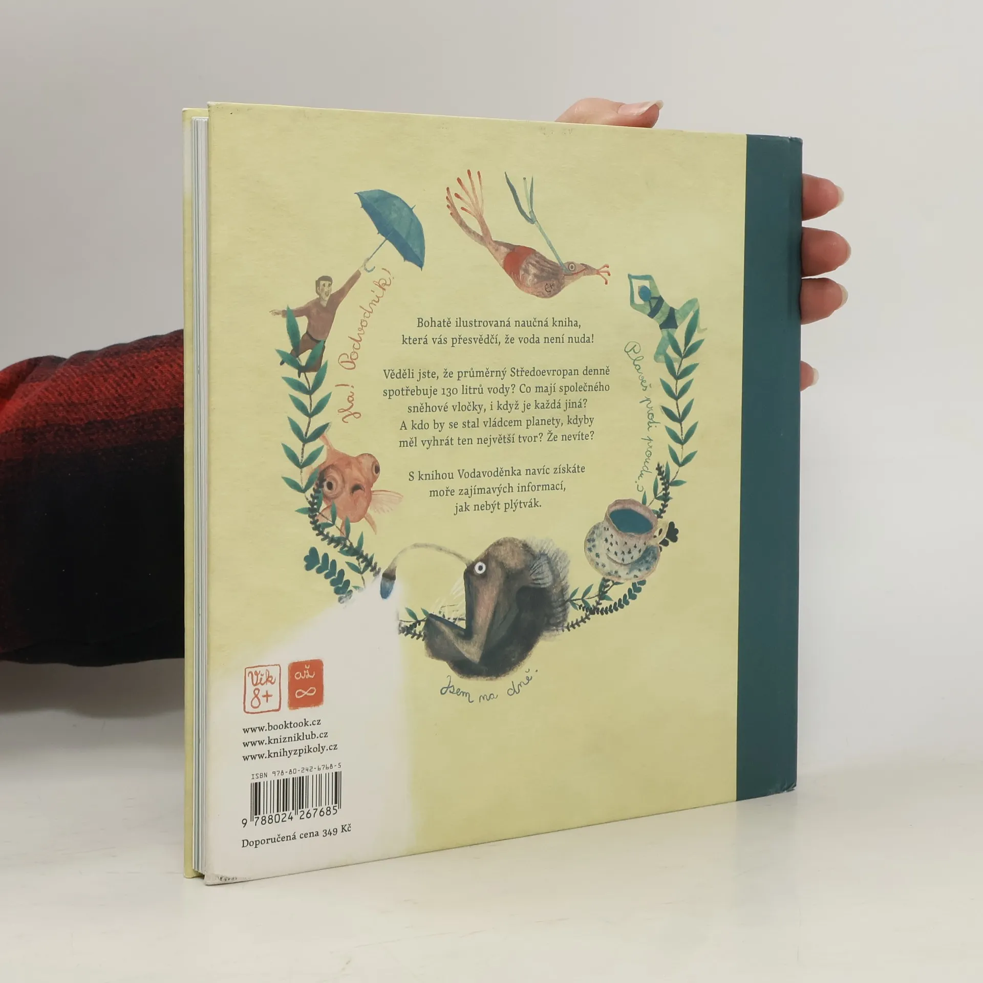 Bohatě ilustrovaná naučná kniha, která vás přesvědčí, že voda není nuda! Věděli jste, že průměrný Středoevropan denně spotřebuje 110 litrů vody? Co mají společného vločky, i když je každá jiná? A kdo by se stal vládcem planety, kdyby měl vyhrát ten největší tvor? Že nevíte? S knihou Voda voděnka získáte moře zajímavých informací, jak nebýt plýtvák. Kniha je určena pro děti od 8 let a jejich dospělé kamarády.