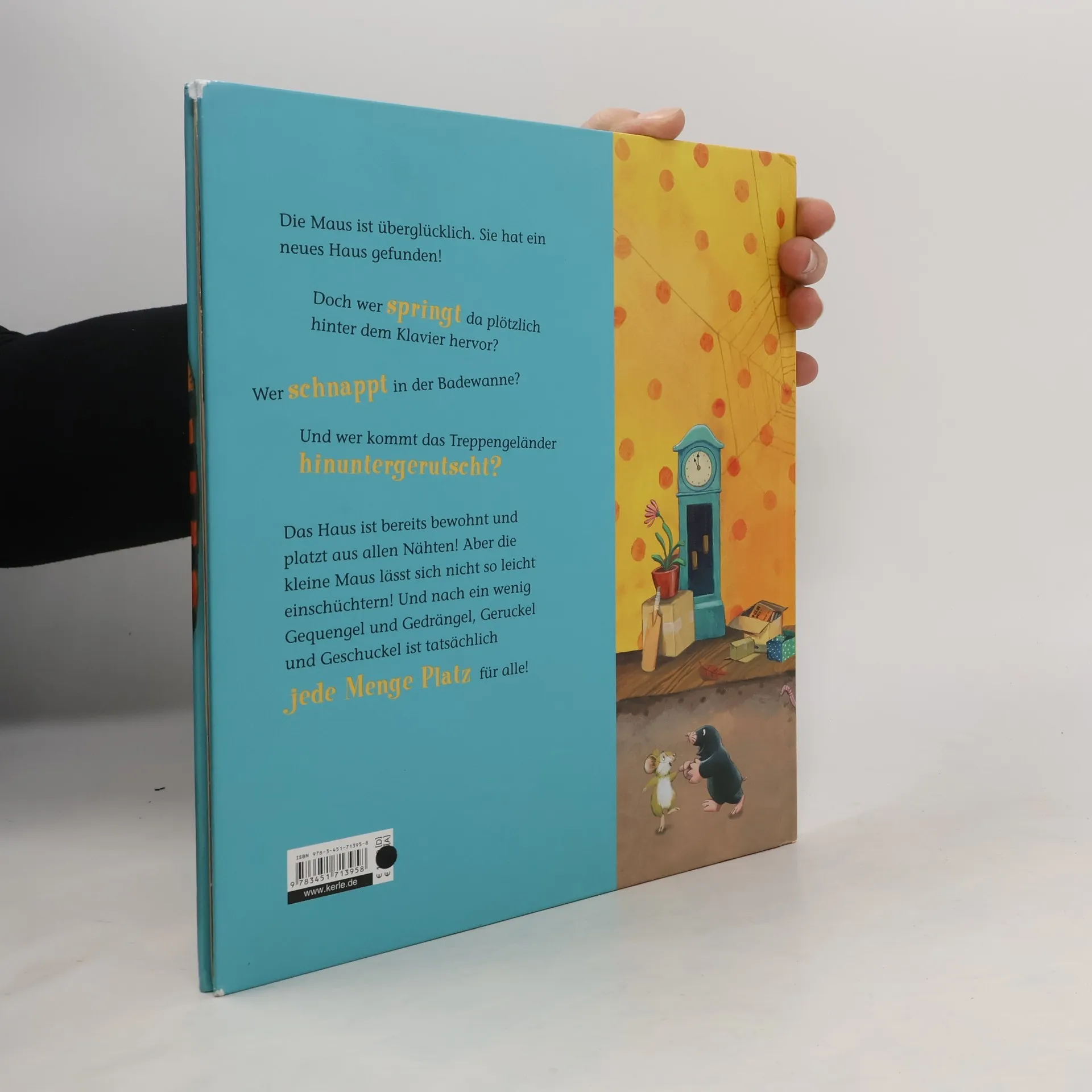 Endlich ist sie überglücklich. Die kleine Maus hat ein neues Haus gefunden! Doch wer springt da plötzlich hinter dem Klavier hervor? Wer besetzt die Badewanne? Und wer kommt denn da das Treppengeländer heruntergerutscht? Das Haus ist bewohnt und platzt laut Bär, Krokodil und Tiger bereits aus allen Nähten! Aber papperlapapp - die kleine Maus lässt sich nicht so leicht einschüchtern! Und nach ein wenig Gequengel und Gedrängel, Geruckel und Geschuckel findet sich tatsächlich jede Menge Platz!