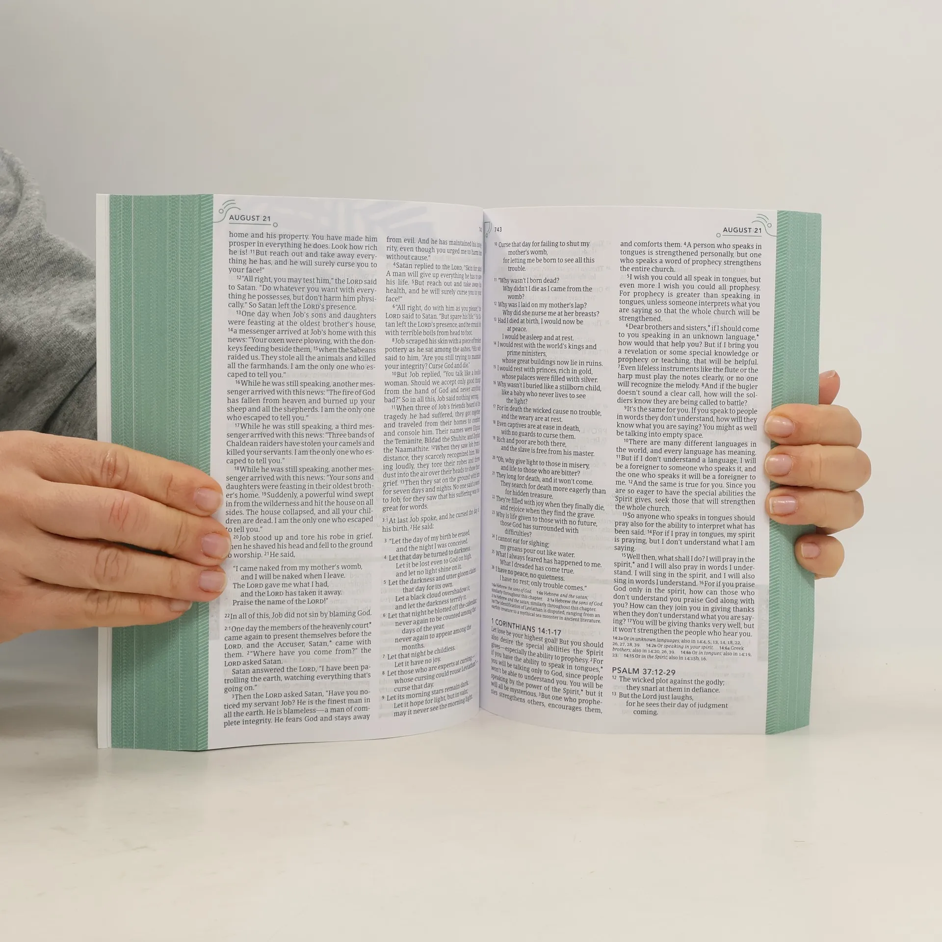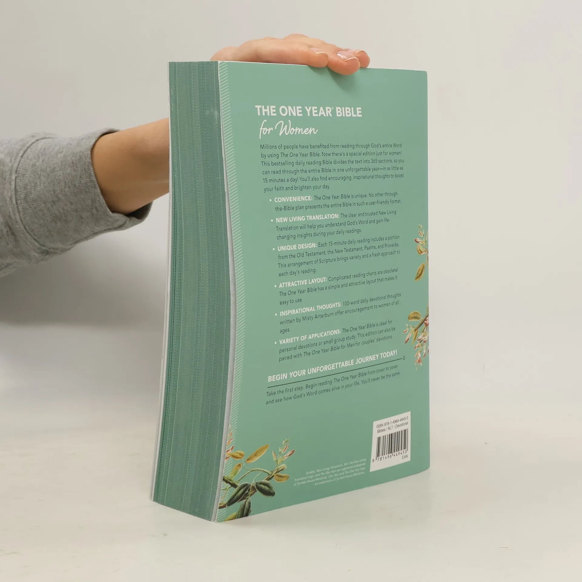 Read through the Bible in one year in as little as 15 minutes a day. The One Year Bible for Women combines the bestselling daily Bible reading format with two-minute daily devotionals written just for women to create a one-of-a-kind devotional Bible that women of all ages will love. This Bible in the bestselling One Year collection is designed specifically for women. This beautifully designed women's devotional Bible features the clear and trusted New Living Translation. Women can follow along each day through the designated readings and finish the entire Bible in one year in as little as 15 minutes a day. Key Features: Daily readings from the Old Testament, New Testament, Psalms, and Proverbs 100-word daily devotional thoughts written by Misty Arterburn The clear and trusted New Living Translation (NLT) Makes a great gift for couples or individuals! The One Year Bible for Women can be paired with the One Year Bible for Men, making these Bibles a great resource for couples' devotional experiences.