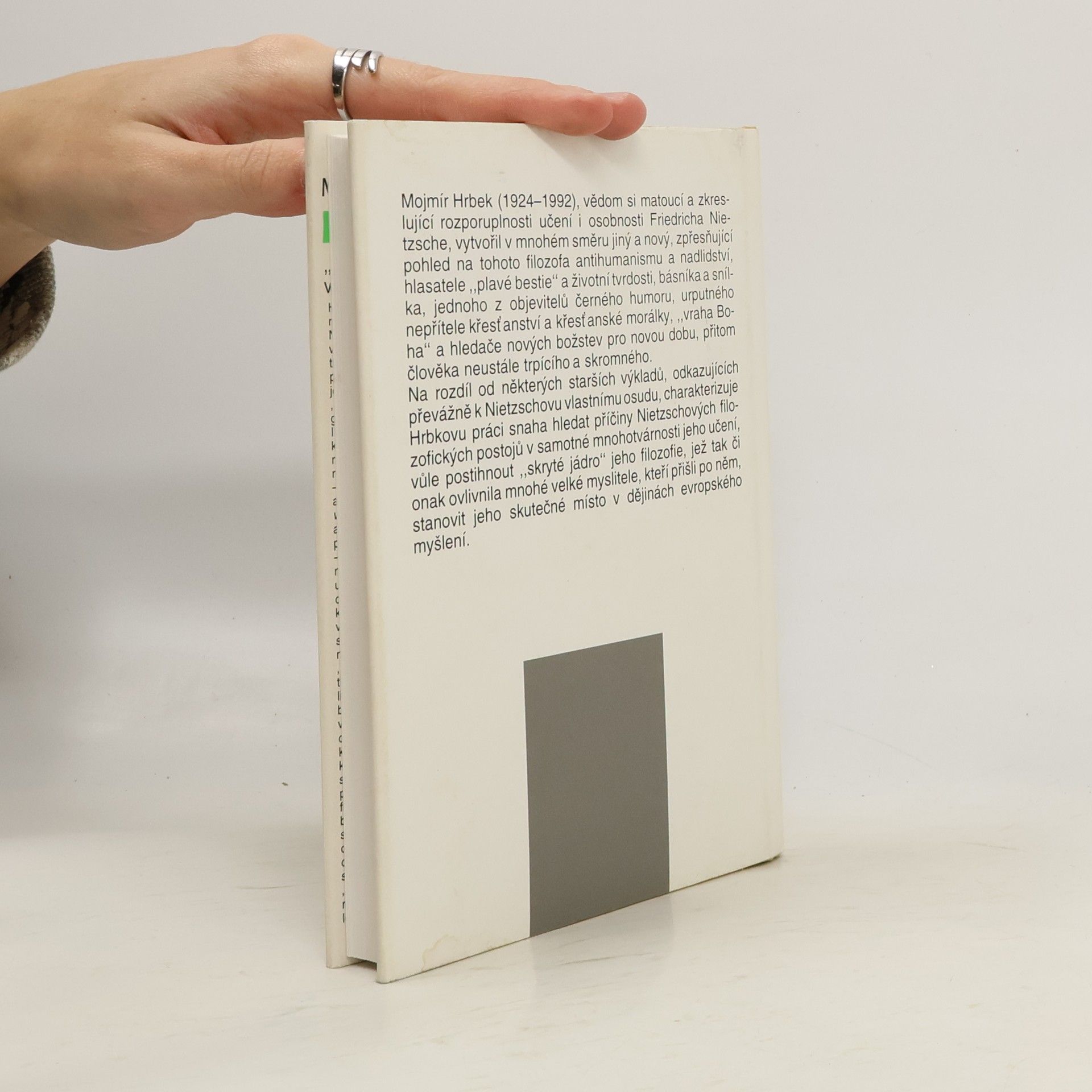 M. Hrbek (1924-1992), vědom si matoucí a zkreslující rozporuplnosti učení i osobnosti Friedricha Nietzsche, vytvořil v mnohém směru jiný a nový, zpřesňující pohled na tohoto filozofa antihumanismu a nadlidství, hlasatele "plavé bestie" a životní tvrdosti, "básníka a snílka", jednoho z objevitelů černého humoru, urputného nepřítele křesťanství a křesťanské morálky, hledače nových božstev pro novou dobu, přitom člověka neustále trpícího a skromného.