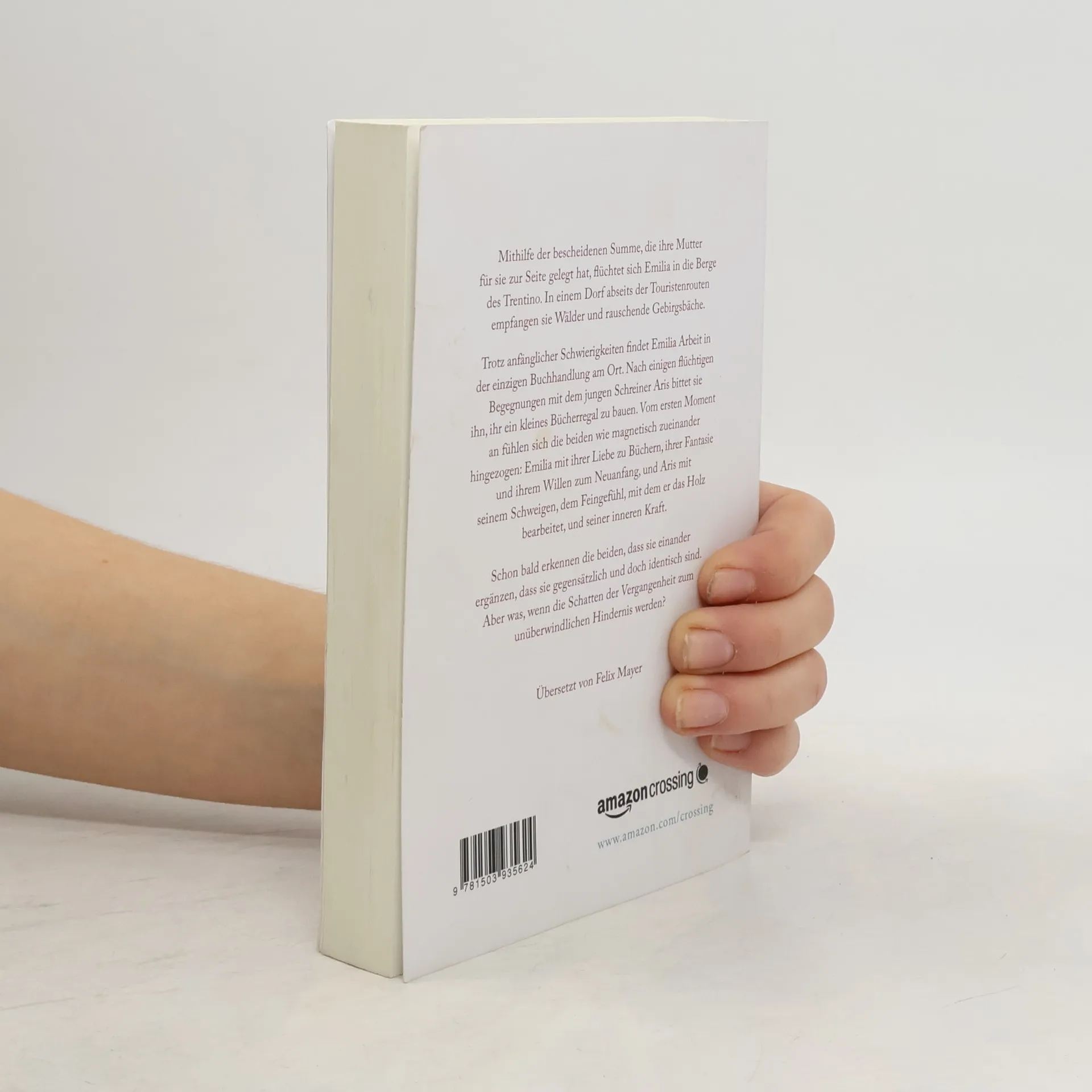 Mithilfe der bescheidenen Summe, die ihre Mutter für sie zur Seite gelegt hat, flüchtet sich Emilia in die Berge des Trentino. In einem Dorf abseits der Touristenrouten empfangen sie Wälder und rauschende Gebirgsbäche. Unbeobachtet zu bleiben ist jedoch nicht so einfach, und schon bald verfolgen sie die Bewohner mit misstrauischen Blicken. Wer ist diese junge Frau? Was verbirgt sich hinter ihren traurigen Augen? Und warum verfolgt Aris, der junge Schreiner im Dorf, sie jeden Abend bis zu ihrem Haus, unsichtbar wie ein Schatten zwischen den Bäumen? Trotz anfänglicher Schwierigkeiten findet Emilia Arbeit in der einzigen Buchhandlung am Ort. Nach einigen flüchtigen Begegnungen mit Aris bittet sie ihn, ihr ein kleines Bücherregal zu bauen. Vom ersten Moment an fühlen sich die beiden wie magnetisch zueinander Emilia mit ihrer Liebe zu Büchern, ihrer Fantasie und ihrem Willen zum Neuanfang und Aris mit seinem Schweigen, dem Feingefühl, mit dem er das Holz bearbeitet, und seiner inneren Kraft. Schon bald erkennen die beiden, dass sie einander ergänzen, dass sie gegensätzlich und doch identisch sind. Aber was, wenn die Schatten der Vergangenheit zum unüberwindlichen Hindernis werden?