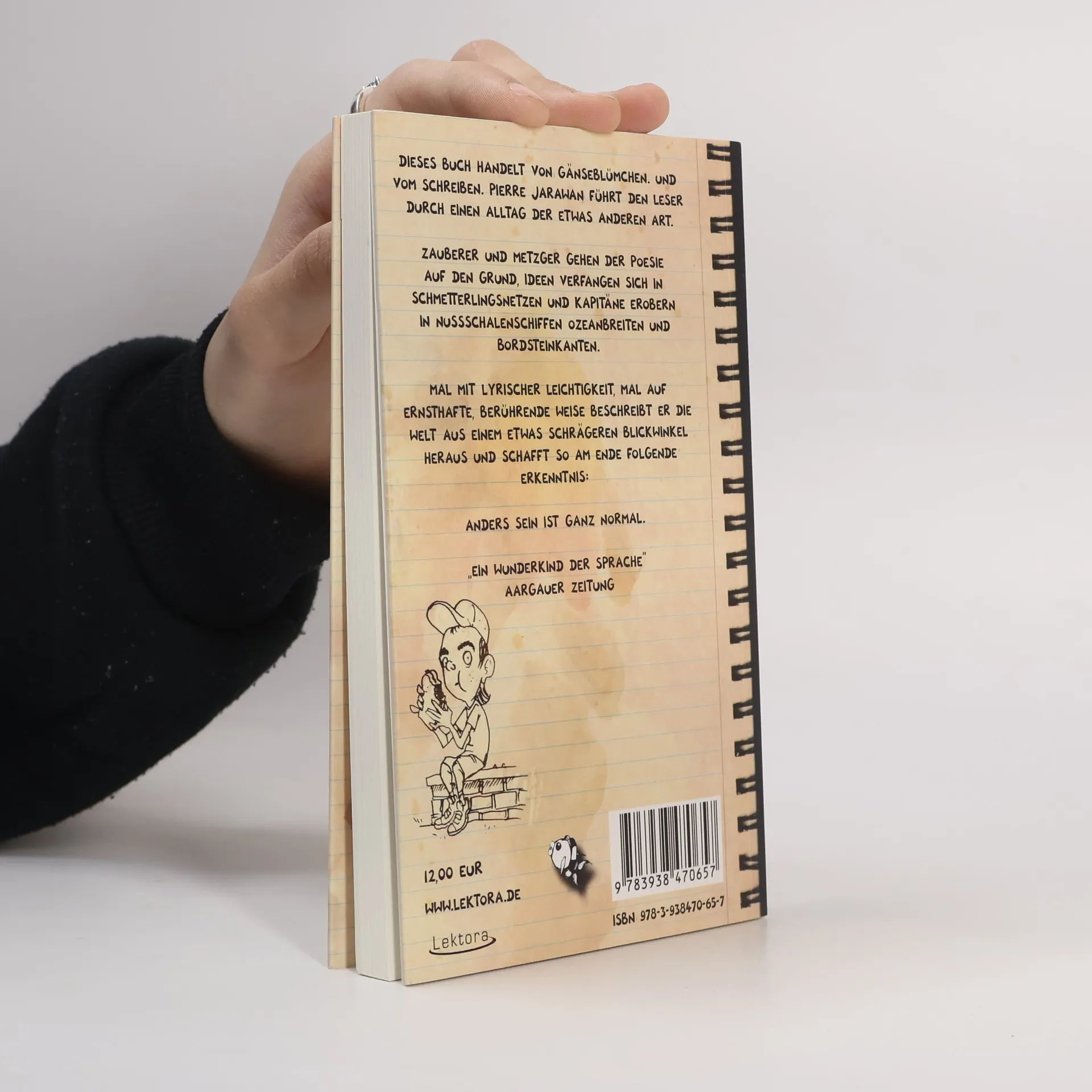 Mit seinem Buch „Anders sein ist ganz normal“ präsentiert Pierre Jarawan jetzt seine 25 besten Bühnentexte in gedruckter Form. Dieses Buch handelt von Gänseblümchen. Und vom Schreiben. Pierre Jarawan führt den Leser durch einen Alltag der etwas anderen Art. Zauberer und Metzger gehen der Poesie auf den Grund, Ideen verfangen sich in Schmetterlingsnetzen und Kapitäne erobern in Nussschalenschiffen Ozeanbreiten und Bordsteinkanten. Mal mit lyrischer Leichtigkeit, mal auf ernsthafte, berührende Weise beschreibt er die Welt aus einem etwas schrägeren Blickwinkel heraus und schafft so am Ende folgende Erkenntnis: Anders sein ist ganz normal.