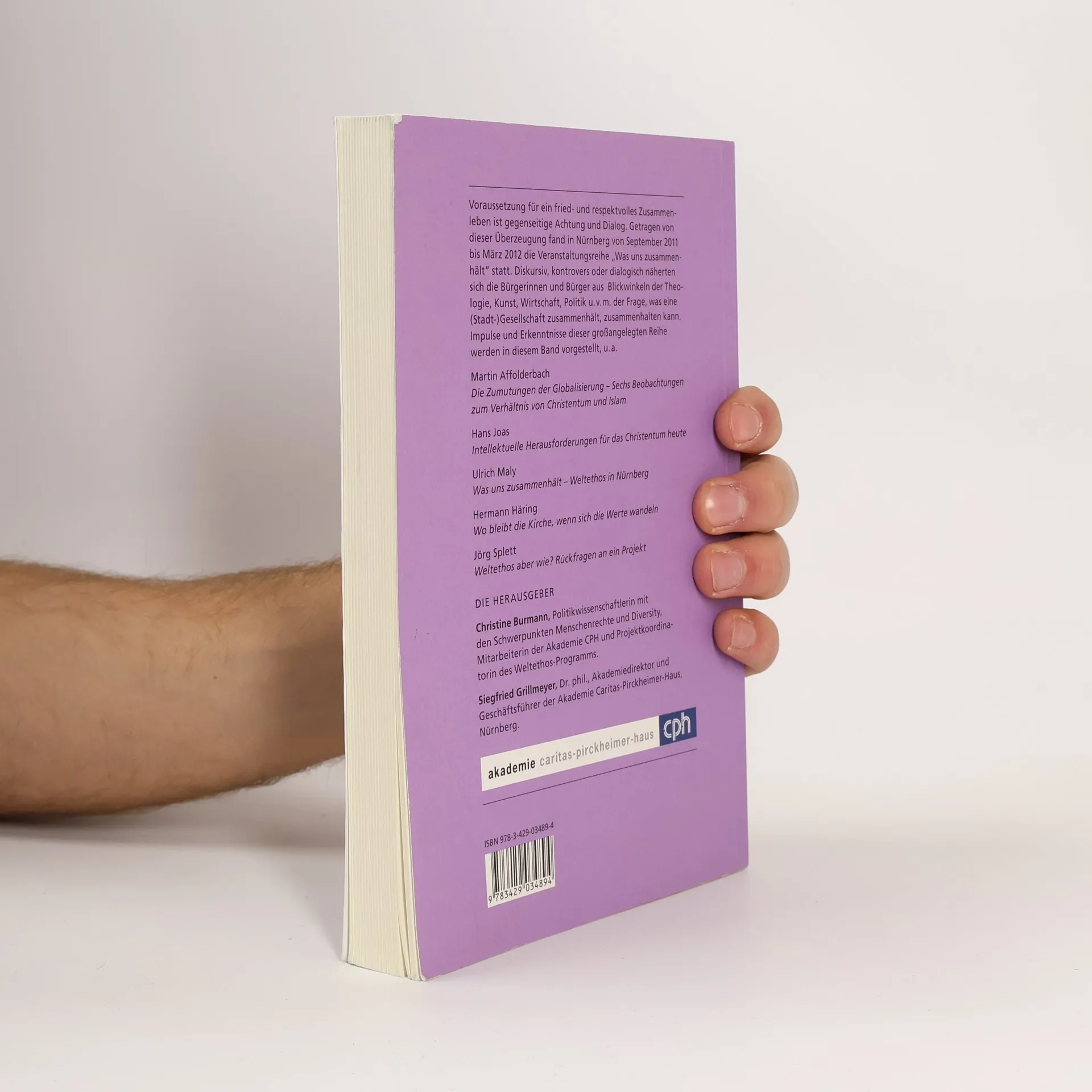 Voraussetzung für ein fried- und respektvolles Zusammenleben ist gegenseitige Achtung und Dialog. Getragen von dieser Überzeugung fand in Nürnberg von September 2011 bis März 2012 die Veranstaltungsreihe „Was uns zusammenhält“ statt. Diskursiv, kontrovers oder dialogisch näherten sich die Bürgerinnen und Bürger aus Blickwinkeln der Theologie, Kunst, Wirtschaft, Politik u. v. m. der Frage, was eine (Stadt-)Gesellschaft zusammenhält, zusammenhalten kann. Impulse und Erkenntnisse dieser großangelegten Reihe werden in diesem Band vorgestellt, u. a. Martin Affolderbach, Die Zumutungen der Globalisierung – Sechs Beobachtungen zum Verhältnis von Christentum und Islam Hans Joas, Intellektuelle Herausforderungen für das Christentum heute Ulrich Maly, Was uns zusammenhält – Weltethos in Nürnberg Hermann Häring, Wo bleibt die Kirche, wenn sich die Werte wandeln Jörg Splett, Weltethos aber wie? Rückfragen an ein Projekt