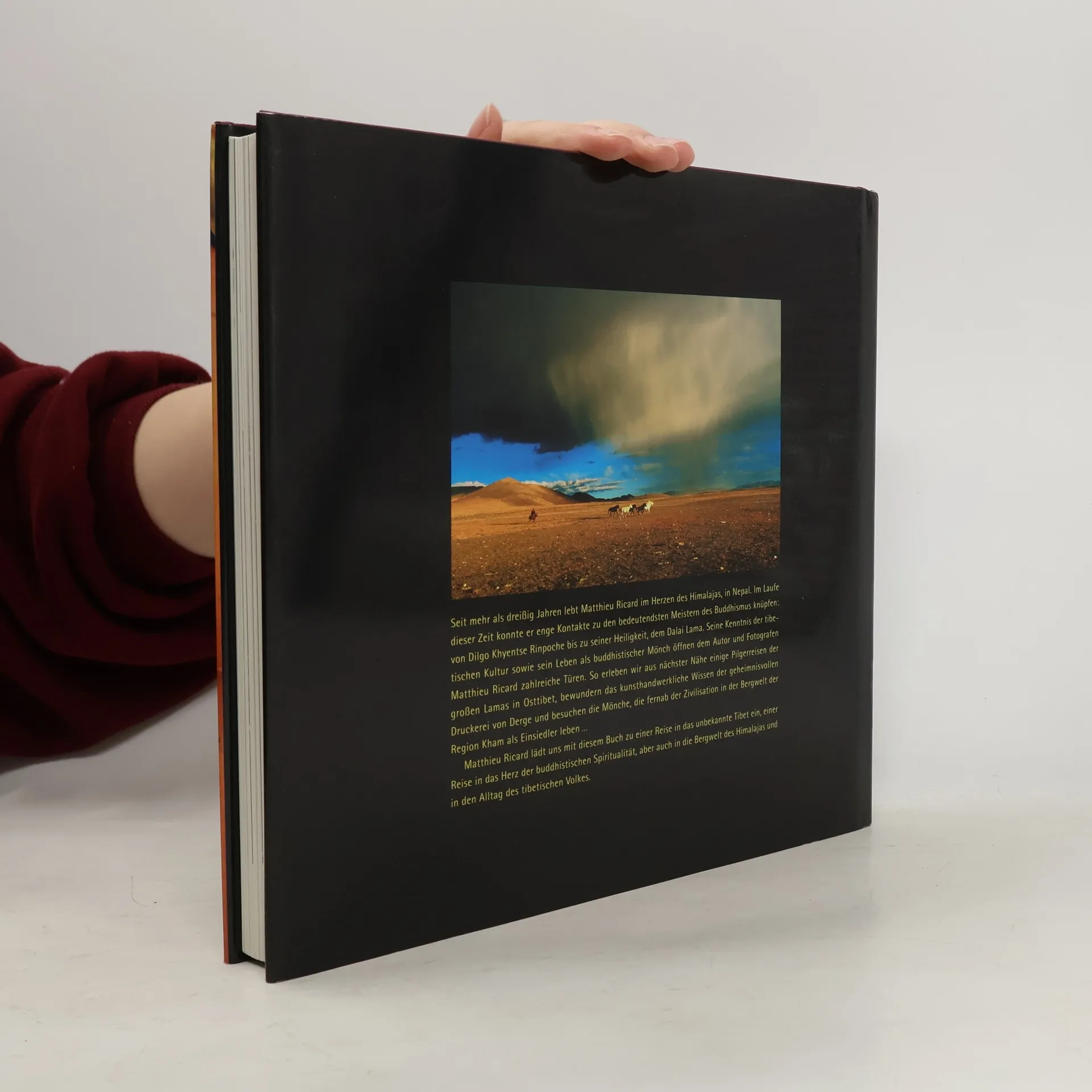 Allem Dasein auf Erden soll Liebe und Mitgefühl entgegengebracht werden. Dieser Glaubensgrundsatz ist in der tibetischen Kultur allgegenwärtig. Wie tief der Glaube mit dem Leben in Tibet verwoben ist, zeigt kaum ein anderer so eindringlich und überzeugend wie Matthieu Ricard. Seit mehr als 30 Jahren lebt der Franzose als Mönch klösterlich zurückgezogen im Himalaja. Hier findet er die Motive für sein künstlerisches Talent. Matthieu Ricard fotografiert mit Vorliebe spirituelle Meister, das Leben im Kloster, die Kunst und die Landschaften Tibets. Seine in diesem Band versammelten Bilder spiegeln die Spiritualität der Tibeter in berührender Form wider: Offen und warmherzig lachen betagte Einsiedlermönche nach Jahren der Weltabgeschiedenheit in die Kamera, in demütiger Erwartung harren Gläubige der Ankunft ihres spirituellen Meisters in den Bergen, friedlich und ausgelassen feiern tausende Nomaden ein großes Fest zu Ehren ihres Helden Gesar von Ling, mit Hingabe werden in der Druckerei von Derge in alter kunsthandwerklicher Tradition die Schriftzeichen heiliger Texte in Holzblöcke geschnitzt, die Tinte und das Papier zum Druck hergestellt. Ob im Alltag oder in religiöser Kontemplation versunken, das tibetische Volk strahlt eine Würde aus, die sich in der majestätischen Landschaft der Hochebene Tibets wiederfinden lässt. Eine stille Hommage an das Land im Herzen des Himalajas, an seine Bewohner und deren kulturellen Reichtum.