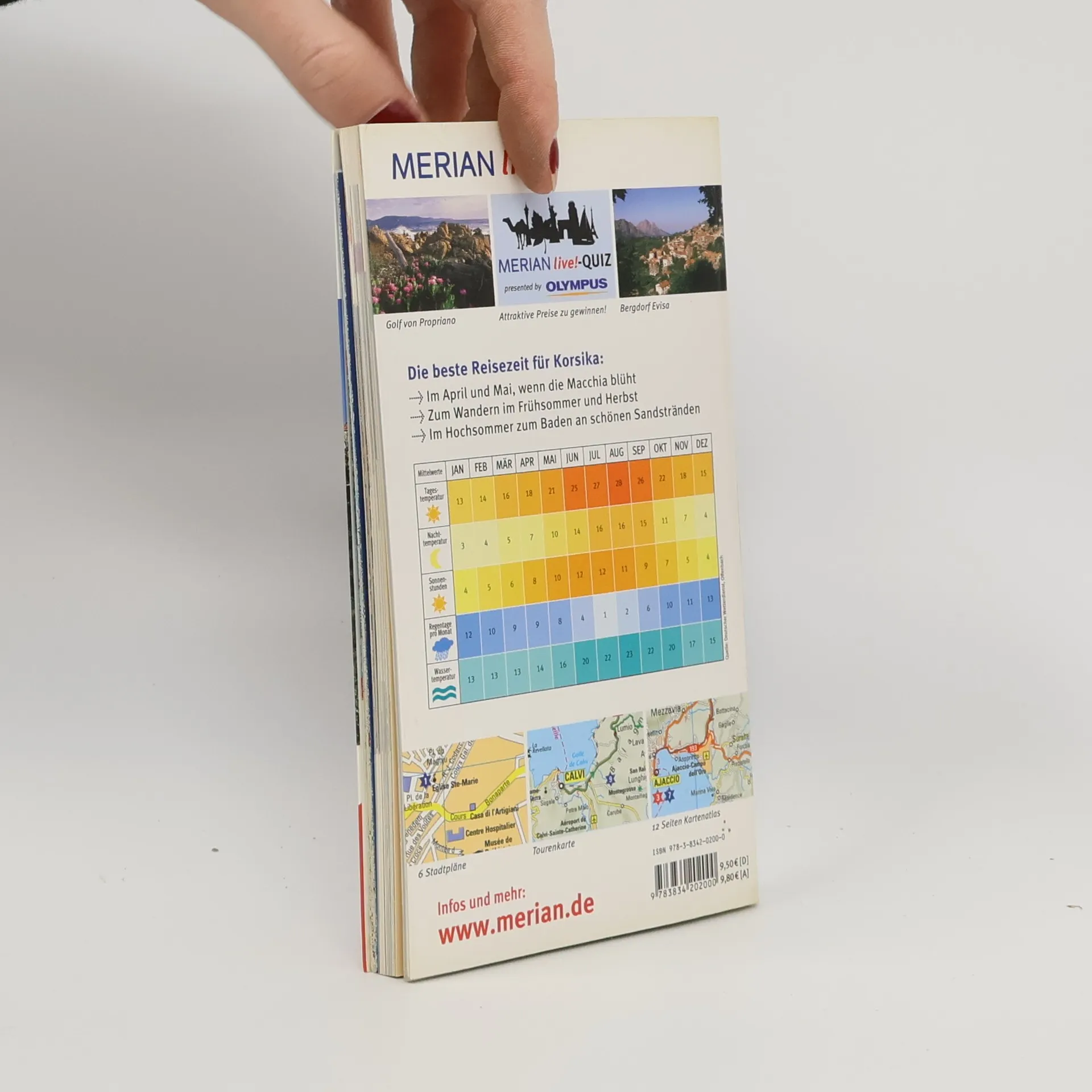 Mehrfach ausgezeichnet als bester Kompakt-Reiseführer: 1. Platz ITB BuchAward! Jetzt neu mit herausnehmbarer Straßenkarte zusätzlich zum Kartenatlas. Ebenfalls neu: das MERIAN-Quiz. Gewinnen Sie Monat für Monat attraktive Preise. Der Korse Napoleon begann einst von der entlegenen Mittelmeerinsel aus seinen Siegeszug durch Europa. Heute kommen in seiner Heimat Sportler, Naturfreunde, Historiker oder Feinschmecker auf ihre Kosten. Das Meer ist nie weit: Malerische Felsstraßen schlängeln sich an den Küsten entlang, schmale Sandbuchten, von Pinien umgeben, locken zum Baden. Uralte Megalithen stehen in Reih und Glied. Kolossale, im Winter schwer zugängliche Felsmassive bilden eine Art Grenze zwischen dem Nordosten und dem Südwesten der Insel - eine natürliche Teilung, die vor der Eroberung durch französische Truppen auch eine historische war. Korsika will entdeckt werden, ist viel zu abwechslungsreich für den reinen Badeurlaub. Nicht nur die geografische Dualität und die bewegte Vergangenheit der mediterranen Insel bieten reizvolle Angebote für Urlauber. Der MERIAN live! Korsika führt durch romantische Berg- und Küstenregionen, zeigt die schönsten Sehenswürdigkeiten in Bastia und der Hauptstadt Ajaccio und berichtet von den köstlichsten kulinarischen Spezialitäten. Dazu gibt es Tipps und Empfehlungen von A bis Z zum Übernachten, Bummeln, Ausgehen, Einkaufen, Essen und Trinken. Mit dem Essdolmetscher findet man sich auf der Speise- und Weinkarte leicht zurecht. Ca. 60 Farbfotos, 12 Seiten Kartenatlas, 2 Übersichtskarten, 6 Stadtpläne, Sprachführer und Essdolmetscher sowie MERIAN-TopTen und MERIAN-Tipps. MERIAN-Spezial-Thema: Nostalgie im TGV-Zeitalter - Mit der Inselbahn Micheline auf Entdeckungstour