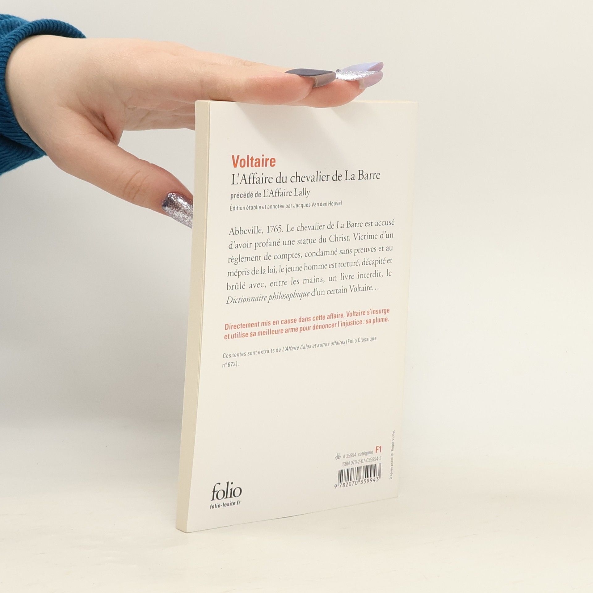 Abbeville, 1765. Le chevalier de La Barre est accusé d'avoir profané une statue du Christ. Victime d'un règlement de comptes, condamné sans preuves et au mépris de la loi, le jeune homme est torturé, décapité et brûlé avec, entre les mains, un livre interdit, le Dictionnaire philosophique d'un certain Voltaire…Directement mis en cause dans cette affaire, Voltaire s'insurge et utilise sa meilleure arme pour dénoncer l'injustice : sa plume.