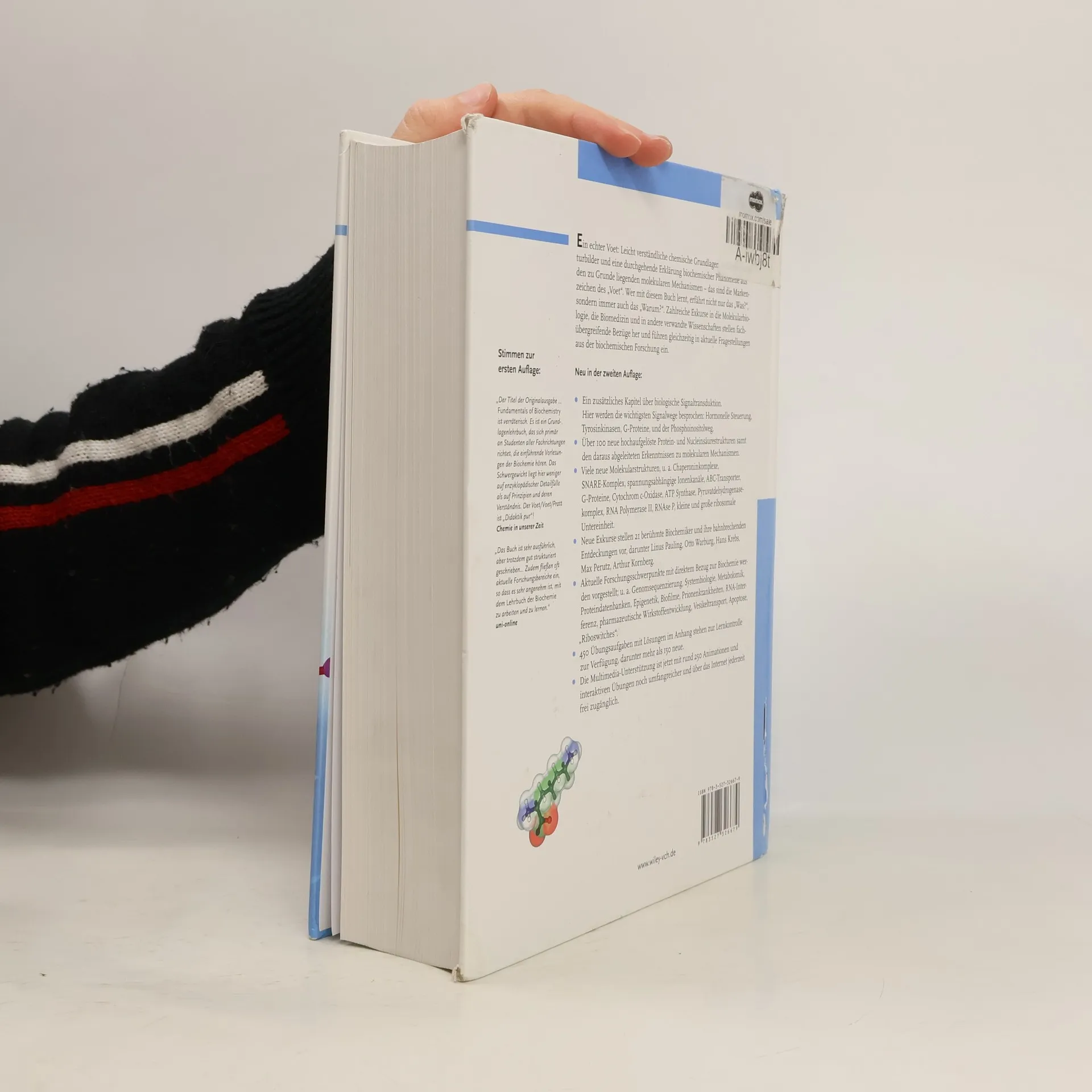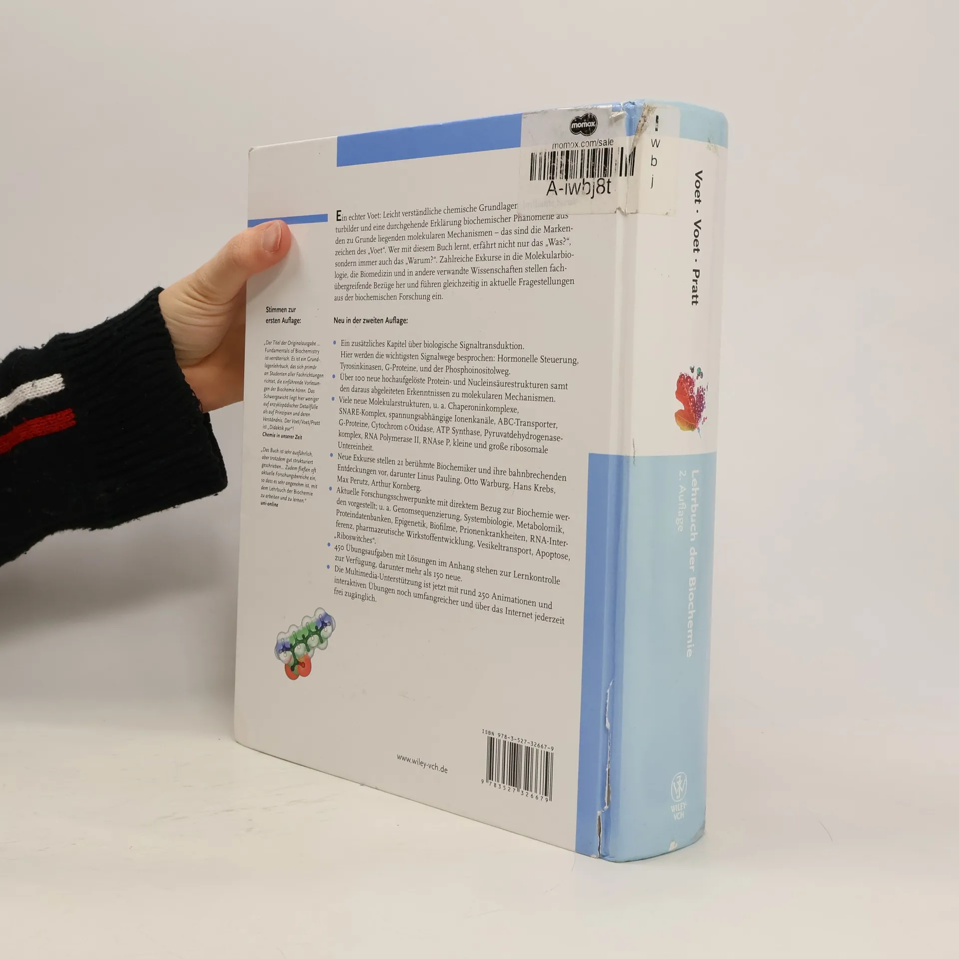 Ein echter Leicht verständliche chemische Grundlagen, brillante Strukturbilder und eine durchgehende Erklärung biochemischer Phänomene aus den zu Grunde liegenden molekularen Mechanismen - das sind die Markenzeichen des "Voet". Wer mit diesem Buch lernt,erfährt nicht nur das "Was?", sondern immer auch das "Warum?". Zahlreiche Exkurse in die Molekularbiologie, die Biomedizin und in andere verwandte Wissenschaften stellen fachübergreifende Bezüge her und führen gleichzeitig in aktuelle Fragestellungen aus der biochemischen Forschung ein.Neu in der zweiten Ein zusätzliches Kapitel über biologische Signaltransduktion. Hier werden die wichtigsten Signalwege Hormonelle Steuerung, Tyrosinkinasen, G-Proteine, und der Phosphoinositolweg.Über 100 neue hochaufgelöste Protein- und Nucleinsäurestrukturen samt den daraus abgeleiteten Erkenntnissen zu molekularen Mechanismen.Viele neue Molekularstrukturen, u. a. Chaperoninkomplexe,SNARE-Komplex, spannungsabhängige Ionenkanäle, ABC-Transporter, G-Proteine, Cytochrom c-Oxidase, ATP Synthase, Pyruvatdehydrogenasekomplex, RNA Polymerase II, RNAse P, kleine und große ribosomale Untereinheit.Neue Exkurse stellen 21 berühmte Biochemiker und ihre bahnbrechenden Entdeckungen vor, darunter Linus Pauling, Otto Warburg, Hans Krebs, Max Perutz, Arthur Kornberg.Aktuelle Forschungsschwerpunkte mit direktem Bezug zur Biochemie werden vorgestellt; u. a. Genomsequenzierung, Systembiologie, Metabolomik, Proteindatenbanken, Epigenetik, Biofi lme, Prionenkrankheiten, RNA-Interferenz, pharmazeutische Wirkstoffentwicklung, Vesikeltransport, Apoptose, "Riboswitches".450 Übungsaufgaben mit Lösungen im Anhang stehen zur Lernkontrolle zur Verfügung, darunter mehr als 150 neue.Die Multimedia-Unterstützung ist jetzt mit rund 250 Animationen und interaktiven Übungen noch umfangreicher und über das Internet jederzeit frei zugänglich.Stimmen zur ersten "Der Titel der Originalausgabe ... Fundamentals of Biochemistry ist verräterisch. Es ist ein Grundlagenlehrbuch, das sich primär an Studenten aller Fachrichtungen richtet, die einführende Vorlesungen der Biochemie hören. Das Schwergewicht liegt hier weniger auf enzyklopädischer Detailfülle als auf Prinzipien und deren Verständnis. Der Voet/Voet/Pratt ist "Didaktik pur"!Chemie in unserer Zeit"Das Buch ist sehr ausführlich, aber trotzdem gut strukturiert geschrieben... Zudem fließen oft aktuelleForschungsbereiche ein, so dass es sehr angenehm ist mit dem Lehrbuch der Biochemie zu arbeiten und zu lernen."uni-online