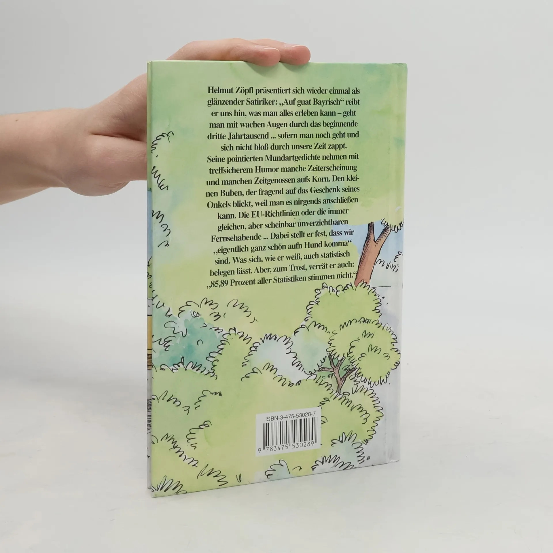 In diesem neuen Titel präsentiert sich Helmut Zöpfl wieder einmal als glänzender "Auf guat Bayrisch" reibt er uns hin, was man alles erleben kann – geht man mit wachen Augen durch das beginnende dritte Jahrtausend ... Sofern man noch geht und sich nicht bloß durch die Zeit zappt! Jedenfalls nimmt er in seinen pointierten Mundartgedichten mit treffsicherem Humor manche Zeiterscheinung und manchen Zeitgenossen aufs Den kleinen Jungen, der fragend auf das Geschenk seines Onkel blickt, weil man es nirgends anschließen kann. die EU-Richtlinien oder die immer gleichen, aber scheinbar unverzichtbaren Fernsehabende ... Helmut Zöpfl stellt fest, dass wir "eigentlich ganz schön aufn Hund komma" sind. was sich, wie er weiß, auch statistisch belegen lässt. Aber – zum Trost – verrät er "85,89 Prozent aller Statistiken stimmen nicht."