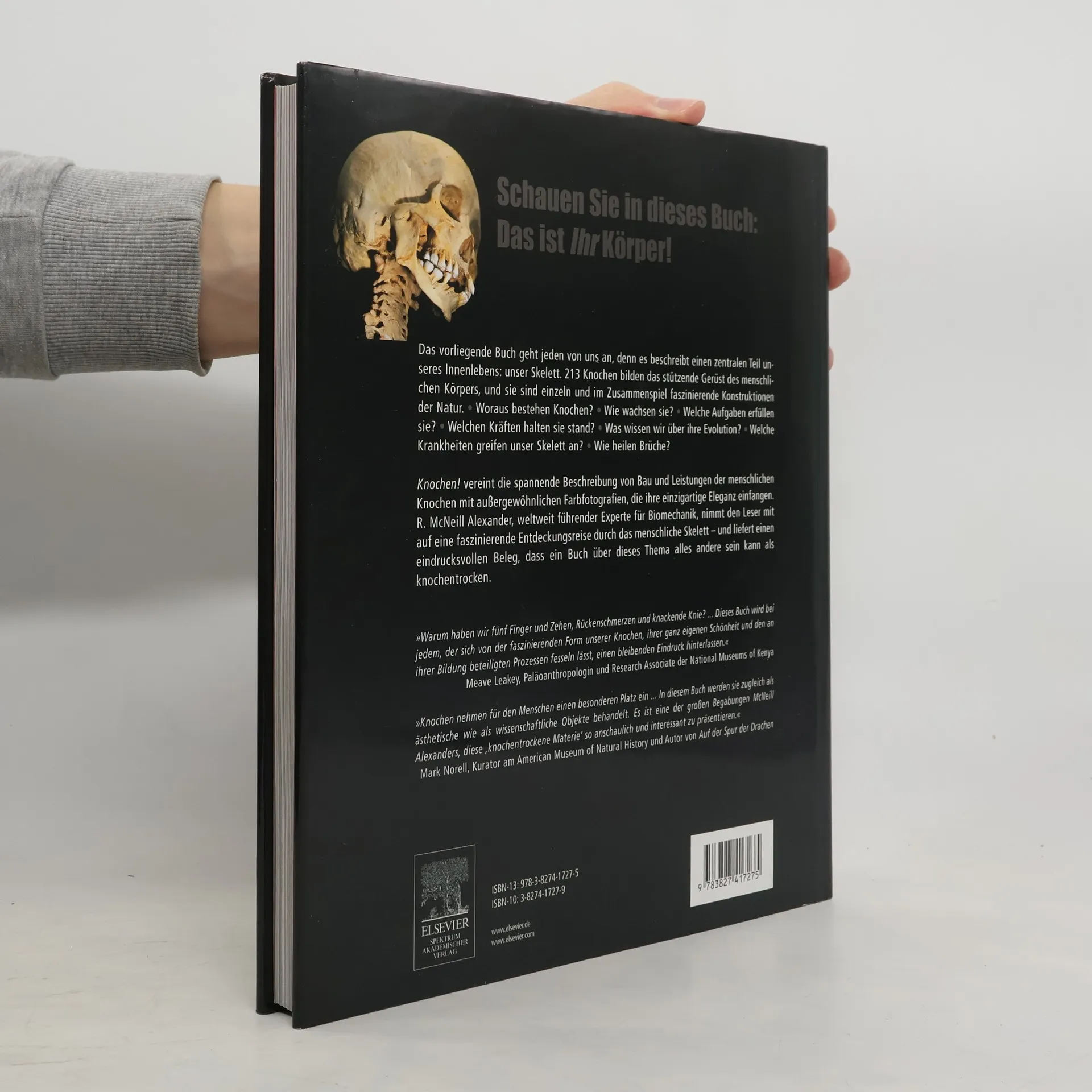 Knochen! vereint die faszinierende Beschreibung von Bau und Funktion der menschlichen Knochen mit wunderschönen Farbfotografien, die ihre einzigartige Eleganz einfangen. R. McNeill Alexander, führender Experte für Biomechanik, nimmt den Leser mit auf eine Reise durch das menschliche Skelett mit seinen 213 Knochen. Das informative Werk zeigt die Natur der menschlichen Knochen und ihre Beziehung zu anderen Körperteilen. Zunächst verdeutlicht der Autor, dass Knochen lebendige Organe sind: Sie wachsen, nehmen Schaden und verheilen wie andere Organe. Er erläutert die Form und Funktion der zahlreichen Knochen von Schädel, Gliedmaßen und Rumpf. Themen wie der Bewegungsradius der Armknochen in Verbindung mit Rumpf und Schulter sowie die Beziehung zwischen Nasen- und Mundhöhle werden behandelt. Interaktive Experimente ermöglichen es dem Leser, seinen eigenen Körper zu erkunden und bieten überraschende Einsichten. Alexander geht auch auf die Unterschiede der Knochen verschiedener Menschen ein, was für Forensiker und Archäologen von Bedeutung ist. Dieses Wissen unterstützt Künstler bei der Rekonstruktion von Gesichtern aus Schädeln und gibt Aufschluss über das Leben und die Gewohnheiten von Individuen. Zudem stellt er die Knochen in einen stammesgeschichtlichen Kontext und erklärt evolutionäre Prinzipien sowie deren Auswirkungen auf die menschlichen Knochen im Vergleich zu anderen Säugetieren.