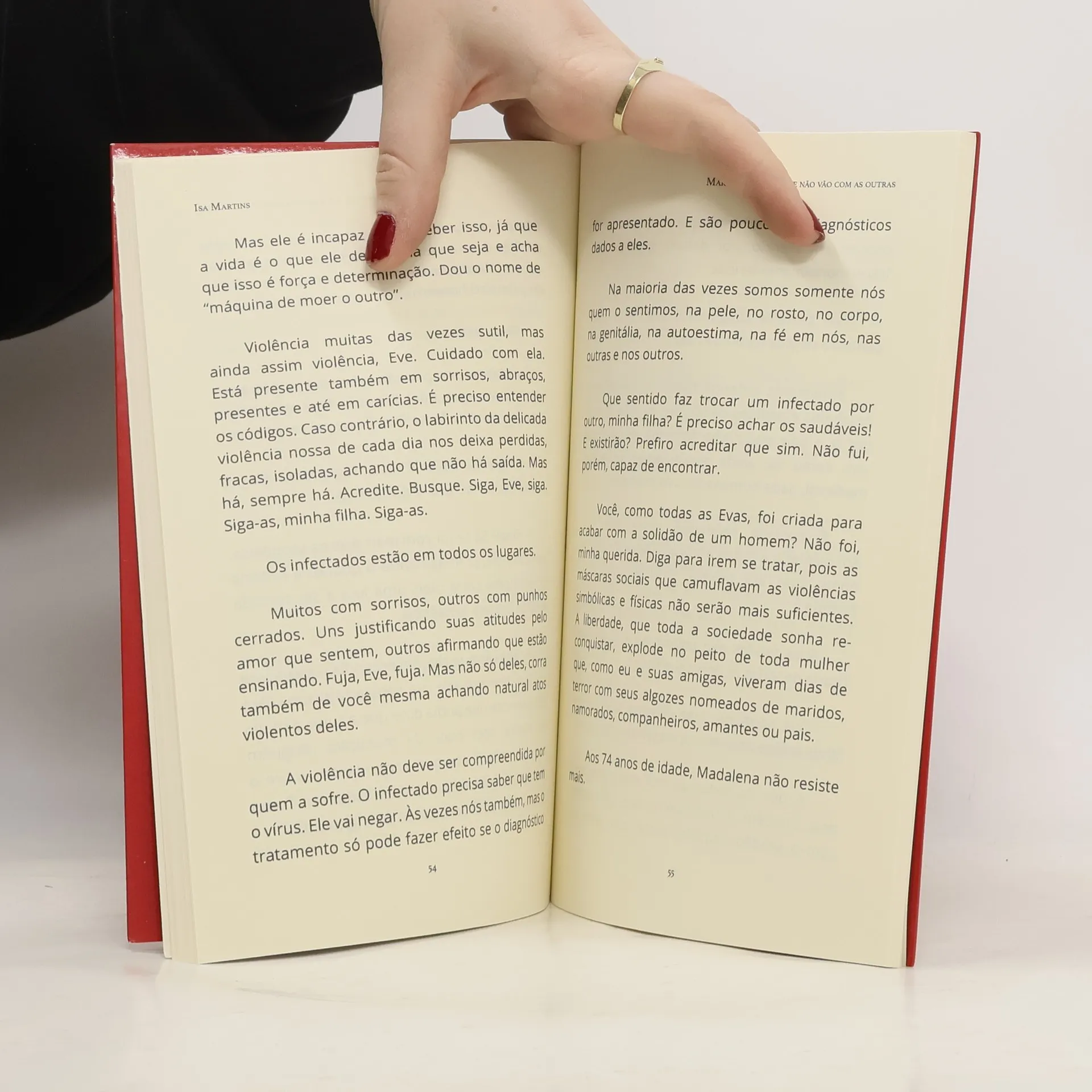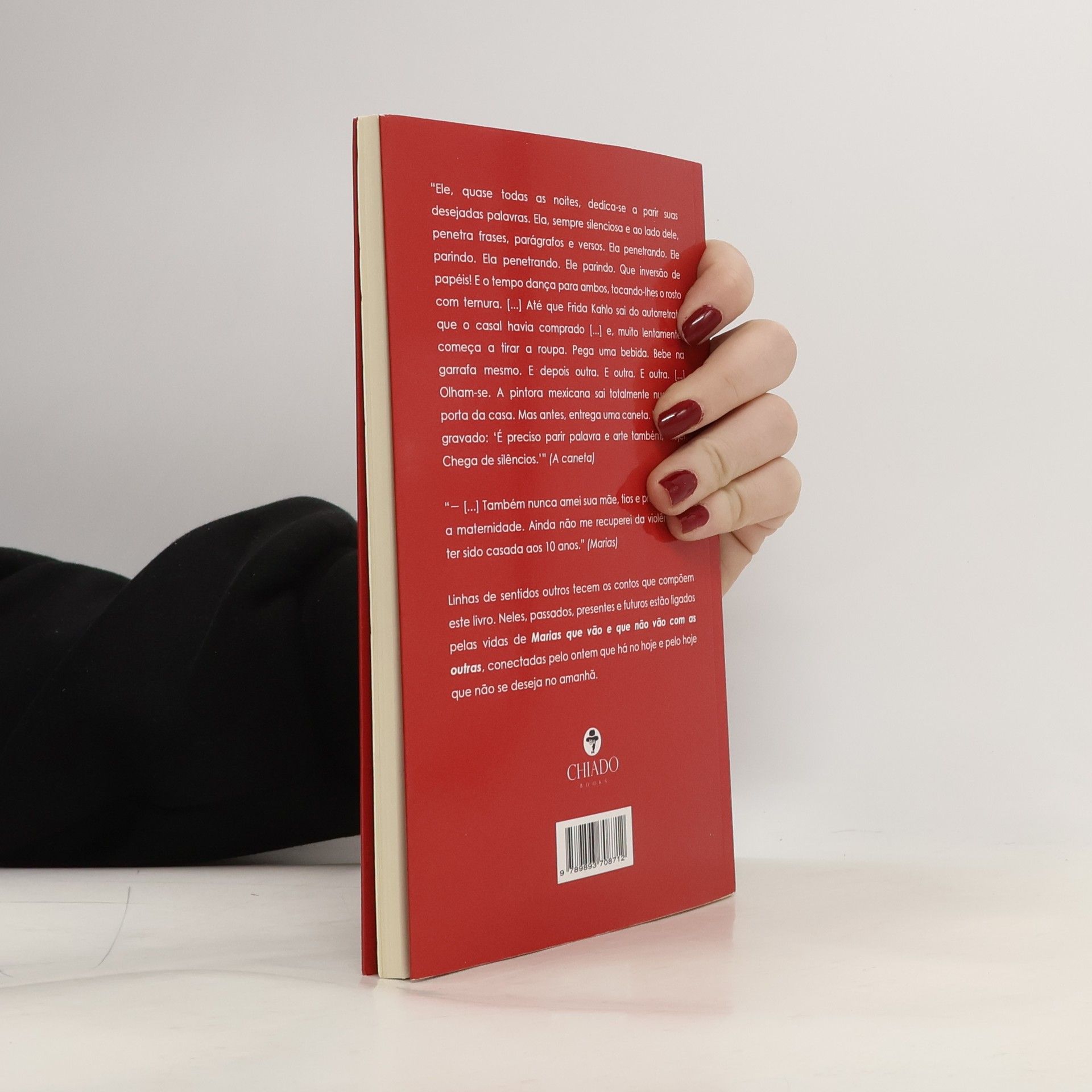 “Ele, quase todas as noites, dedica-se a parir suas desejadas palavras. Ela, sempre silenciosa e ao lado dele, penetra frases, parágrafos e versos. Ela penetrando. Ele parindo. Ela penetrando. Ele parindo. Que inversão de papéis! E o tempo dança para ambos, tocando-lhes o rosto com ternura. [...] Até que Frida Kahlo sai do autorretrato que o casal havia comprado [...] e, muito lentamente, começa a tirar a roupa. Pega uma bebida. Bebe na garrafa mesmo. E depois outra. E outra. E outra. [...] Olham-se. A pintora mexicana sai totalmente nua pela porta da casa. Mas antes, entrega uma caneta. Nela, está gravado: ‘É preciso parir palavra e arte também, Mujer. Chega de silêncios.’” (A caneta) “- [...] Também nunca amei sua mãe, tios e primos. Odeio a maternidade. Ainda não me recuperei da violência de ter sido casada aos 10 anos.” (Marias) Linhas de sentidos outros tecem os contos que compõem este livro. Neles, passados, presentes e futuros estão ligados pelas vidas de Marias que vão e que não vão com as outras, conectadas pelo ontem que há no hoje e pelo hoje que não se deseja no amanhã.