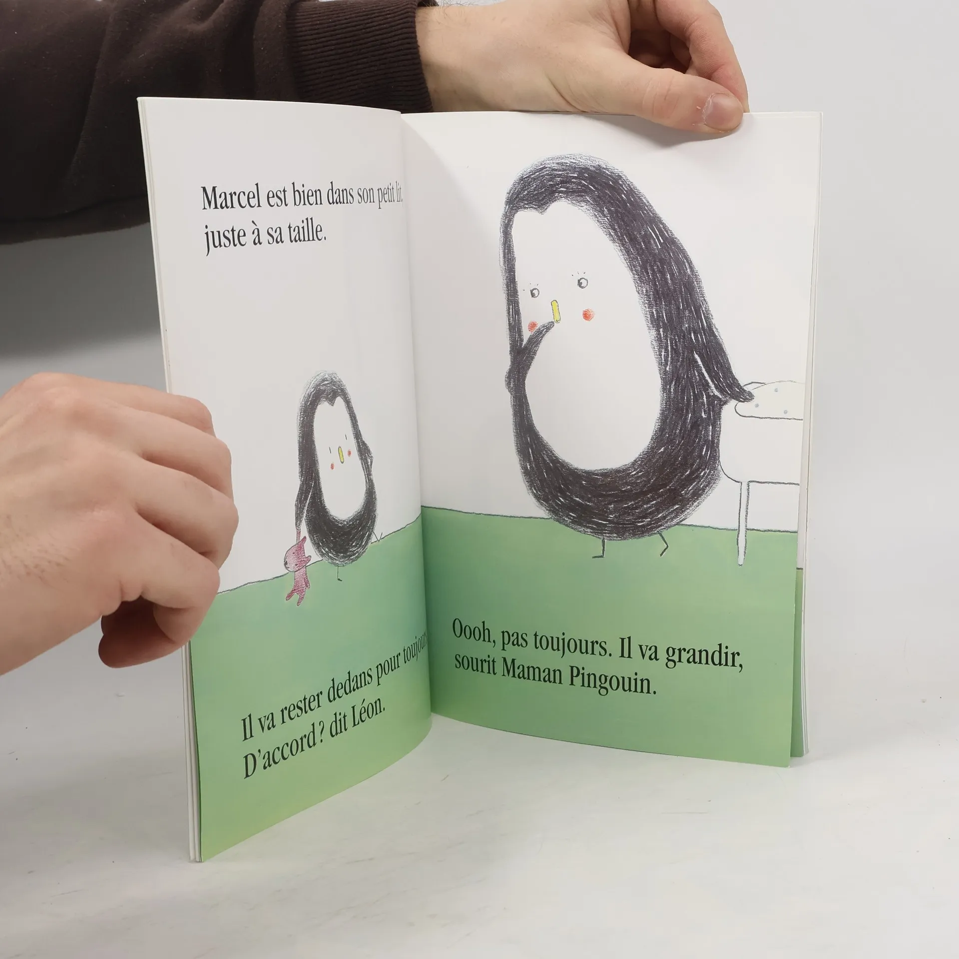 Léon vient d’être grand frère. «Marcel restera-t-il toujours dans son petit lit juste à sa taille ?» «Non, il va grandir», sourit Maman Pingouin. «Mais on va le mettre où, alors ? s’inquiète Léon. Pas dans ma chambre, c’est ma chambre à moi ! Pas sur tes genoux, ni dans tes bras qui sont bien trop grands pour un bébé pingouin...»