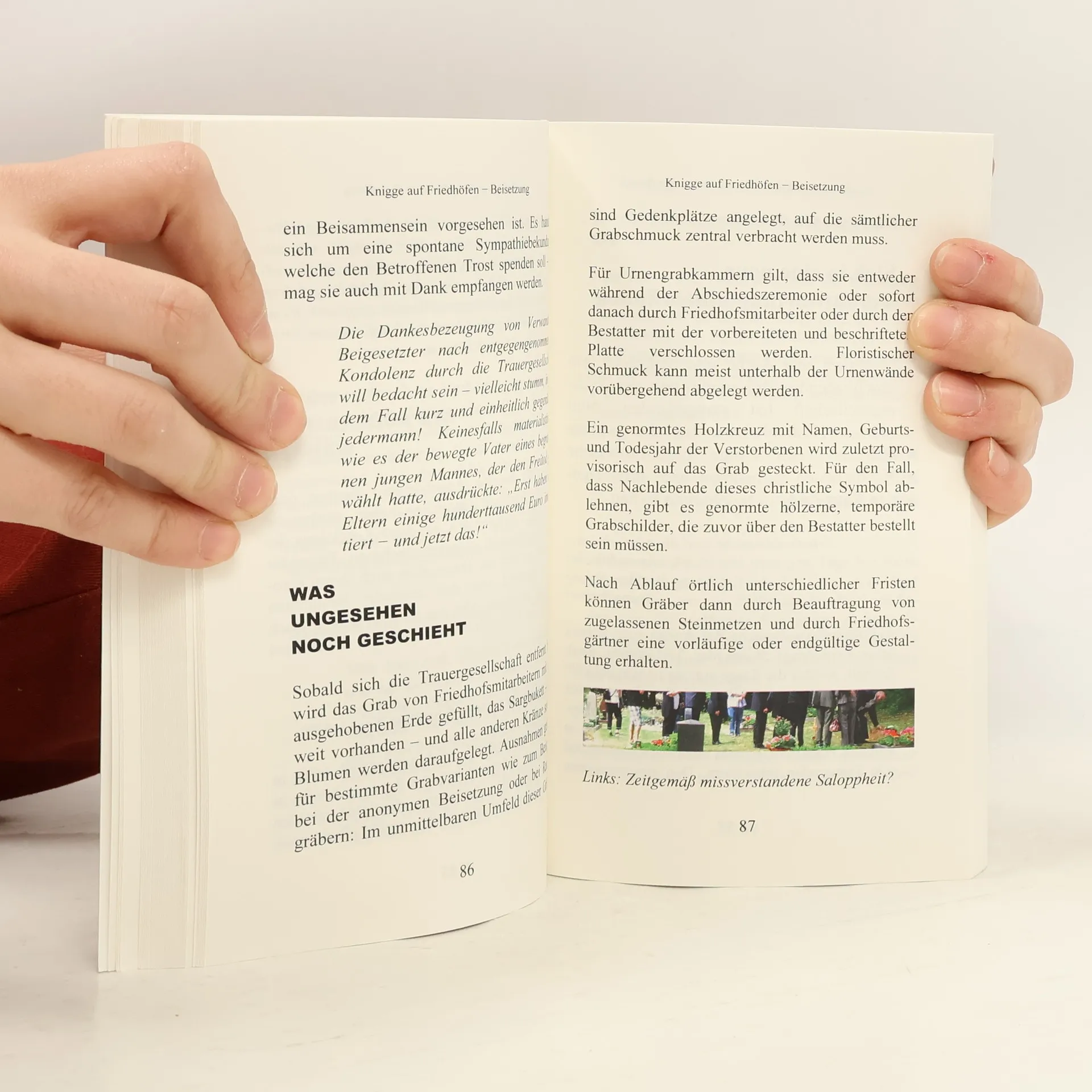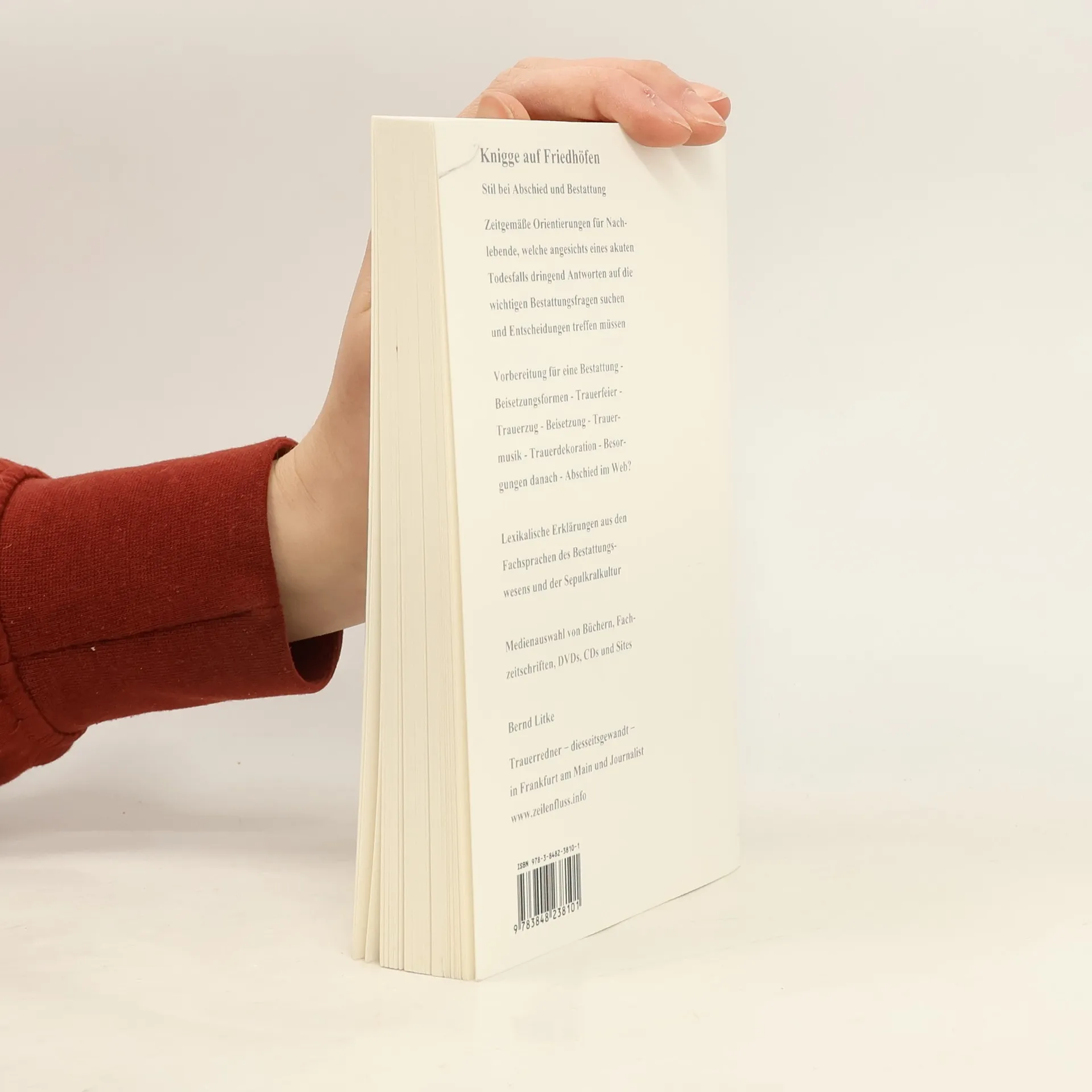 Zeitgemäße Orientierungen für Nachlebende, die angesichts eines akuten Todesfalls dringend Antworten auf die wichtigen Bestattungsfragen suchen und Entscheidungen treffen müssen. □ Kapitel: Vorbereitung für eine Bestattung - Beisetzungsformen - Trauerfeier - Trauerzug - Beisetzung - Trauermusik - Trauerdekoration - Besorgungen danach - Abschied im Web? □ Praxisbeispiele für Agenda säkularer Trauerfeiern sowie von Trauerreden □ Lexikalische Erklärungen aus den Fachsprachen des Bestattungswesens und der Sepulkralkultur □ Medienauswahl von Büchern, Fachzeitschriften, DVDs, CDs und Sites □ Checklist für die eigene Bestattungsverfügung Paperback, Umfang 204 Seiten mit Illustrationen, Verlag BoD, edition zeilenfluss Autor: Bernd Litke, Trauerredner − diesseitsgewandt − in Frankfurt am Main und Journalist ( www.zeilenfluss.info )