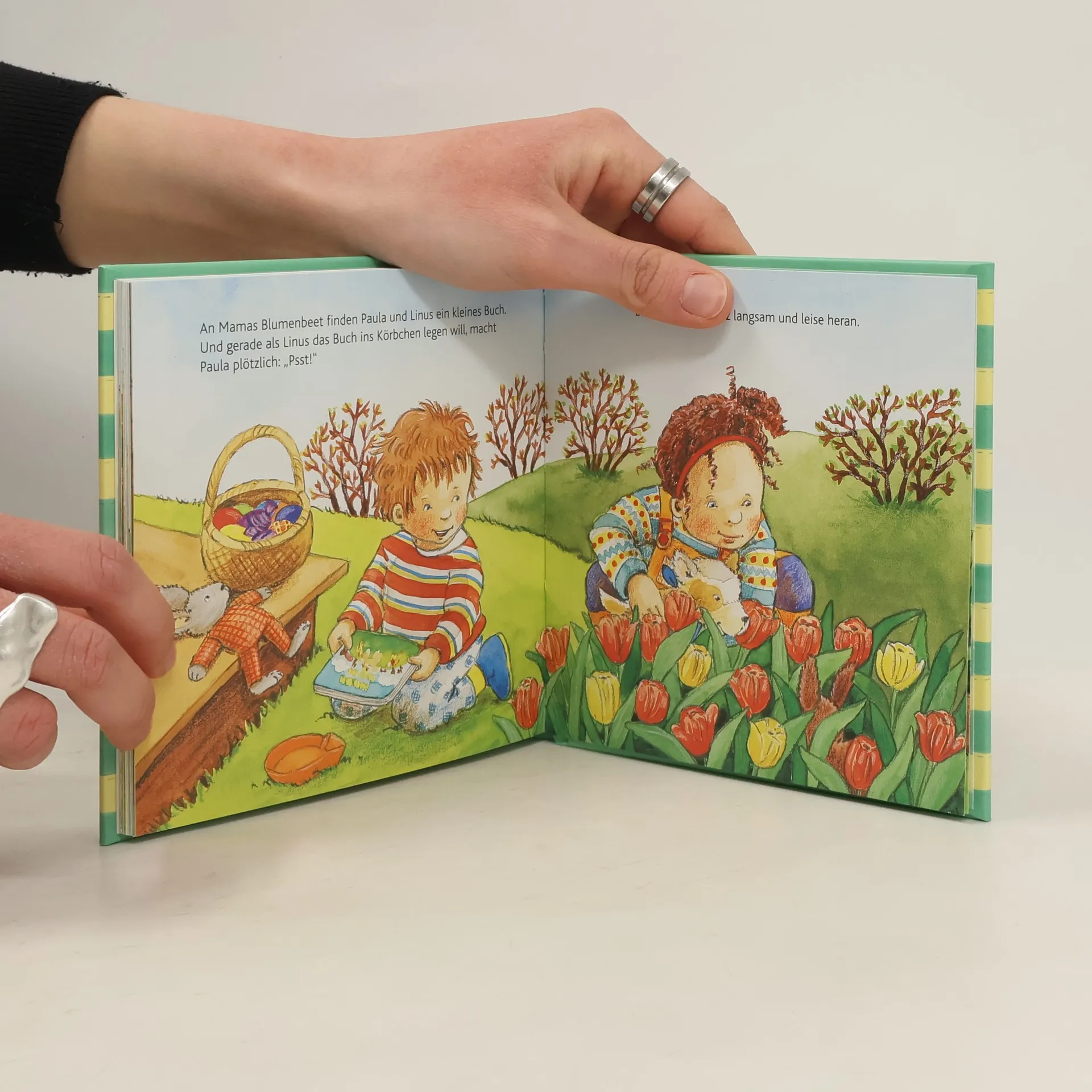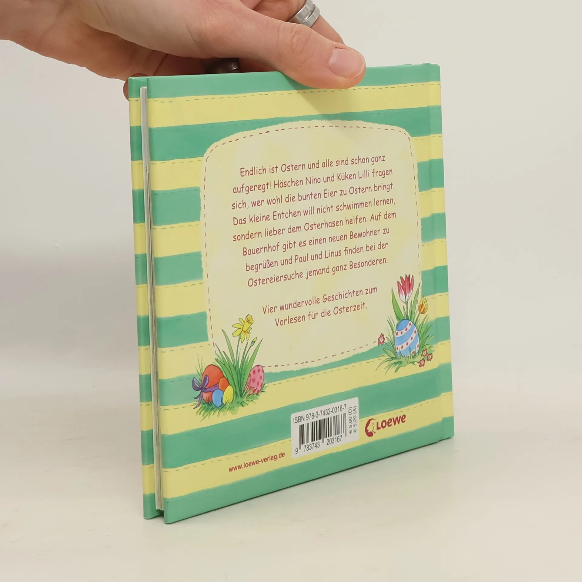 Dieses handliche Bilderbuch für Kinder ab 2 Jahren enthält vier tolle Geschichten zum Vorlesen , die zur Osterzeit die ganze Familie verzaubern. Endlich ist Ostern und alle sind schon ganz aufgeregt! Häschen Nino und Küken Lilli fragen sich, wer wohl die bunten Eier zu Ostern bringt. Das kleine Entchen will nicht schwimmen lernen, sondern lieber dem Osterhasen helfen. Auf dem Bauernhof gibt es einen neuen Bewohner zu begrüßen und Paul und Linus finden bei der Ostereiersuche jemand ganz Besonderen.